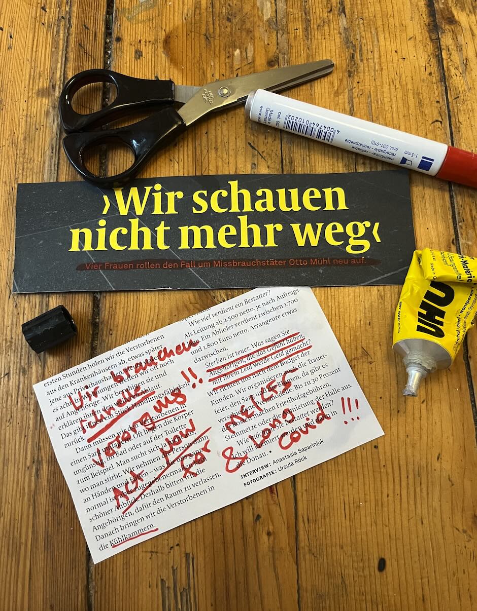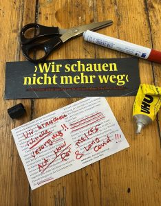 Filmemacherin Barbara Kaufmann schrieb den Text und organisierte die Veranstaltung. Gelesen wurde der Text von Barbara Kaufmann, Franziska Schwarz, Deborah Sengl und Ana Wetherall-Grujic. Die Einnahmen kamen dem Engagement