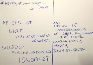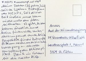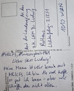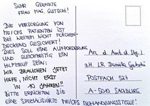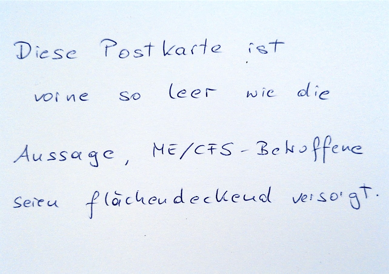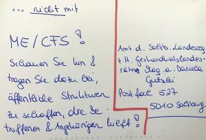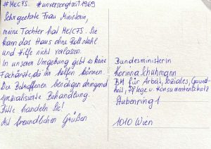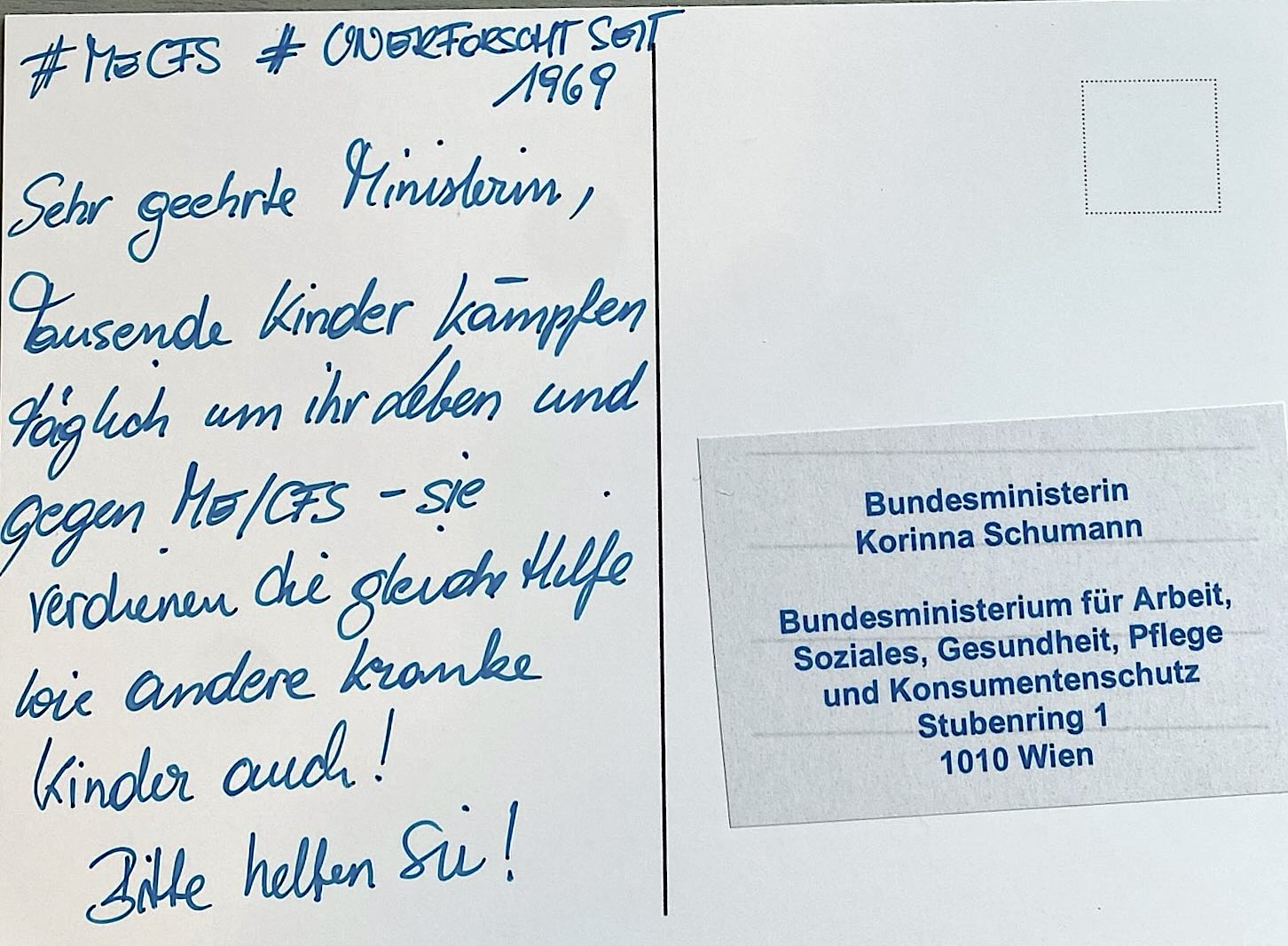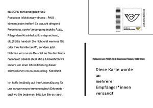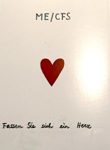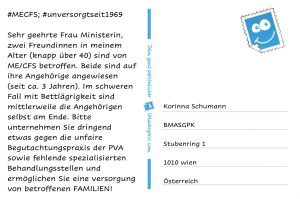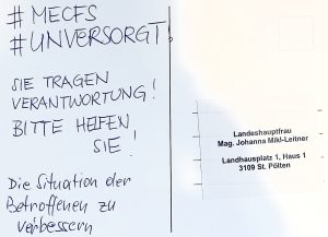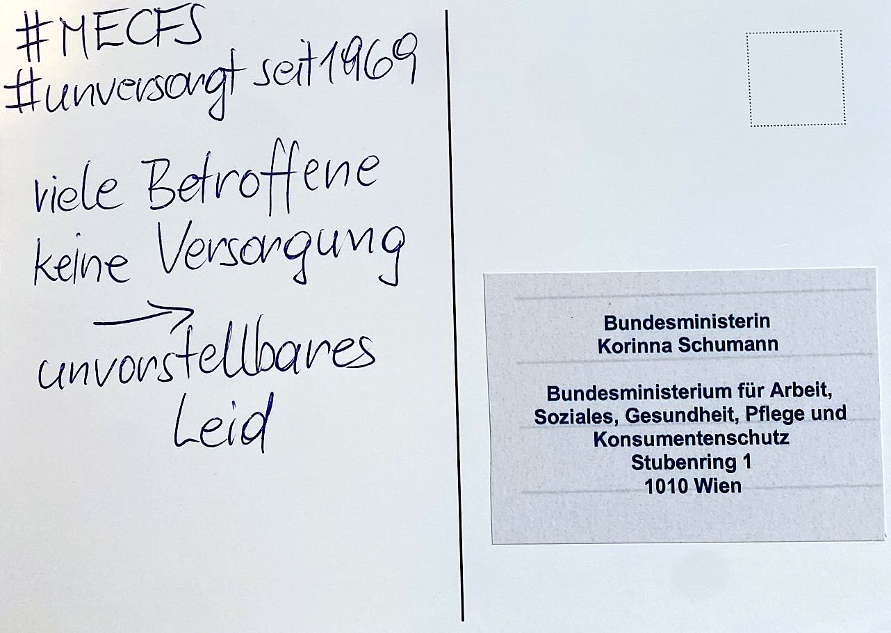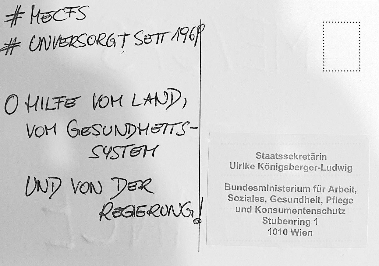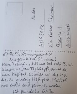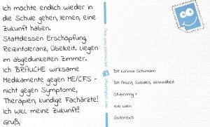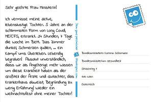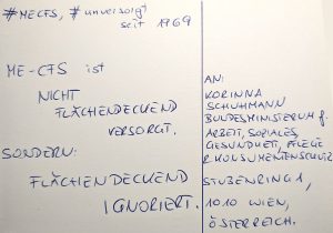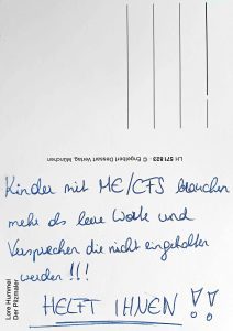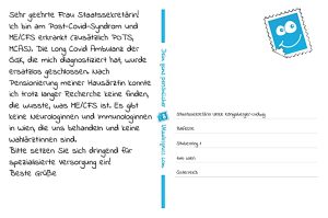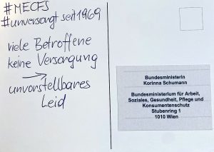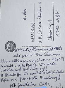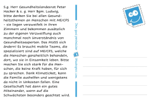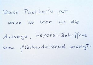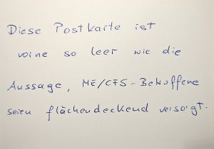 Um auf die Situation der Betroffenen – bedauerlicherweise erneut – aufmerksam zu machen, starten wir eine digitale Protestaktion in Form einer Postkartenaktion. Wir freuen uns über alle ME/CFS-Betroffene, Angehörige von Betroffenen oder nicht-Betroffene die sich an der Aktion beteiligen! Alle Infos zur Protestaktion gibt es hier.