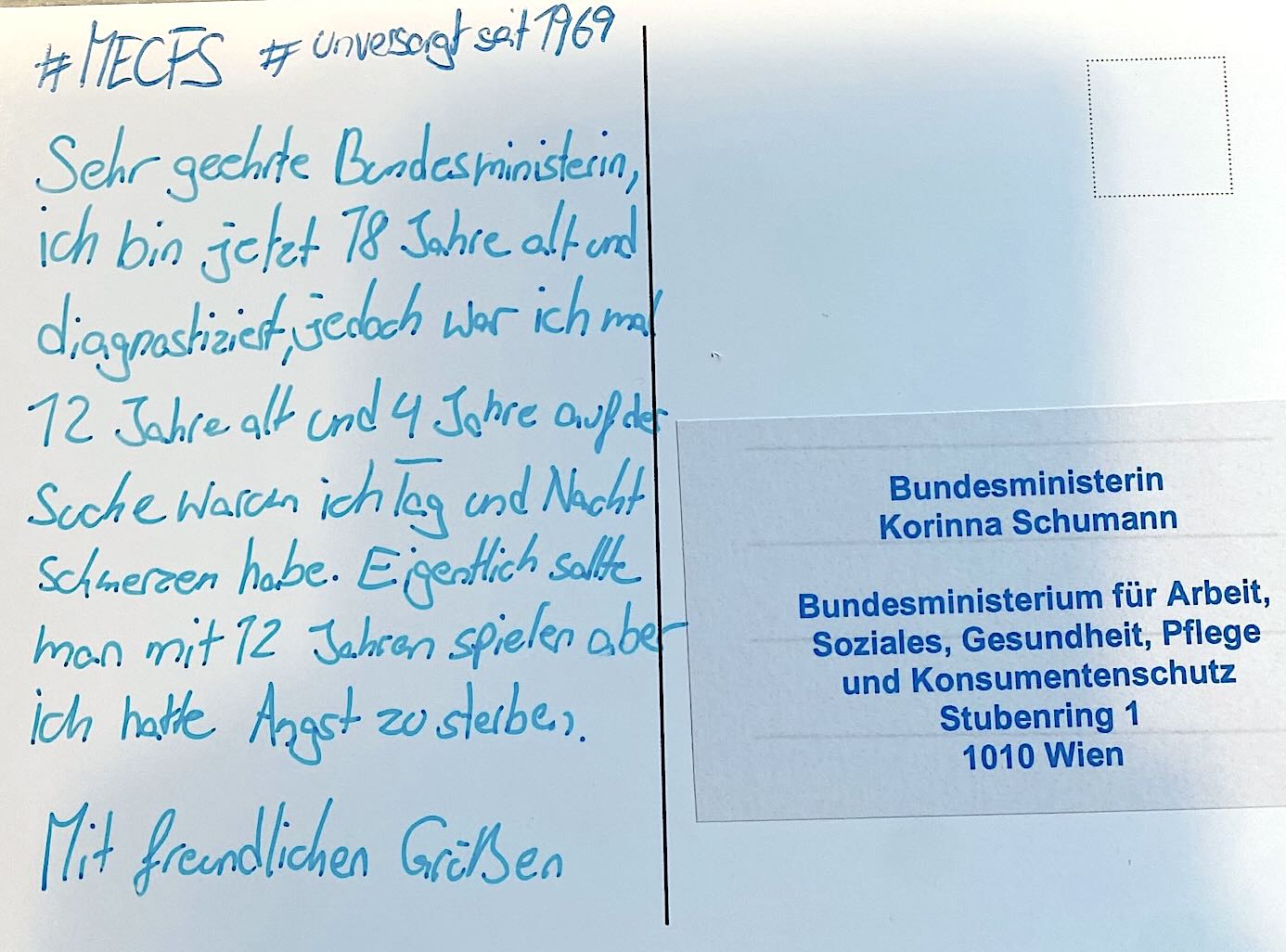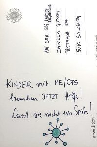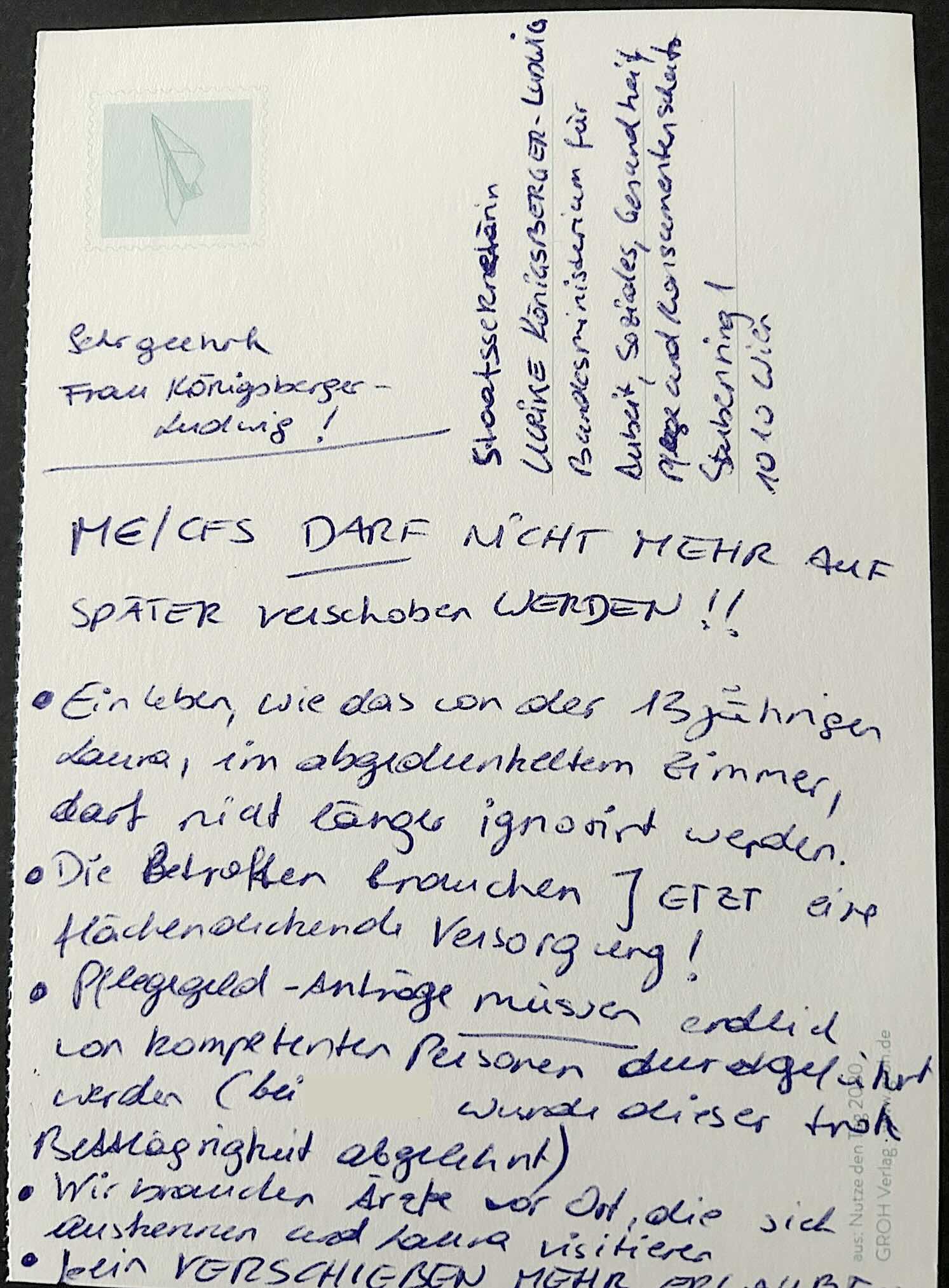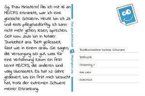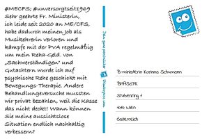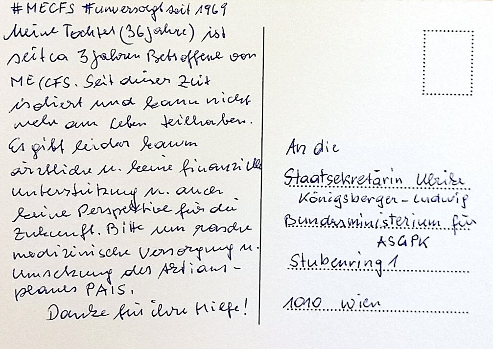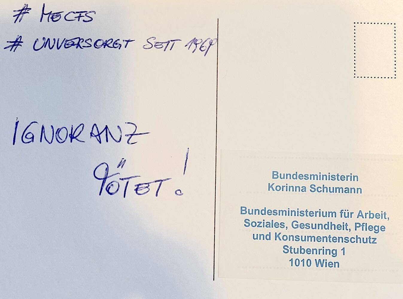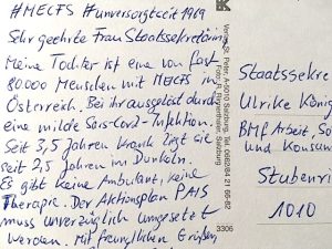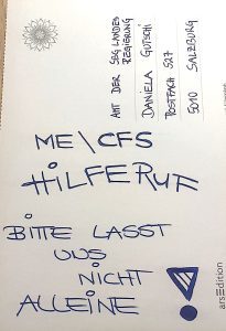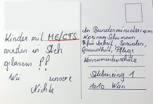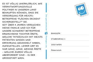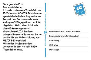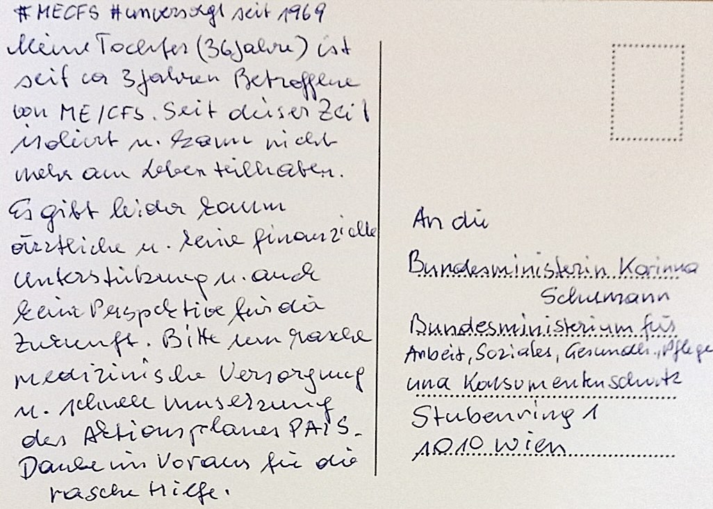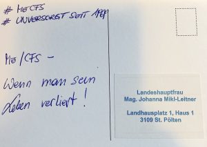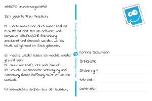 Um auf die Situation der Betroffenen – bedauerlicherweise erneut – aufmerksam zu machen, starten wir eine digitale Protestaktion in Form einer Postkartenaktion. Wir freuen uns über alle ME/CFS-Betroffene, Angehörige von Betroffenen oder nicht-Betroffene die sich an der Aktion beteiligen! Alle Infos zur Protestaktion gibt es hier.
