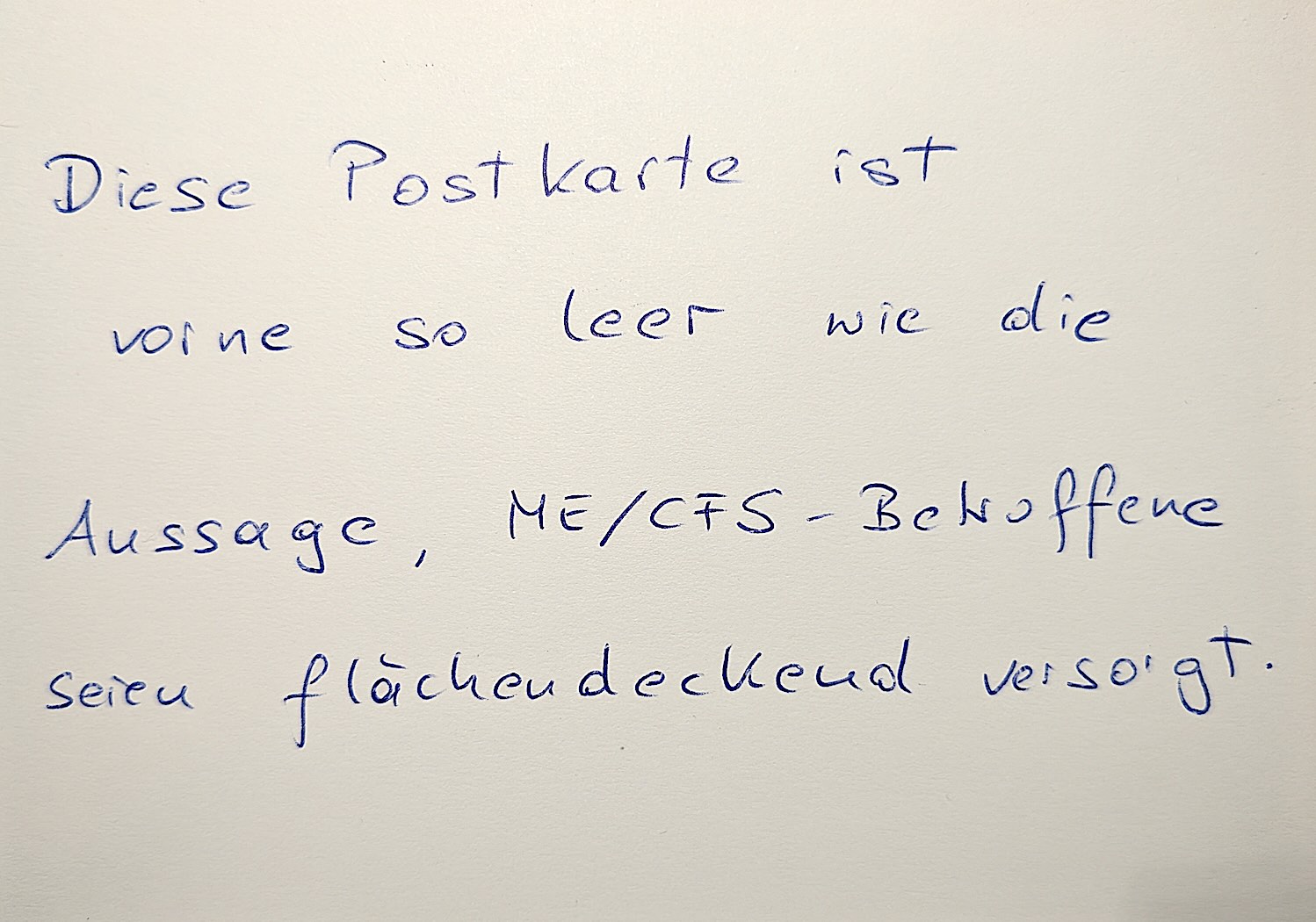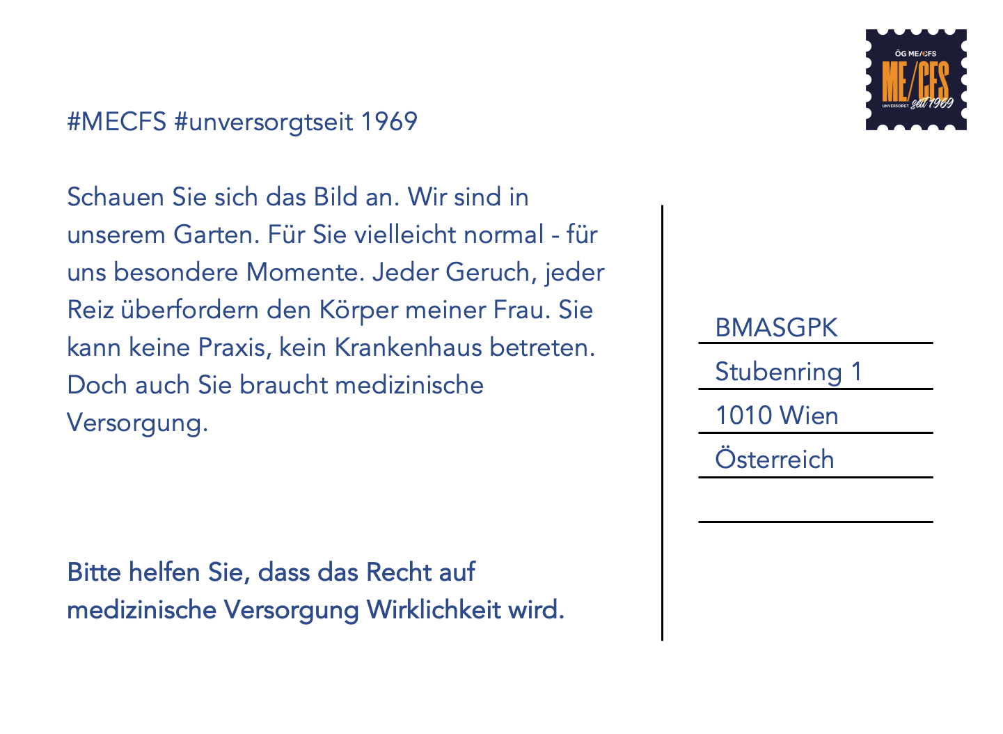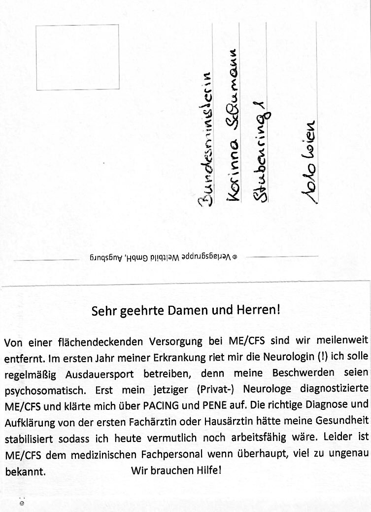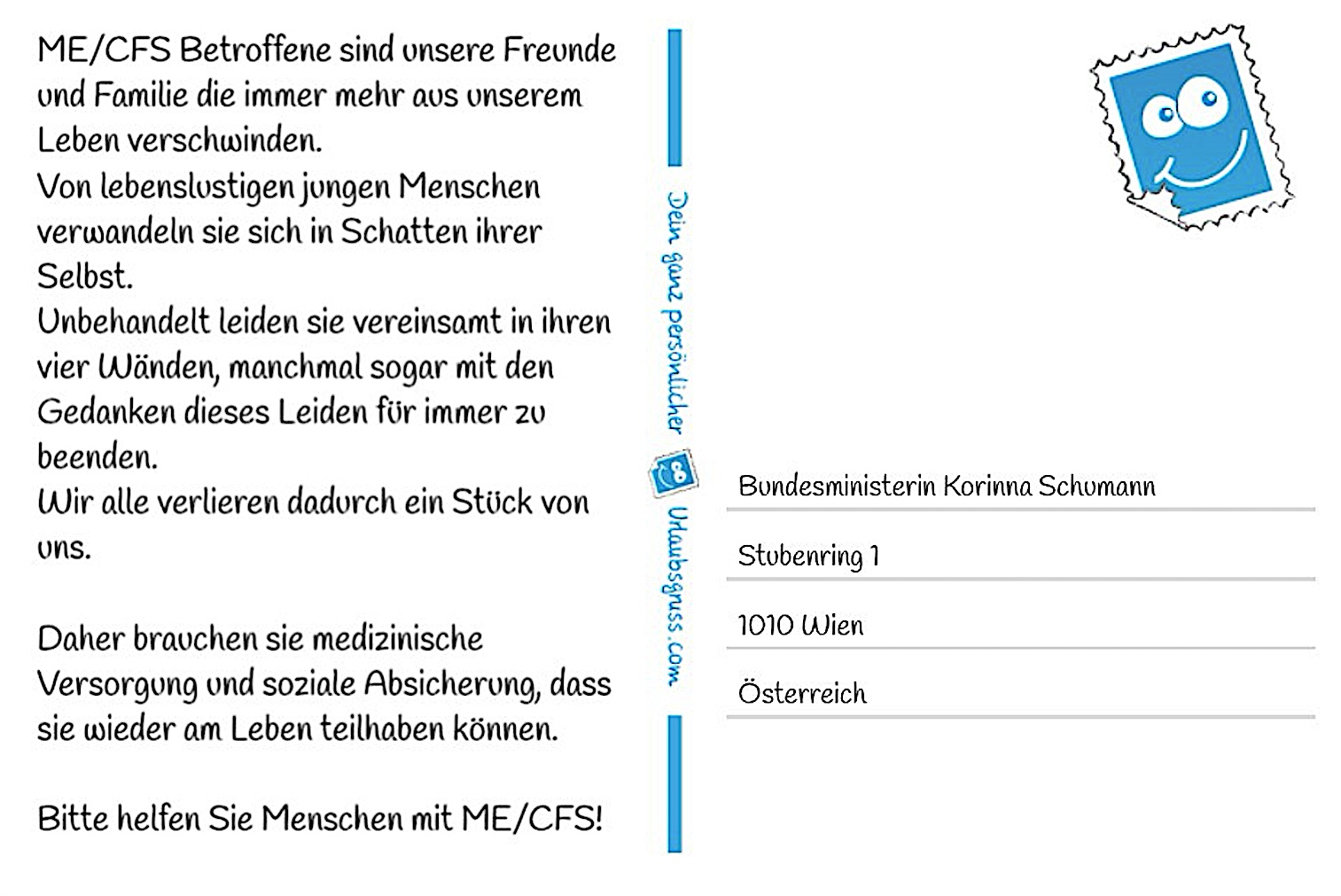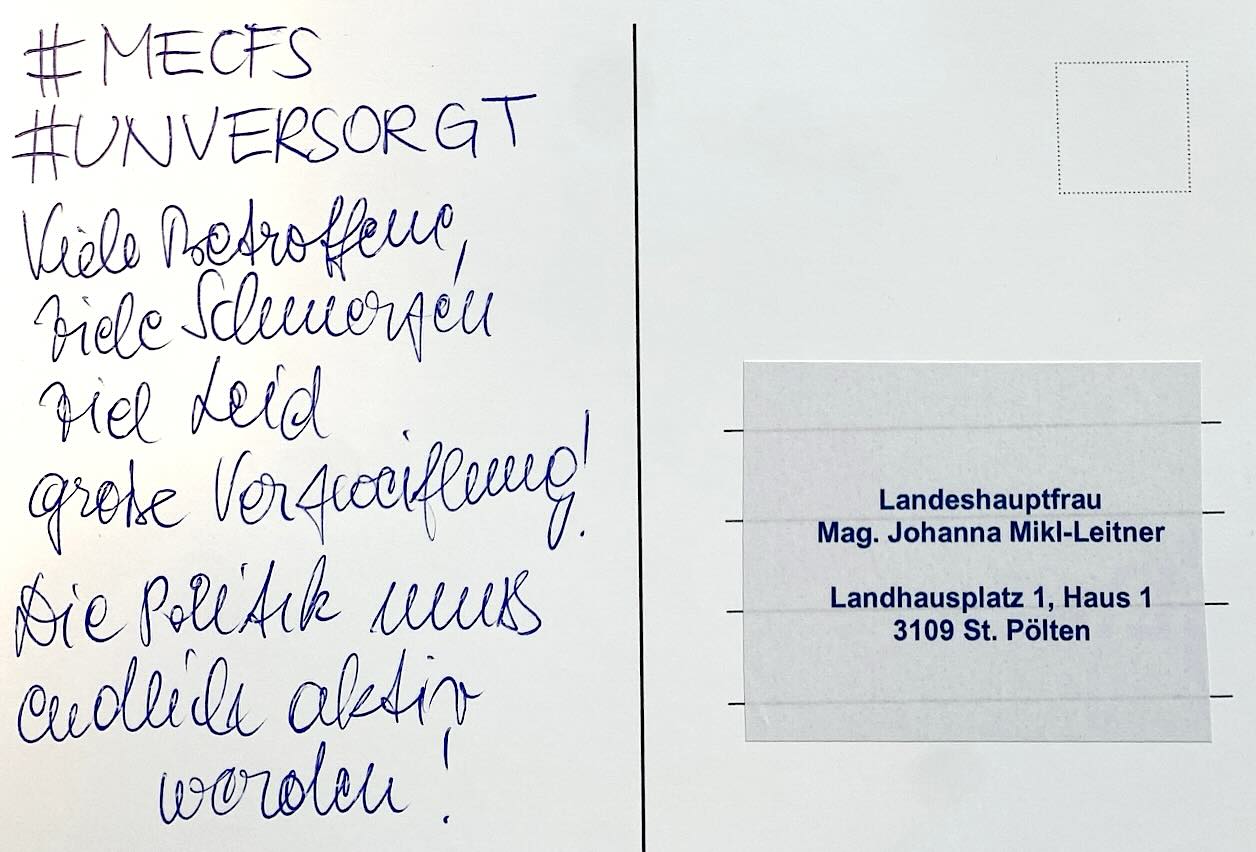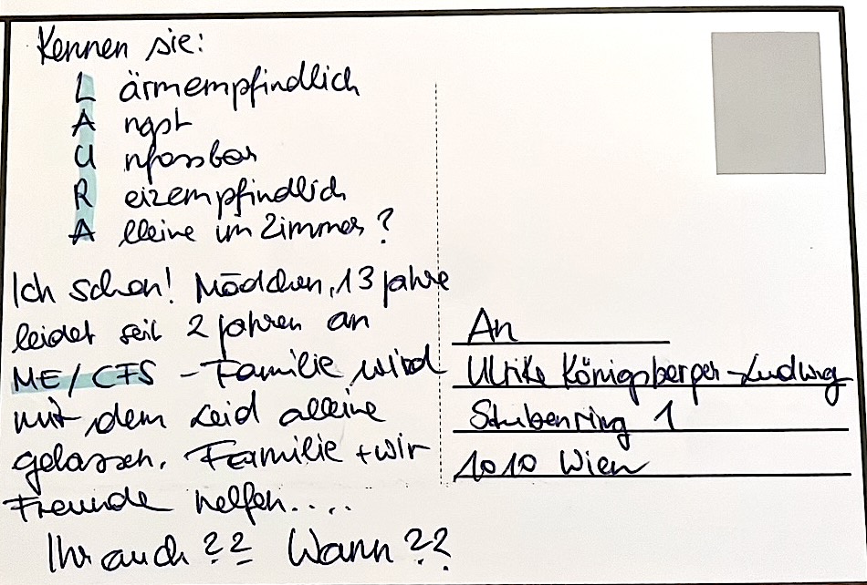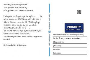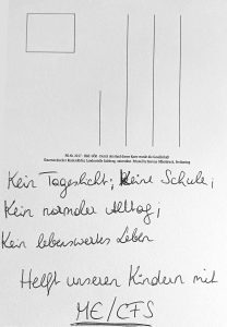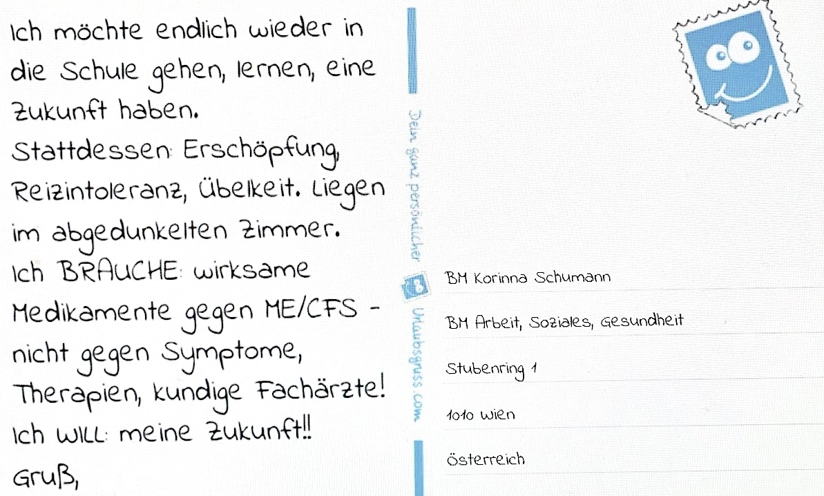 Um auf die Situation der Betroffenen – bedauerlicherweise erneut – aufmerksam zu machen, starten wir eine digitale Protestaktion in Form einer Postkartenaktion. Wir freuen uns über alle ME/CFS-Betroffene, Angehörige von Betroffenen oder nicht-Betroffene die sich an der Aktion beteiligen! Alle Infos zur Protestaktion gibt es hier.