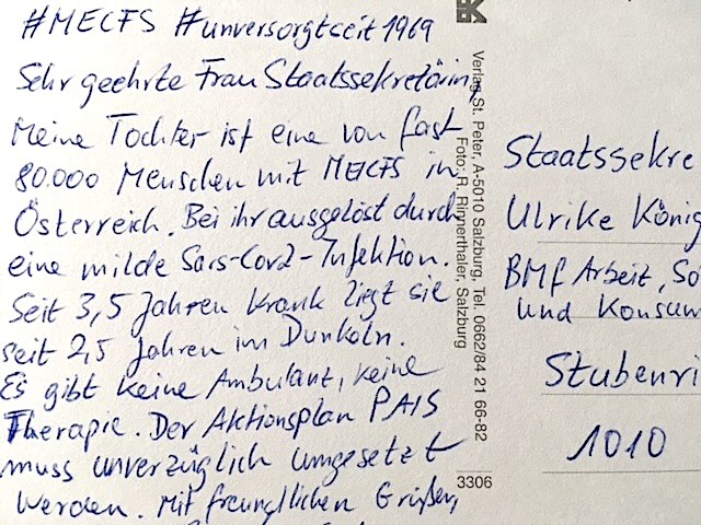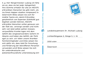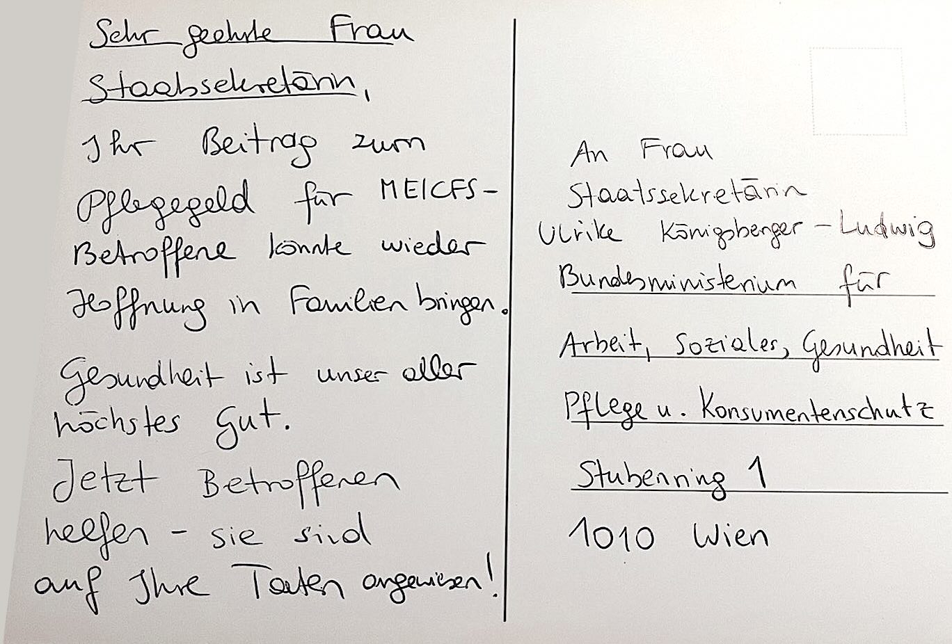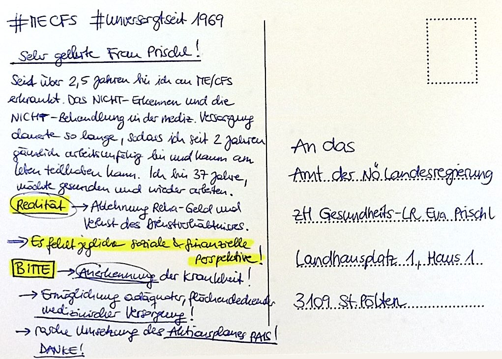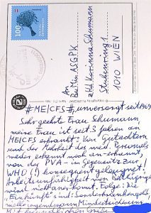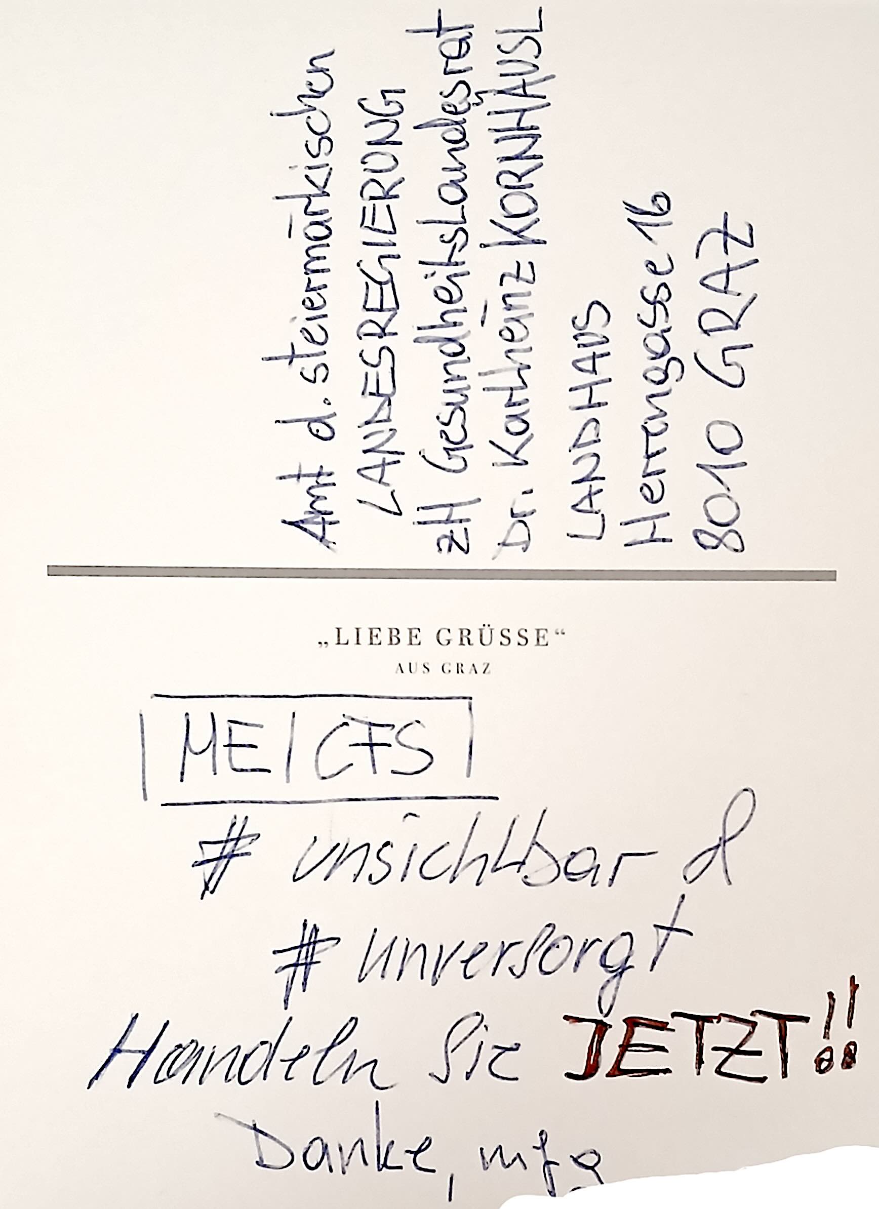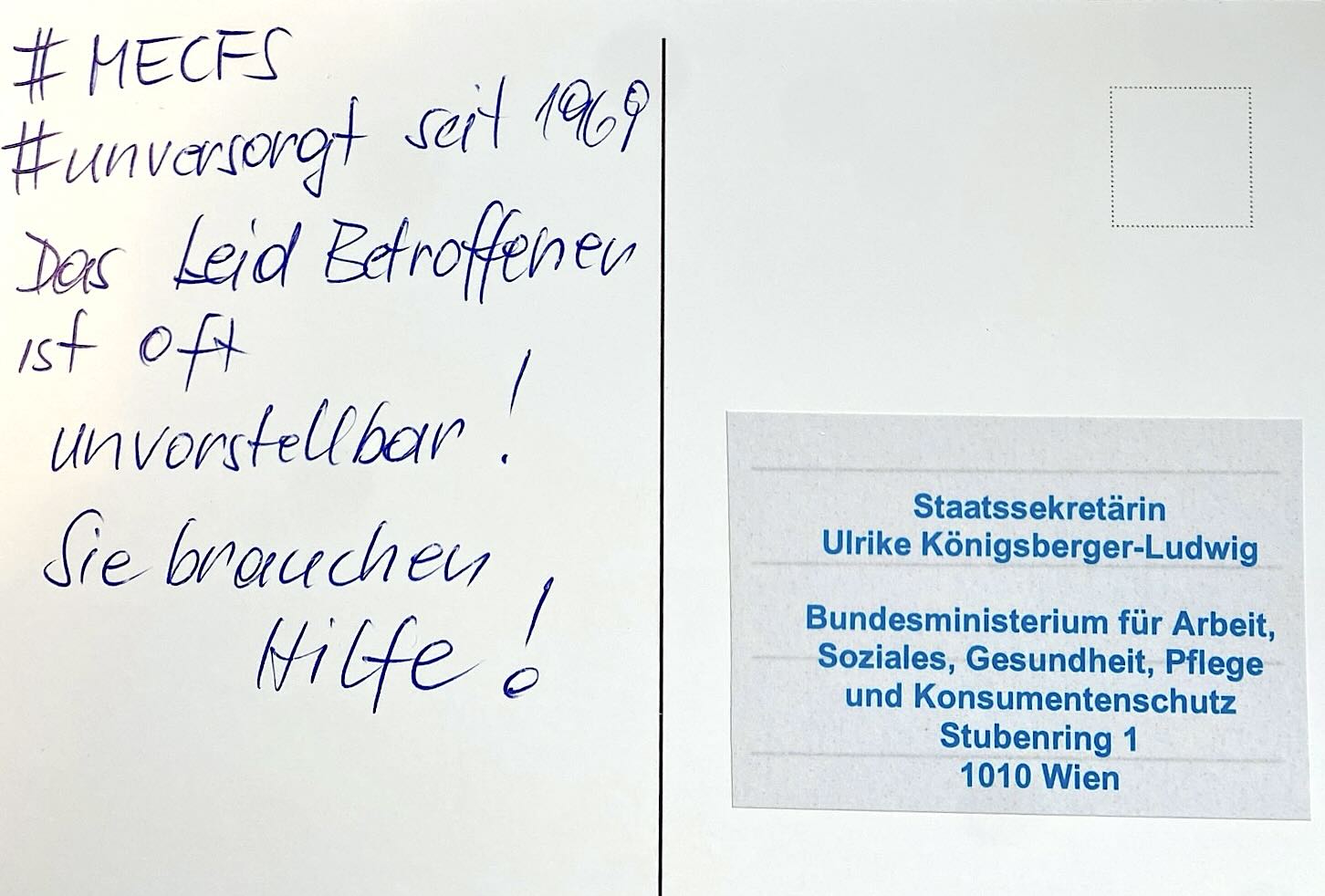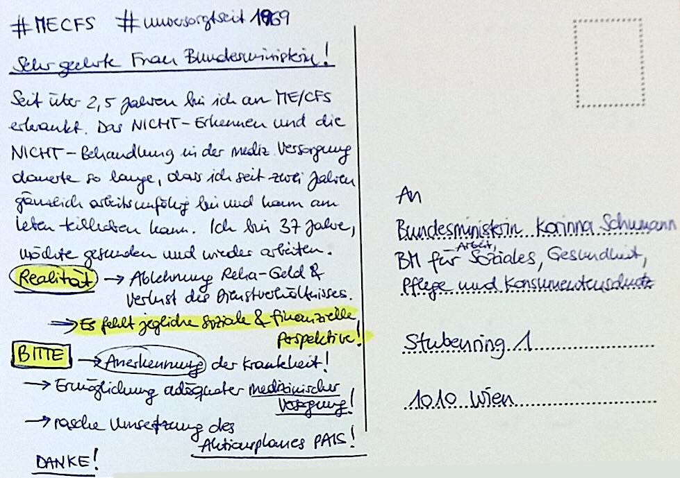 Um auf die Situation der Betroffenen – bedauerlicherweise erneut – aufmerksam zu machen, starten wir eine digitale Protestaktion in Form einer Postkartenaktion. Wir freuen uns über alle ME/CFS-Betroffene, Angehörige von Betroffenen oder nicht-Betroffene die sich an der Aktion beteiligen! Alle Infos zur Protestaktion gibt es hier.