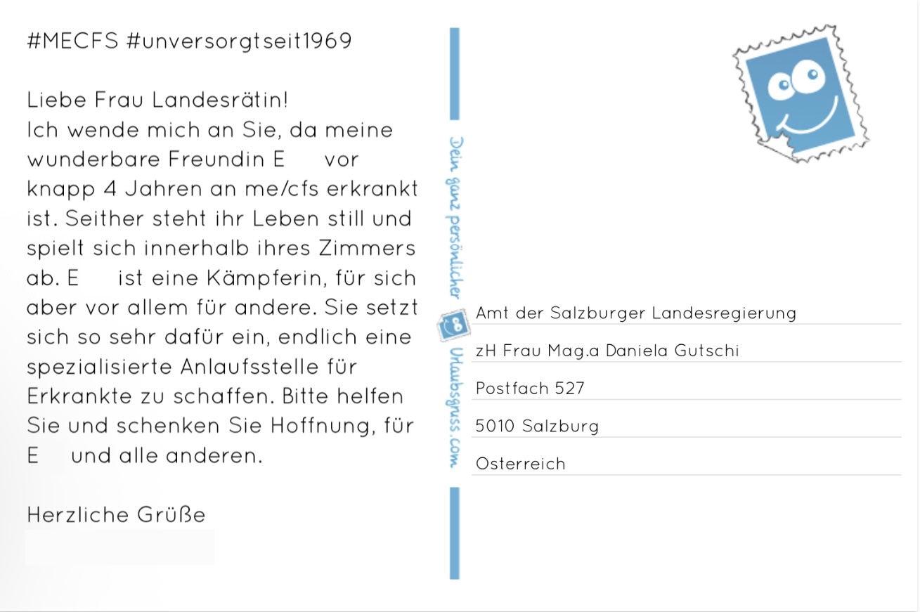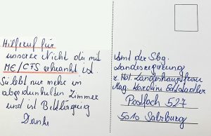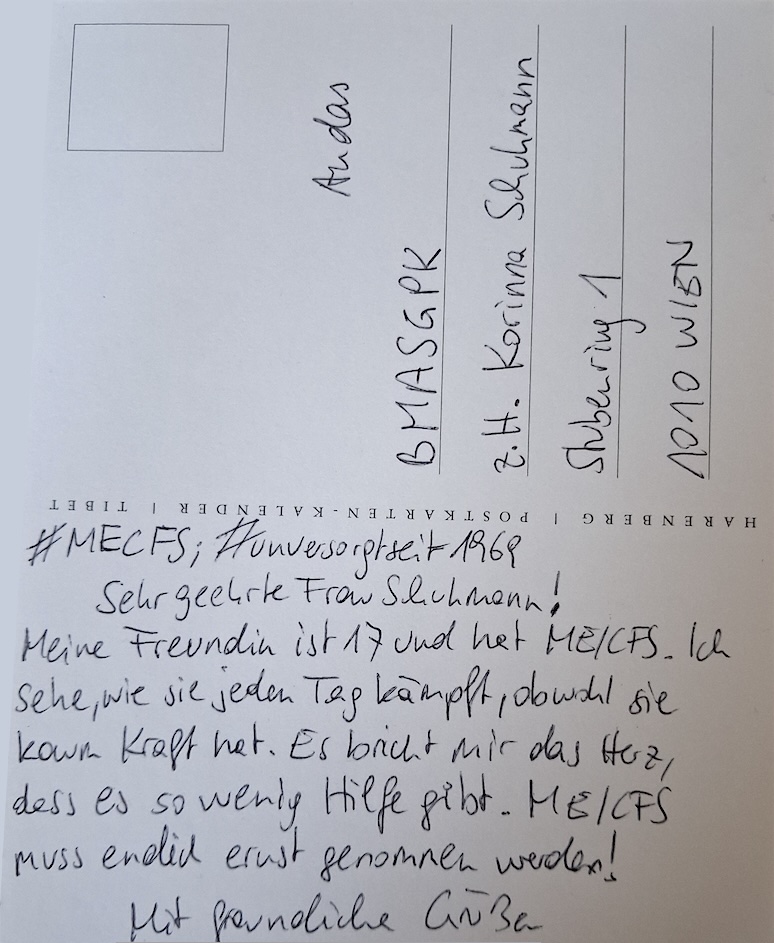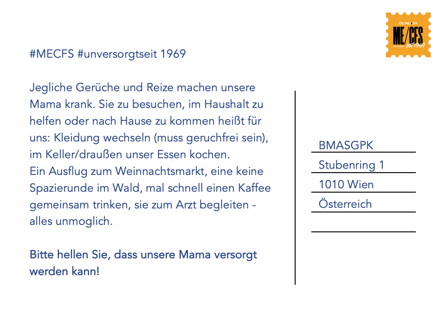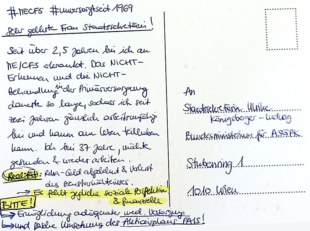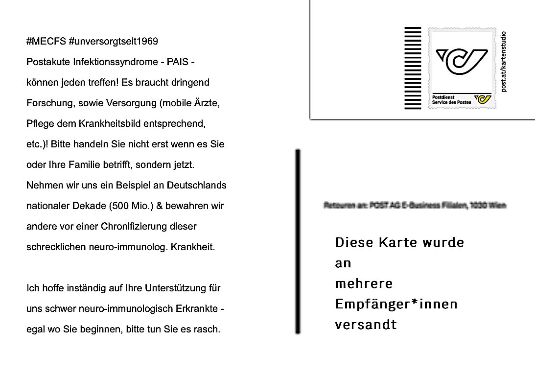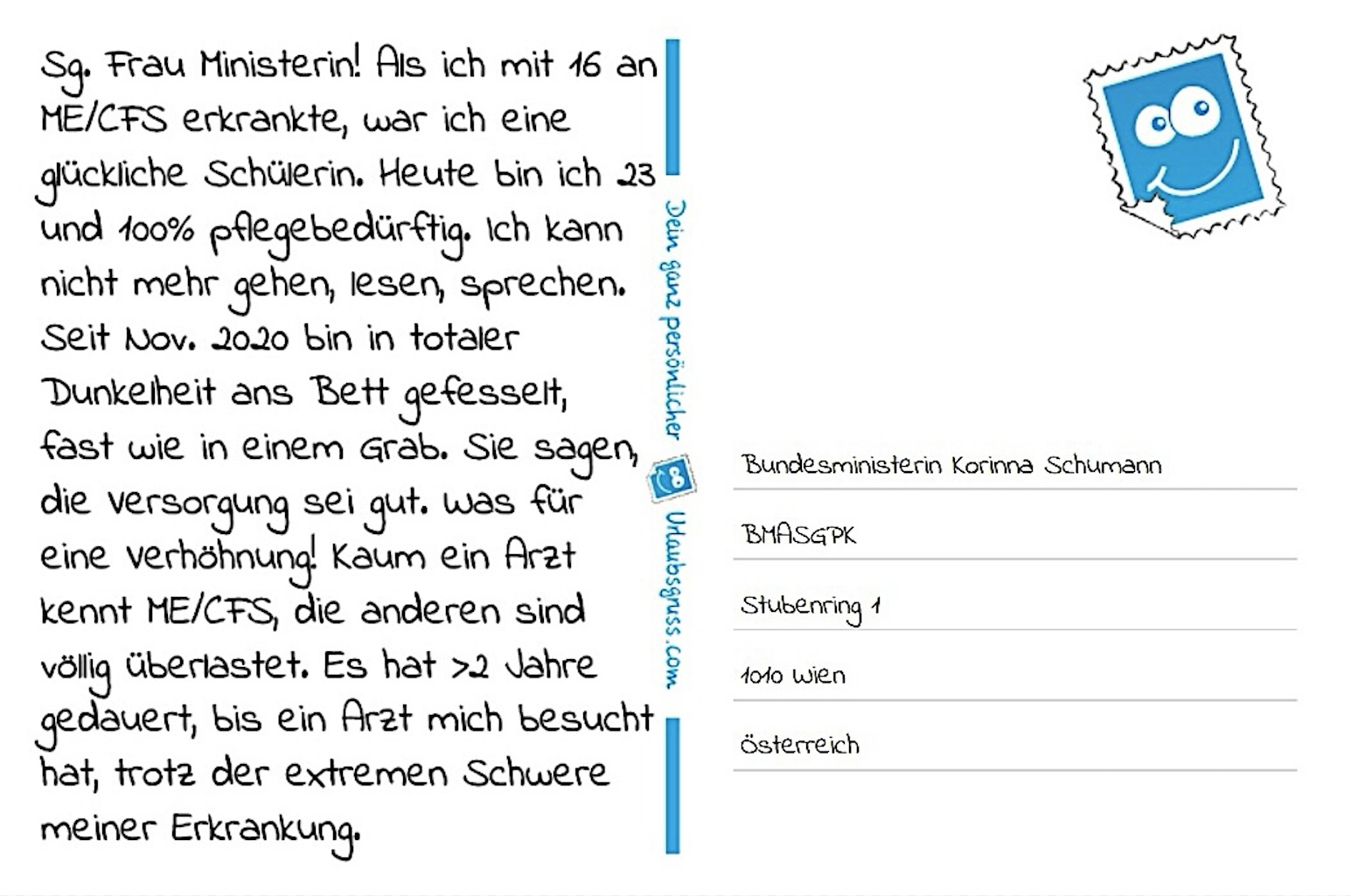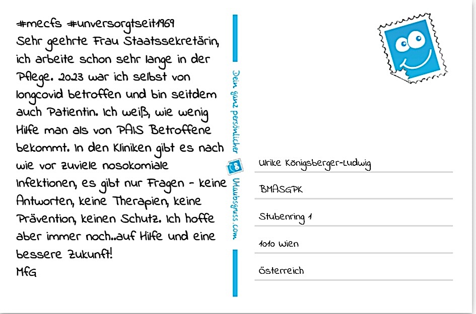 Um auf die Situation der Betroffenen – bedauerlicherweise erneut – aufmerksam zu machen, starten wir eine digitale Protestaktion in Form einer Postkartenaktion. Wir freuen uns über alle ME/CFS-Betroffene, Angehörige von Betroffenen oder nicht-Betroffene die sich an der Aktion beteiligen! Alle Infos zur Protestaktion gibt es hier.