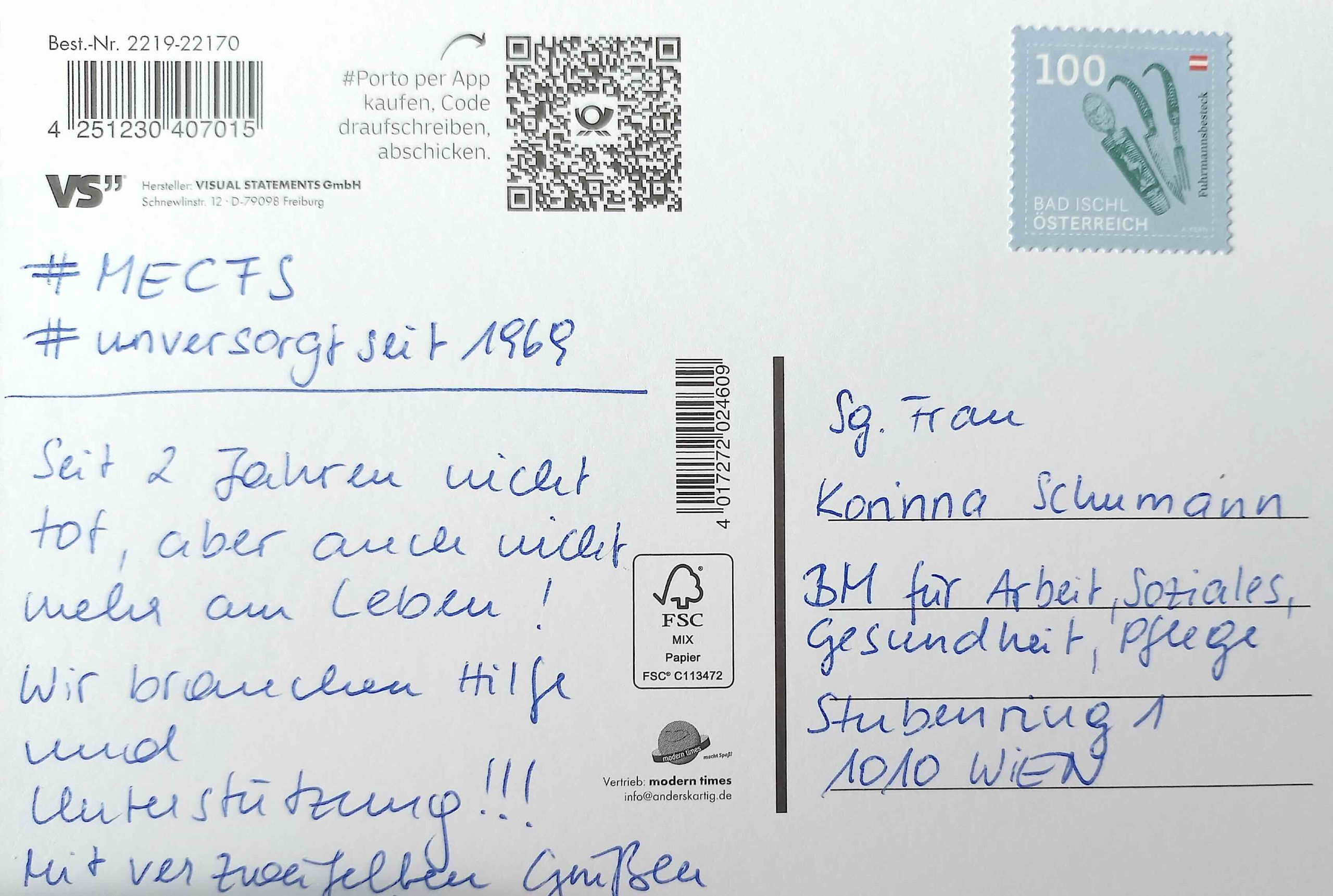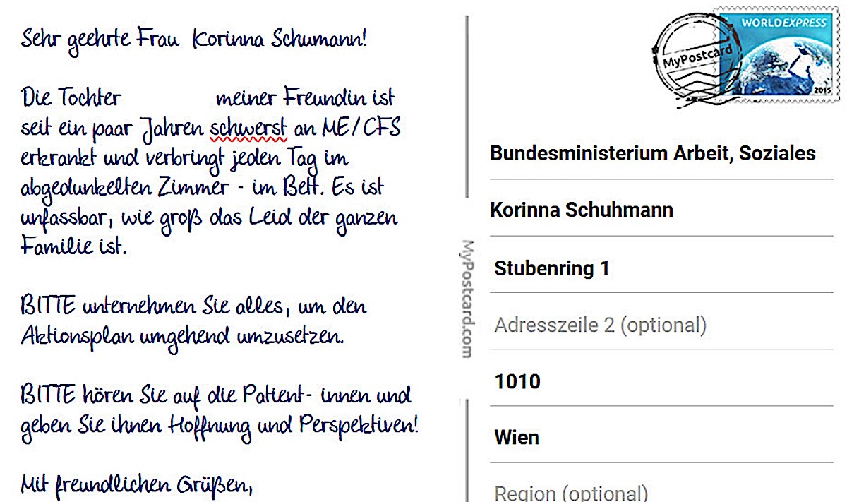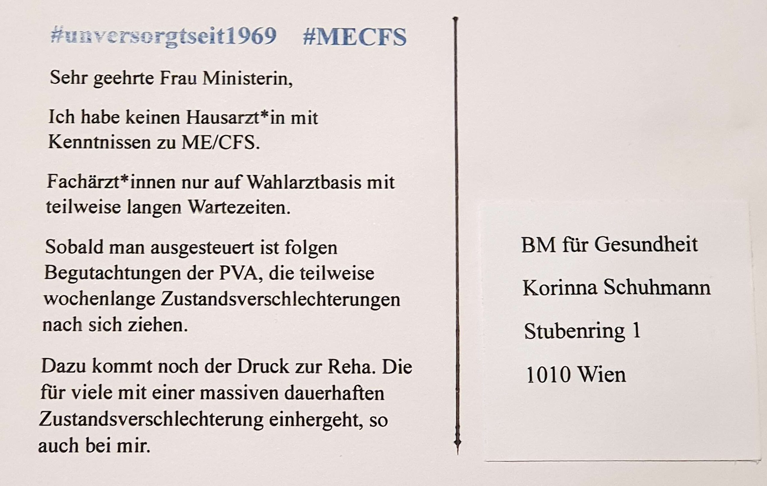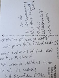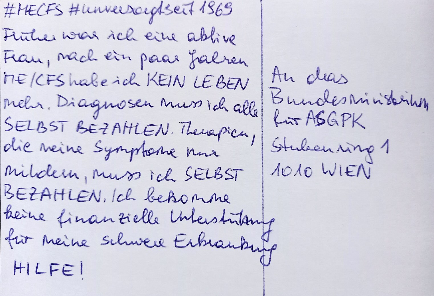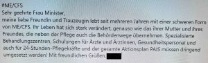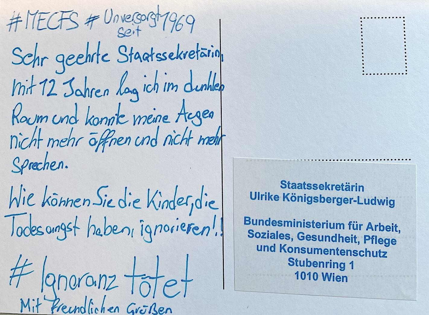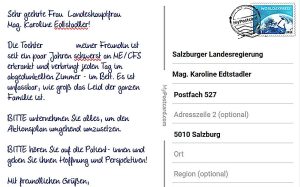 Um auf die Situation der Betroffenen – bedauerlicherweise erneut – aufmerksam zu machen, starten wir eine digitale Protestaktion in Form einer Postkartenaktion. Wir freuen uns über alle ME/CFS-Betroffene, Angehörige von Betroffenen oder nicht-Betroffene die sich an der Aktion beteiligen! Alle Infos zur Protestaktion gibt es hier.