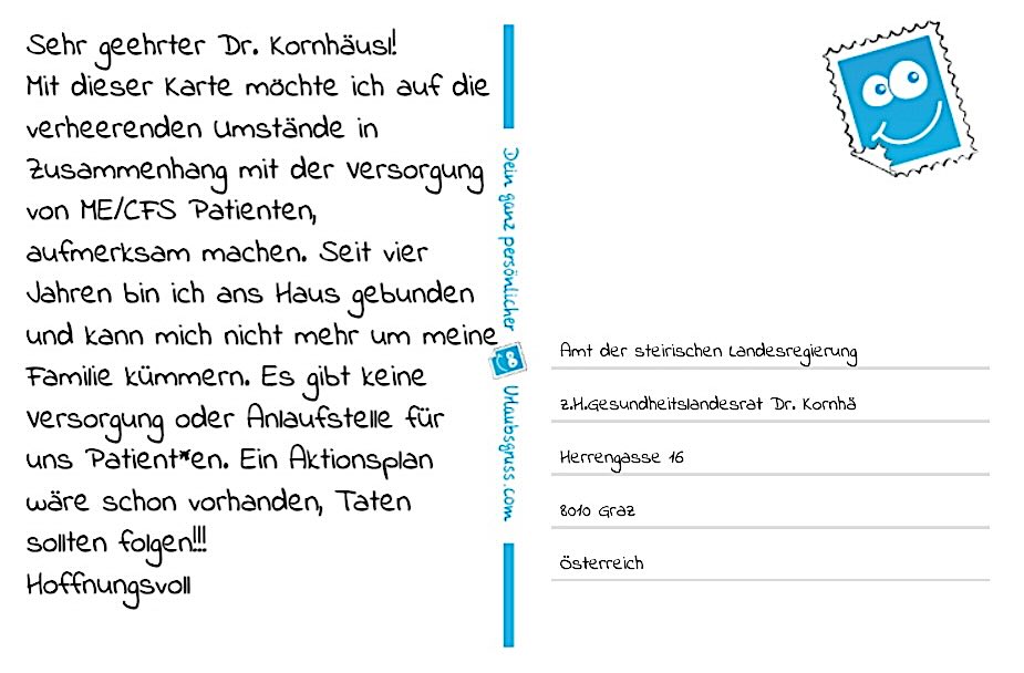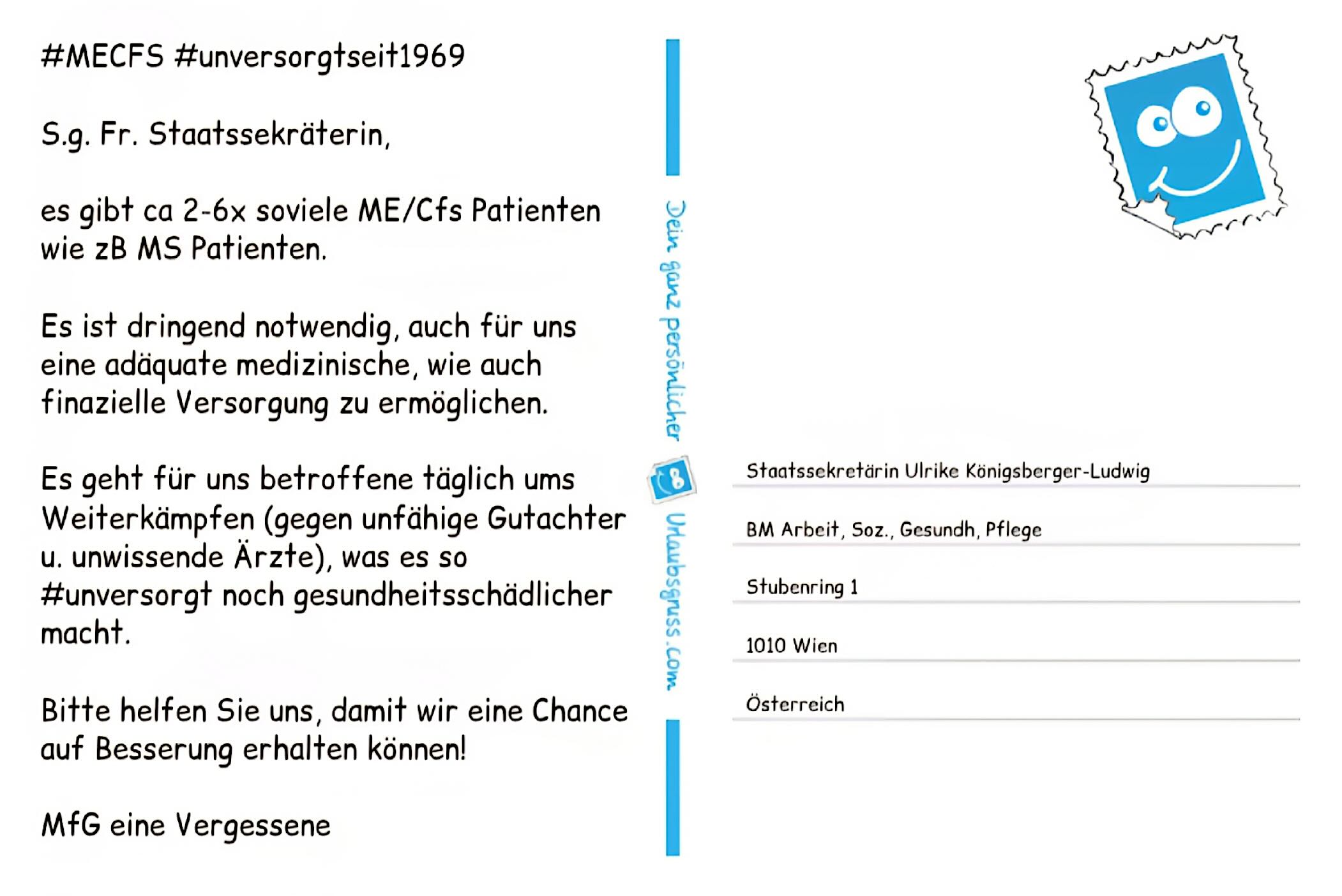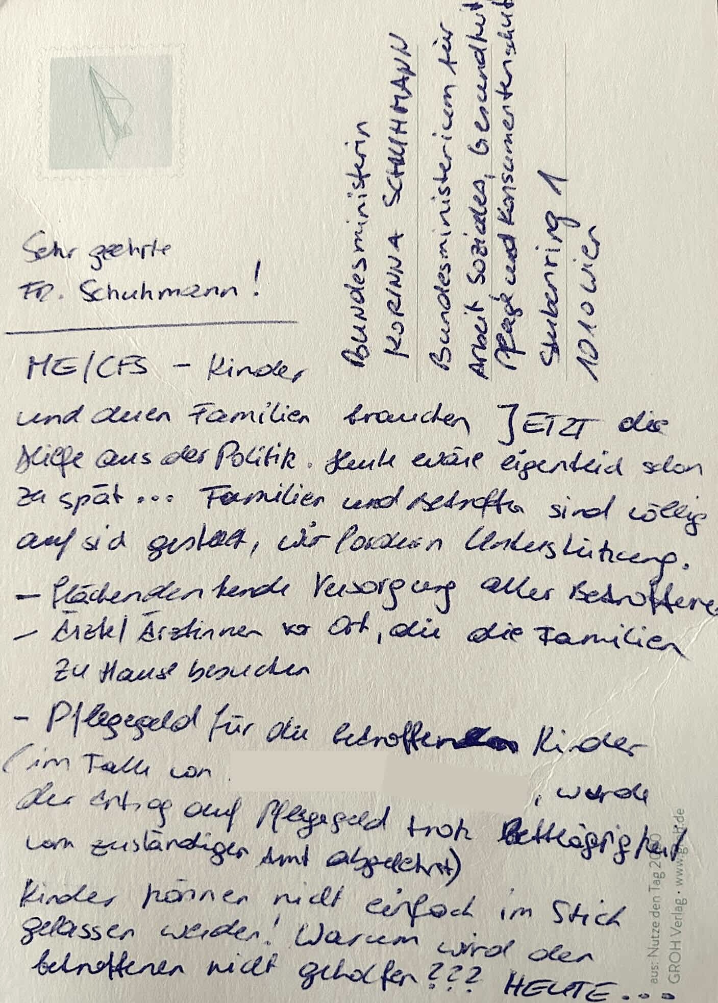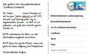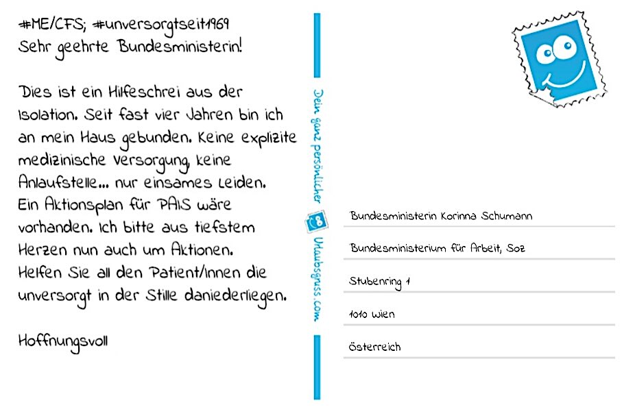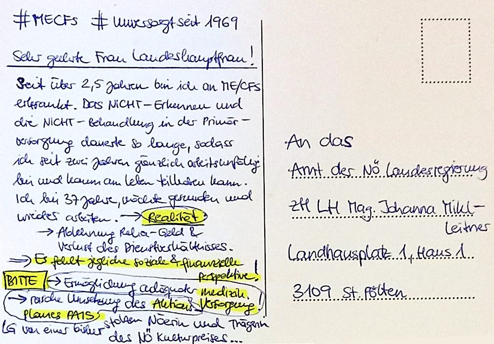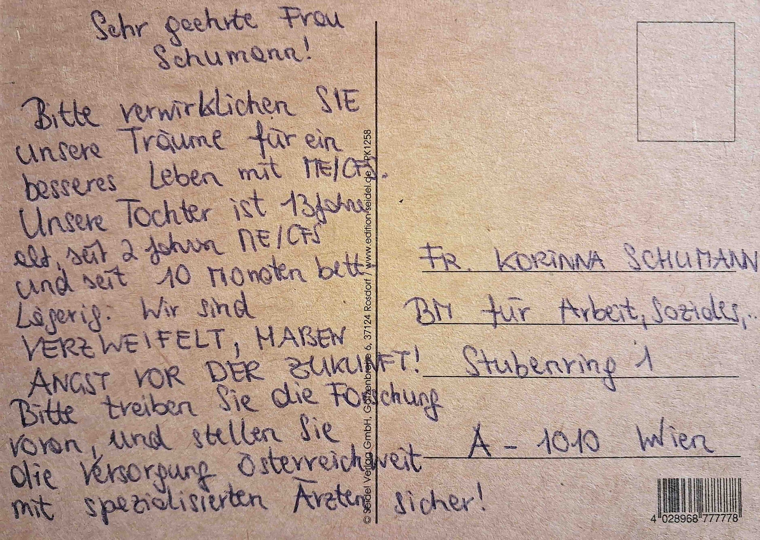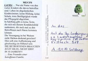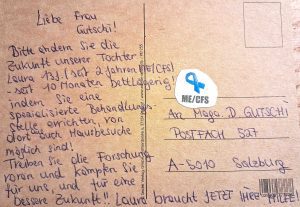 Um auf die Situation der Betroffenen – bedauerlicherweise erneut – aufmerksam zu machen, starten wir eine digitale Protestaktion in Form einer Postkartenaktion. Wir freuen uns über alle ME/CFS-Betroffene, Angehörige von Betroffenen oder nicht-Betroffene die sich an der Aktion beteiligen! Alle Infos zur Protestaktion gibt es hier.