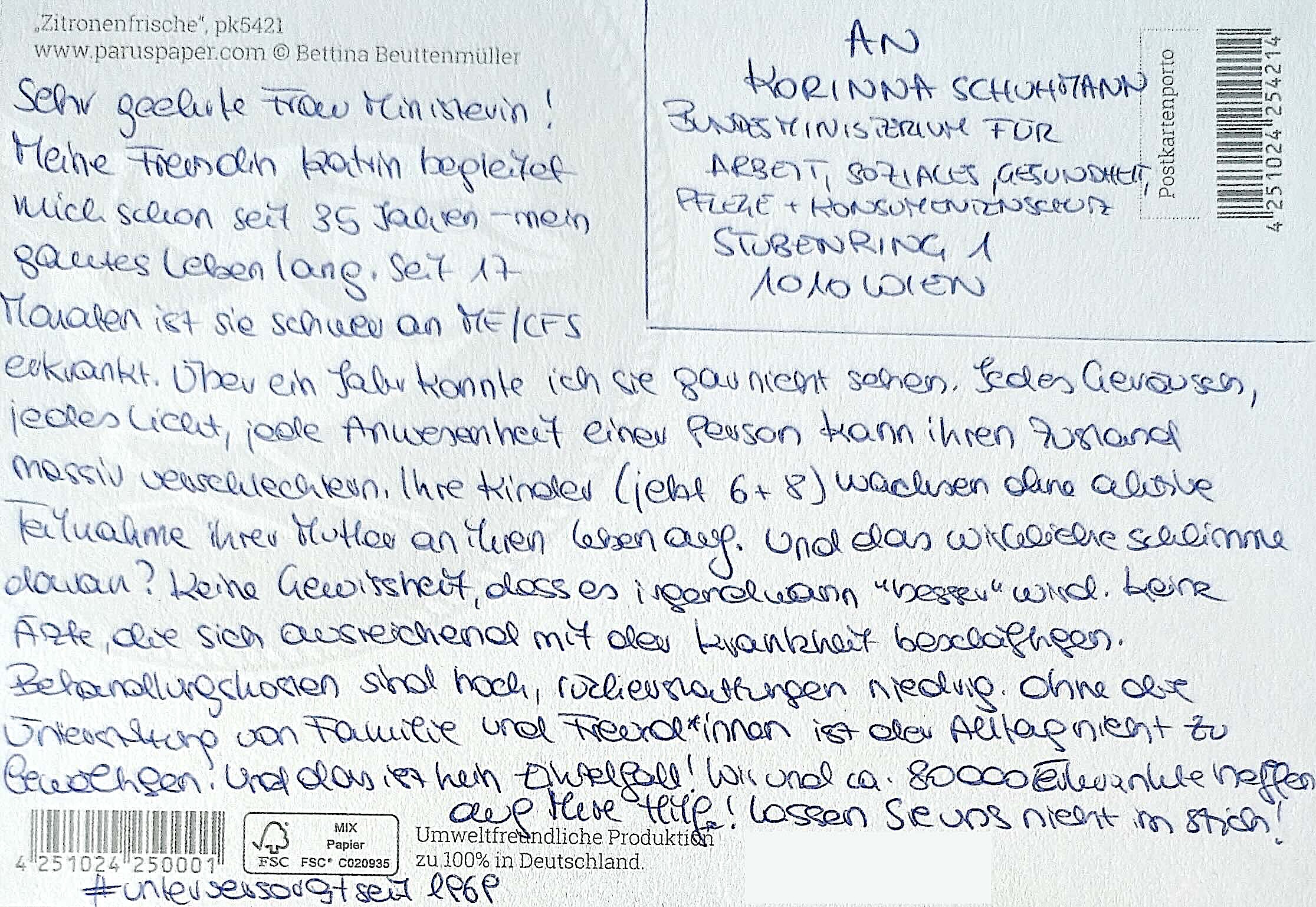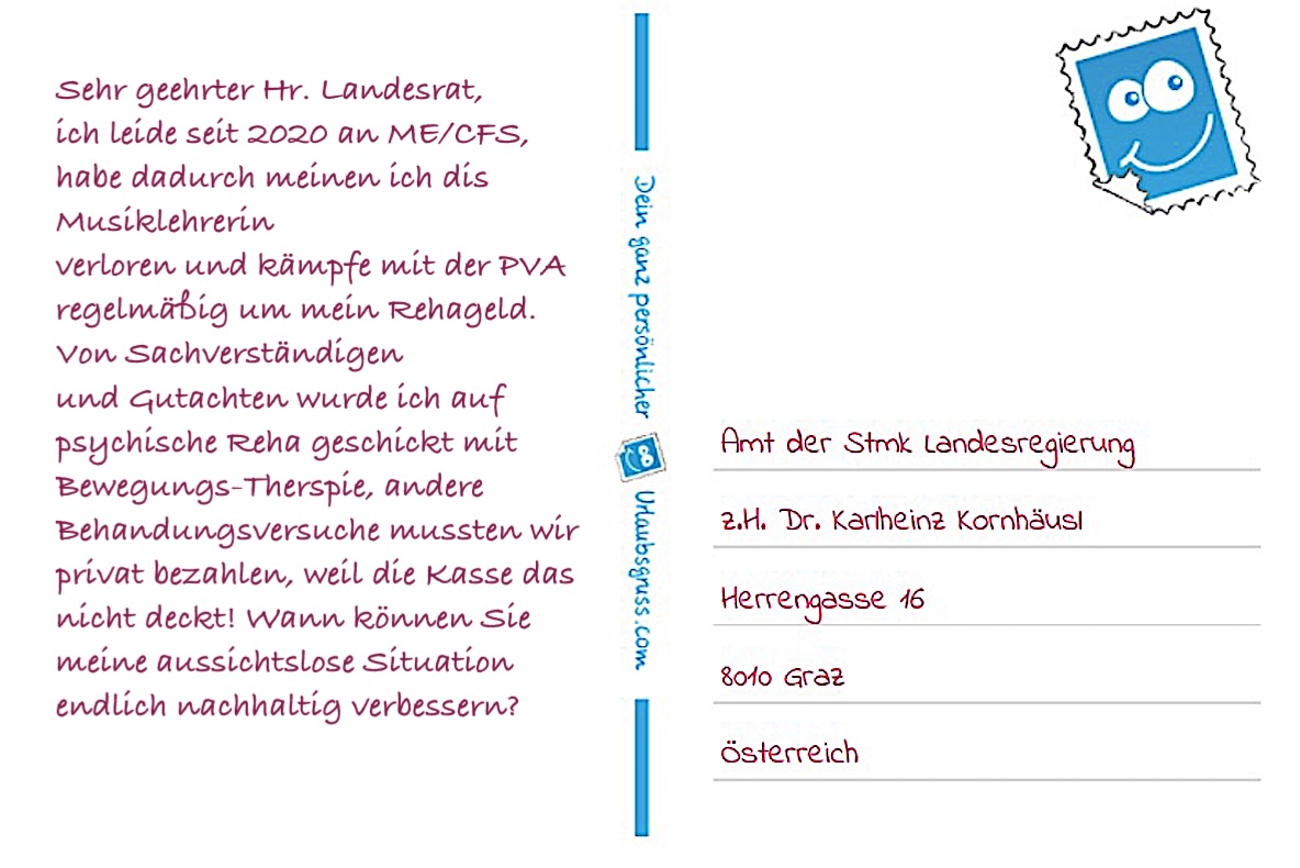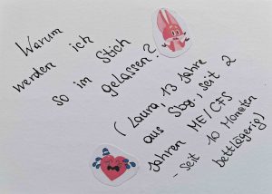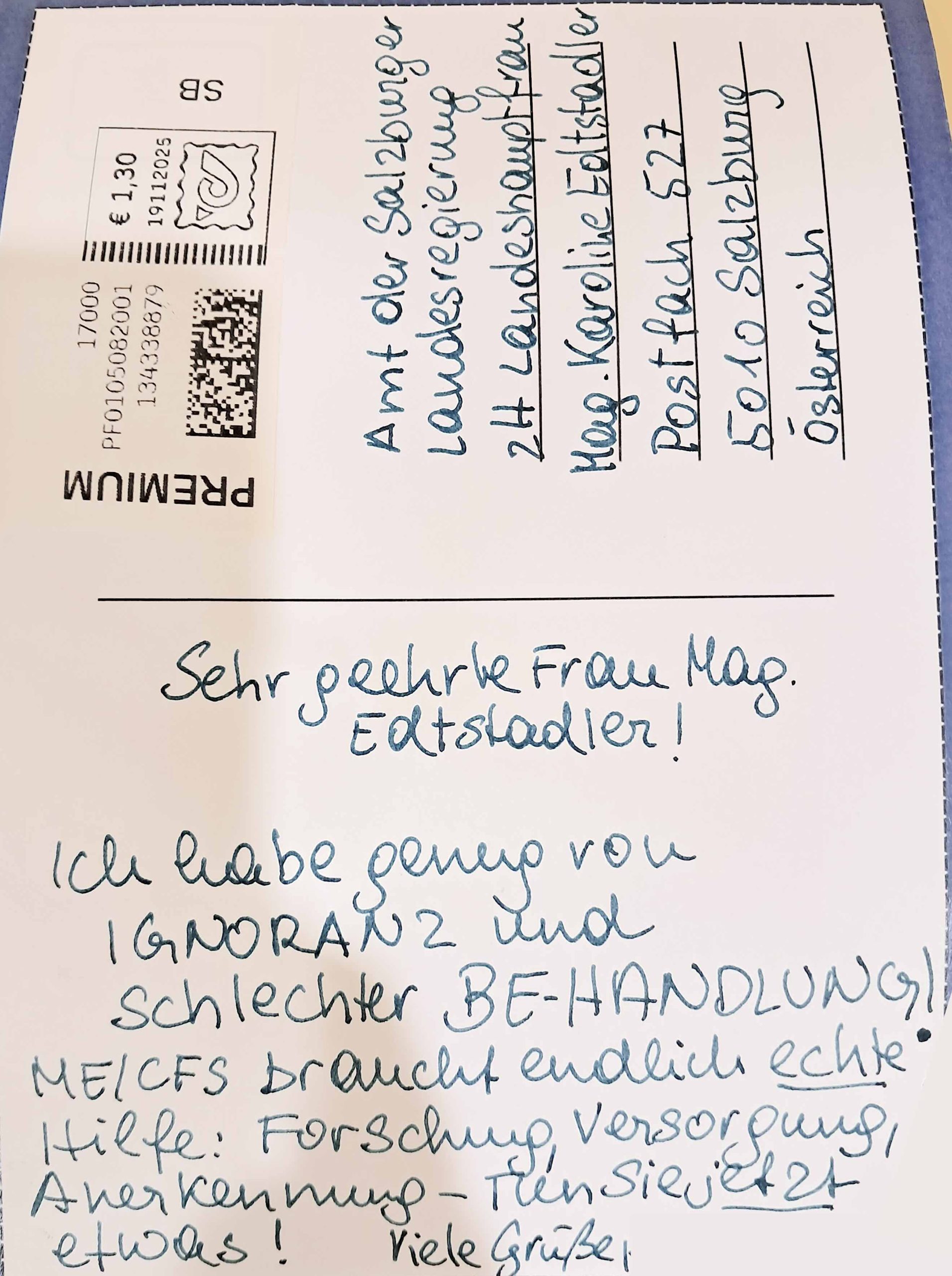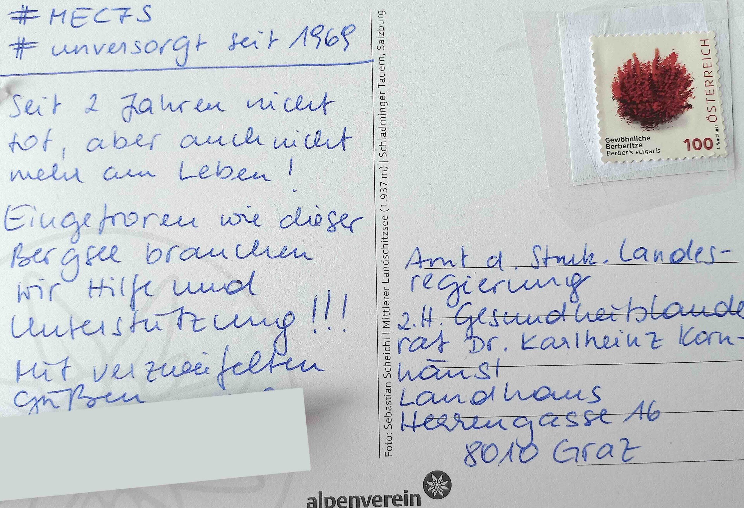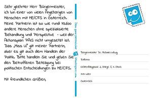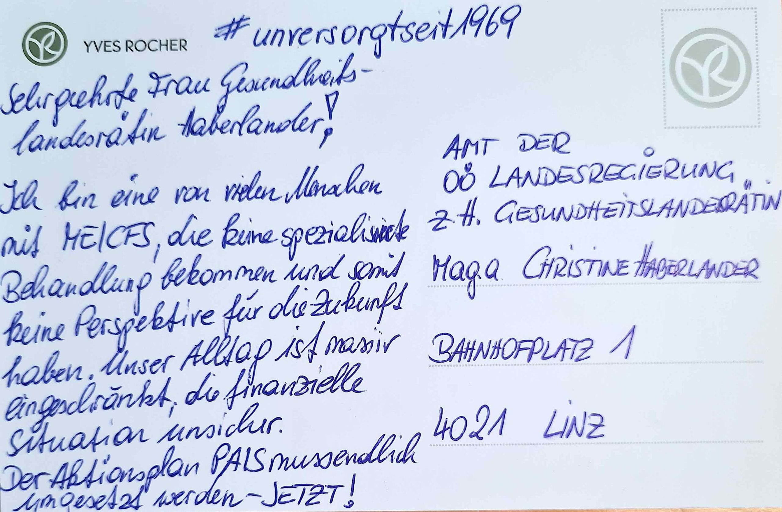 Um auf die Situation der Betroffenen – bedauerlicherweise erneut – aufmerksam zu machen, starten wir eine digitale Protestaktion in Form einer Postkartenaktion. Wir freuen uns über alle ME/CFS-Betroffene, Angehörige von Betroffenen oder nicht-Betroffene die sich an der Aktion beteiligen! Alle Infos zur Protestaktion gibt es hier.
