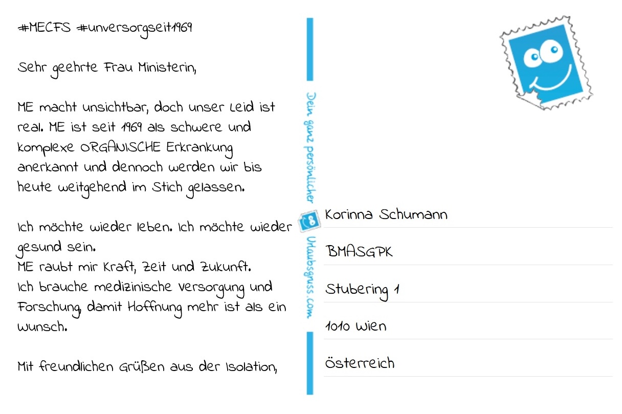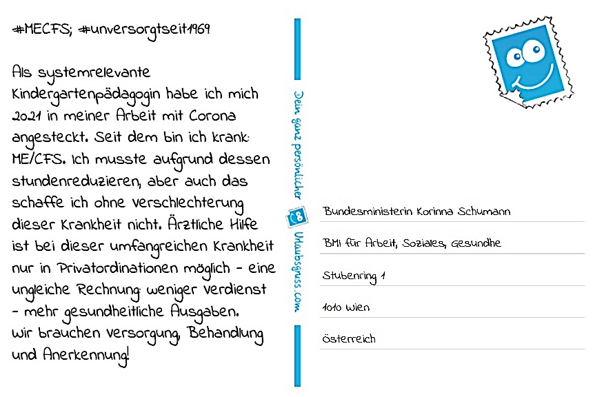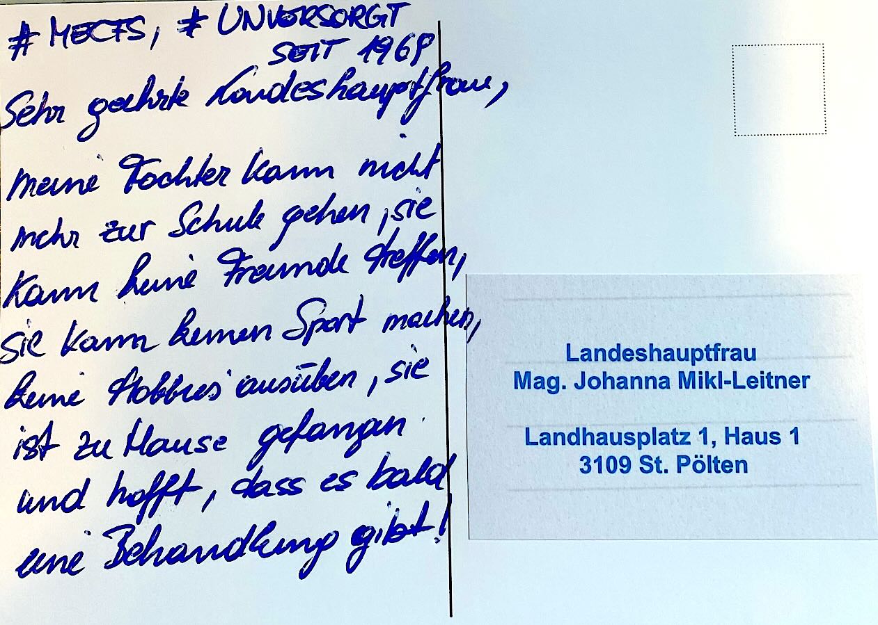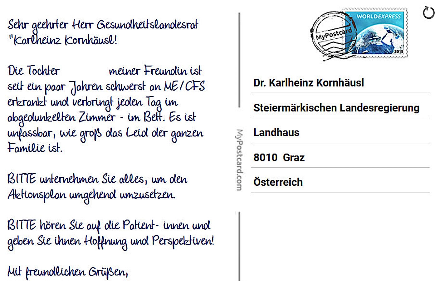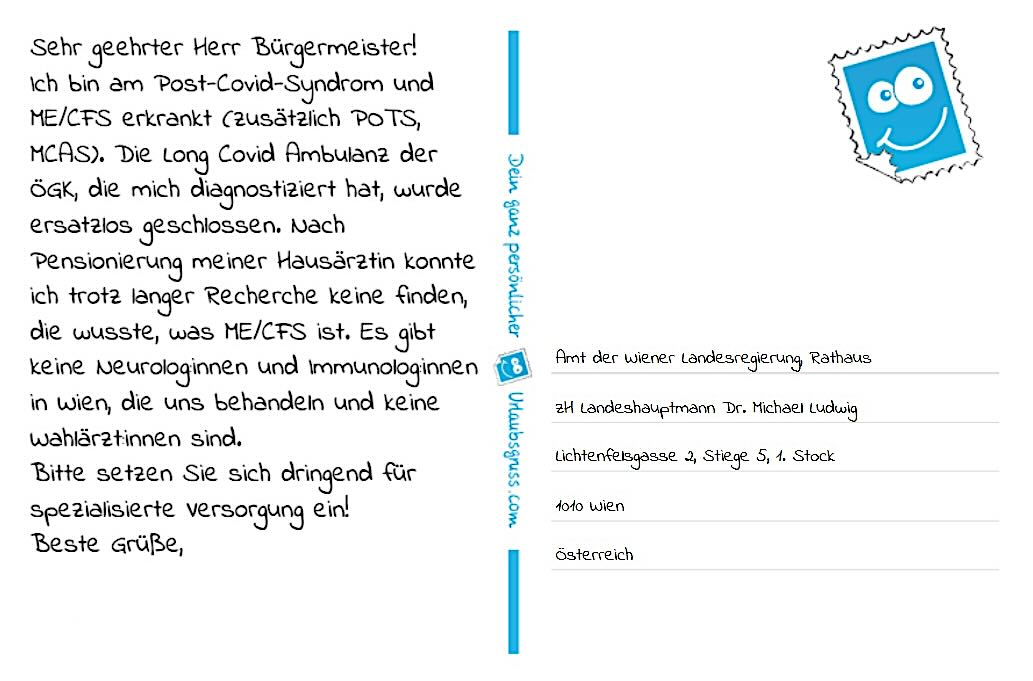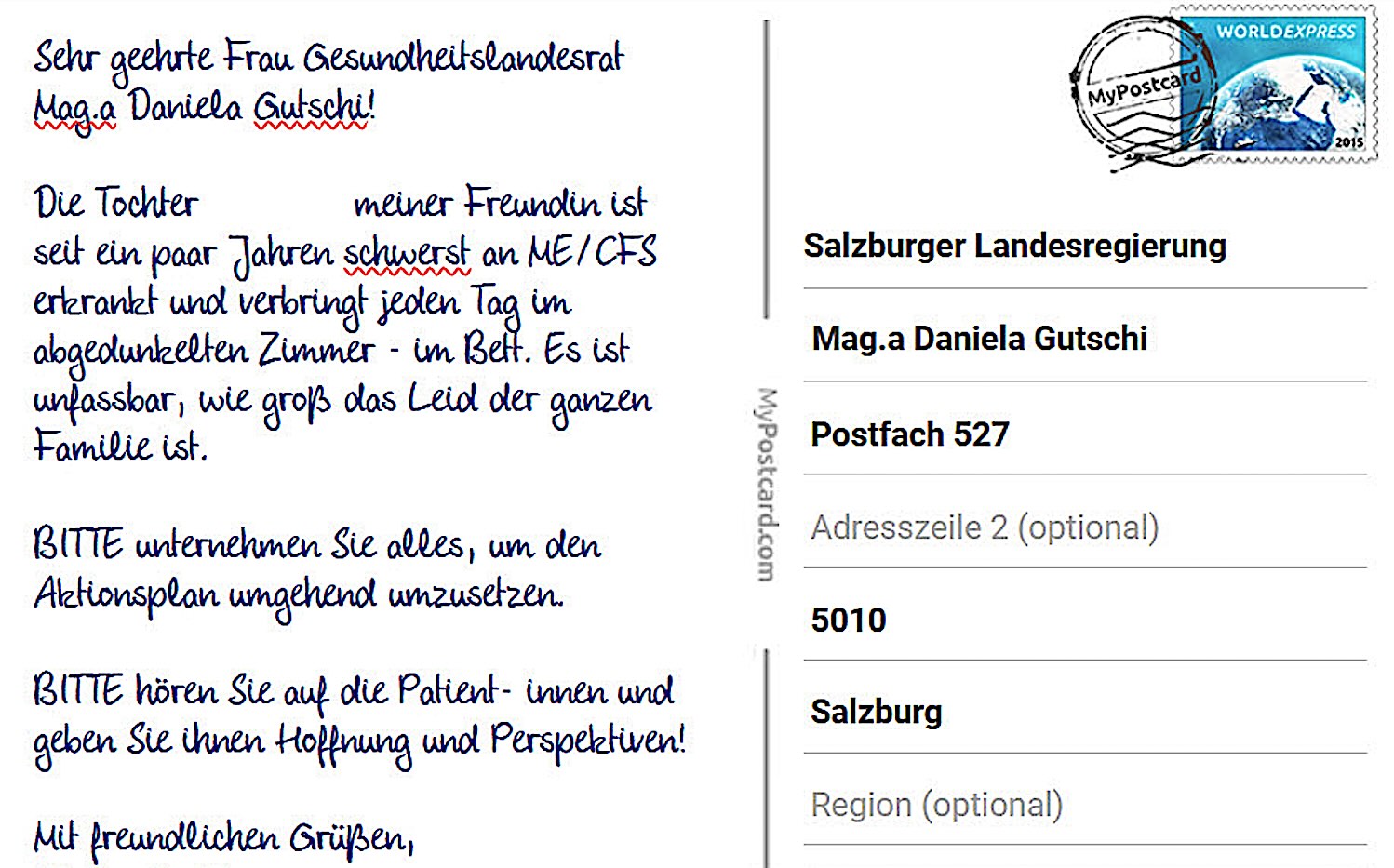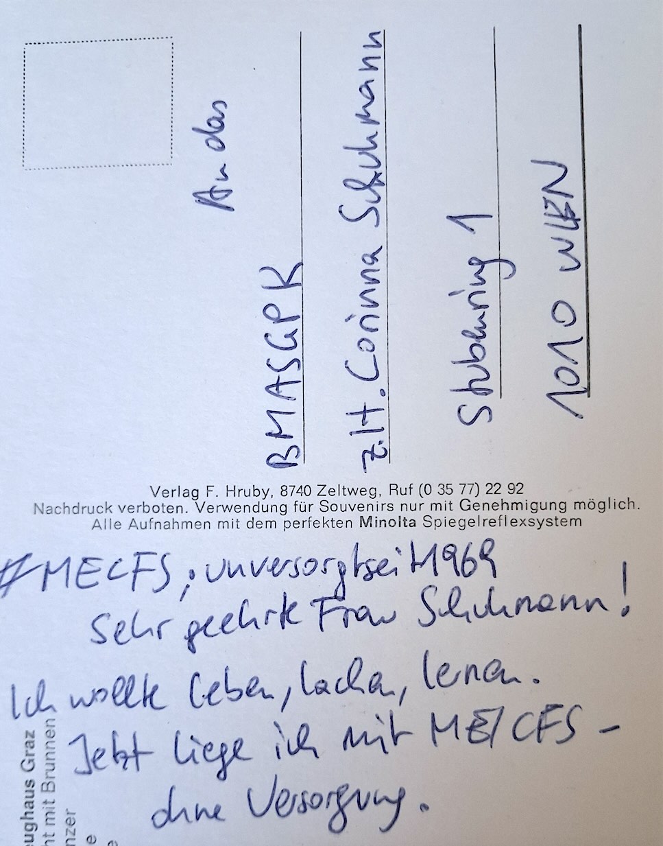 Um auf die Situation der Betroffenen – bedauerlicherweise erneut – aufmerksam zu machen, starten wir eine digitale Protestaktion in Form einer Postkartenaktion. Wir freuen uns über alle ME/CFS-Betroffene, Angehörige von Betroffenen oder nicht-Betroffene die sich an der Aktion beteiligen! Alle Infos zur Protestaktion gibt es hier.