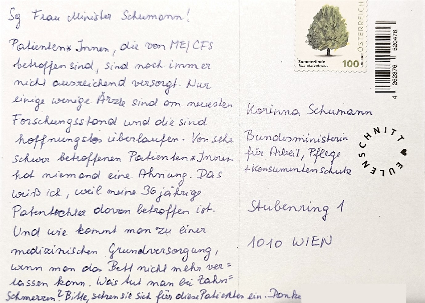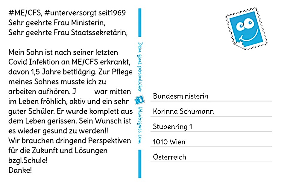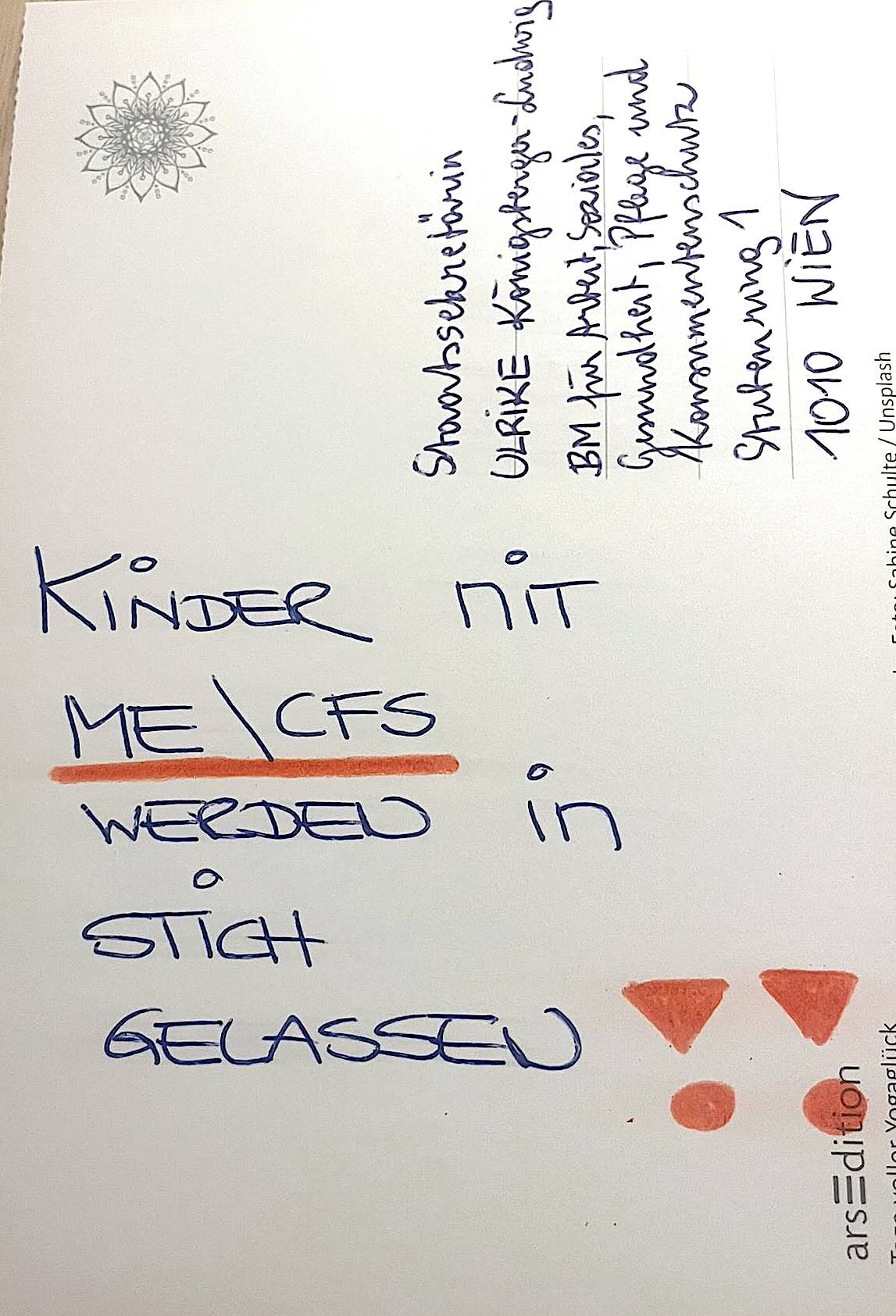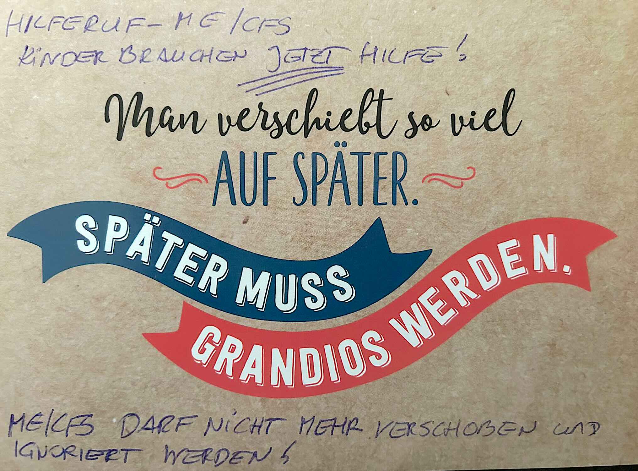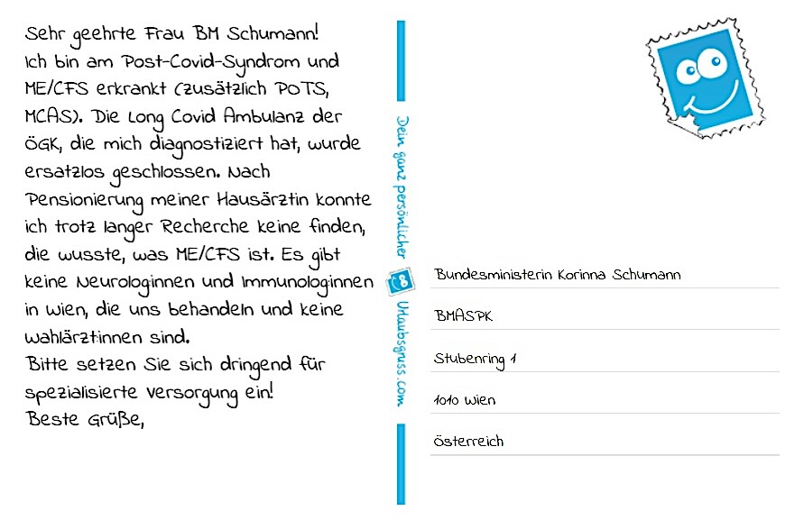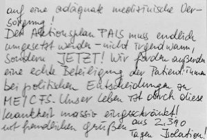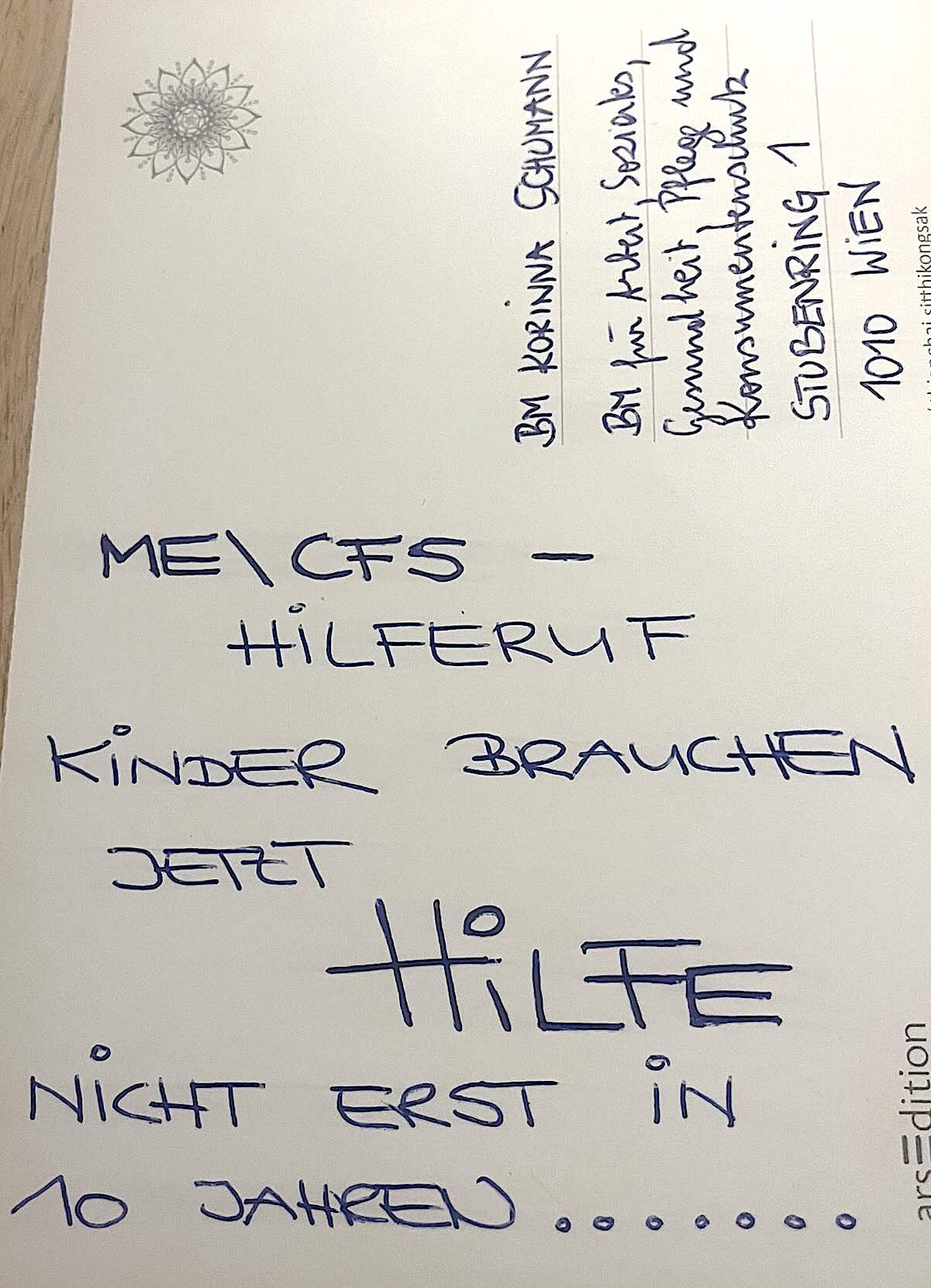 Um auf die Situation der Betroffenen – bedauerlicherweise erneut – aufmerksam zu machen, starten wir eine digitale Protestaktion in Form einer Postkartenaktion. Wir freuen uns über alle ME/CFS-Betroffene, Angehörige von Betroffenen oder nicht-Betroffene die sich an der Aktion beteiligen! Alle Infos zur Protestaktion gibt es hier.