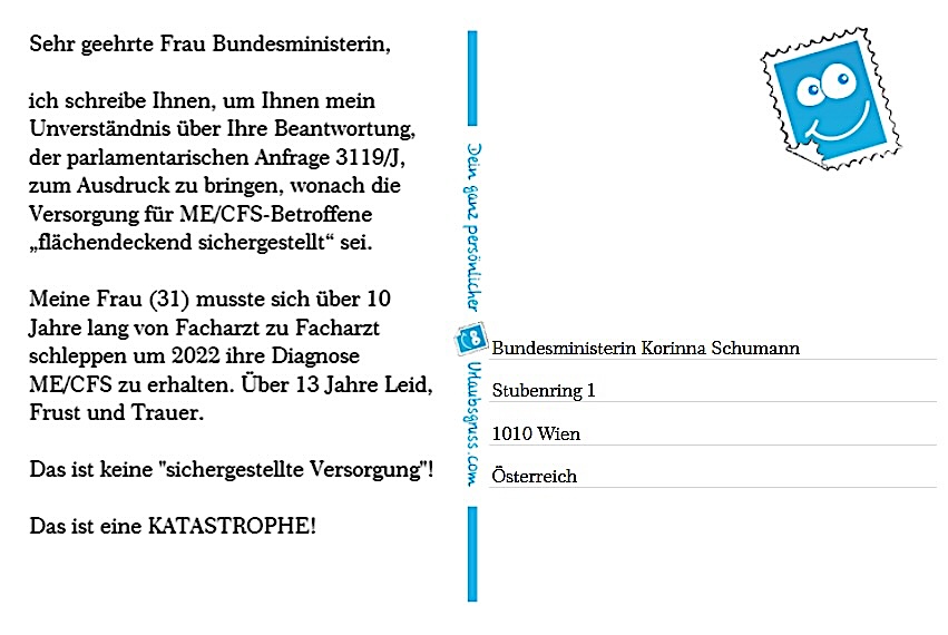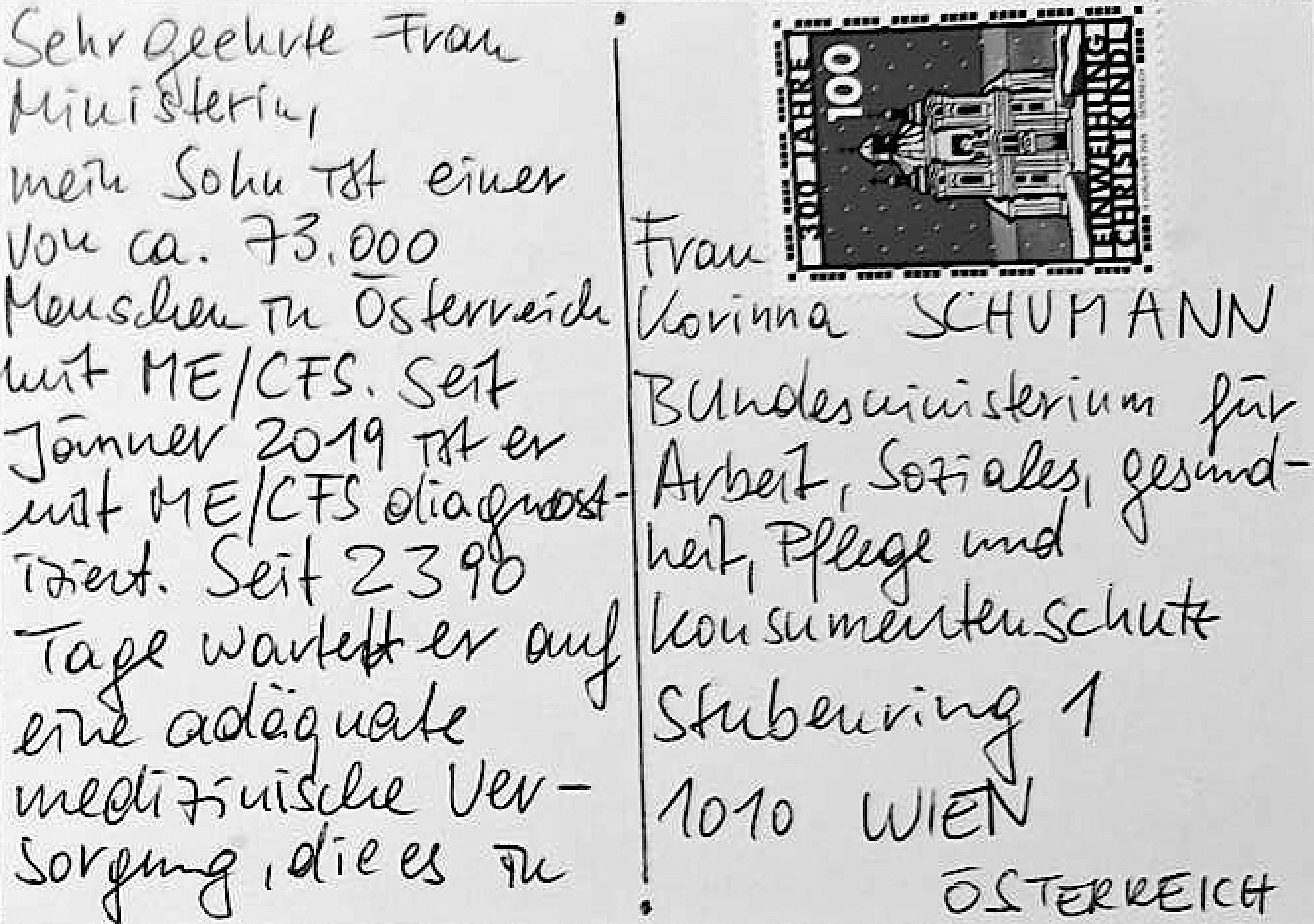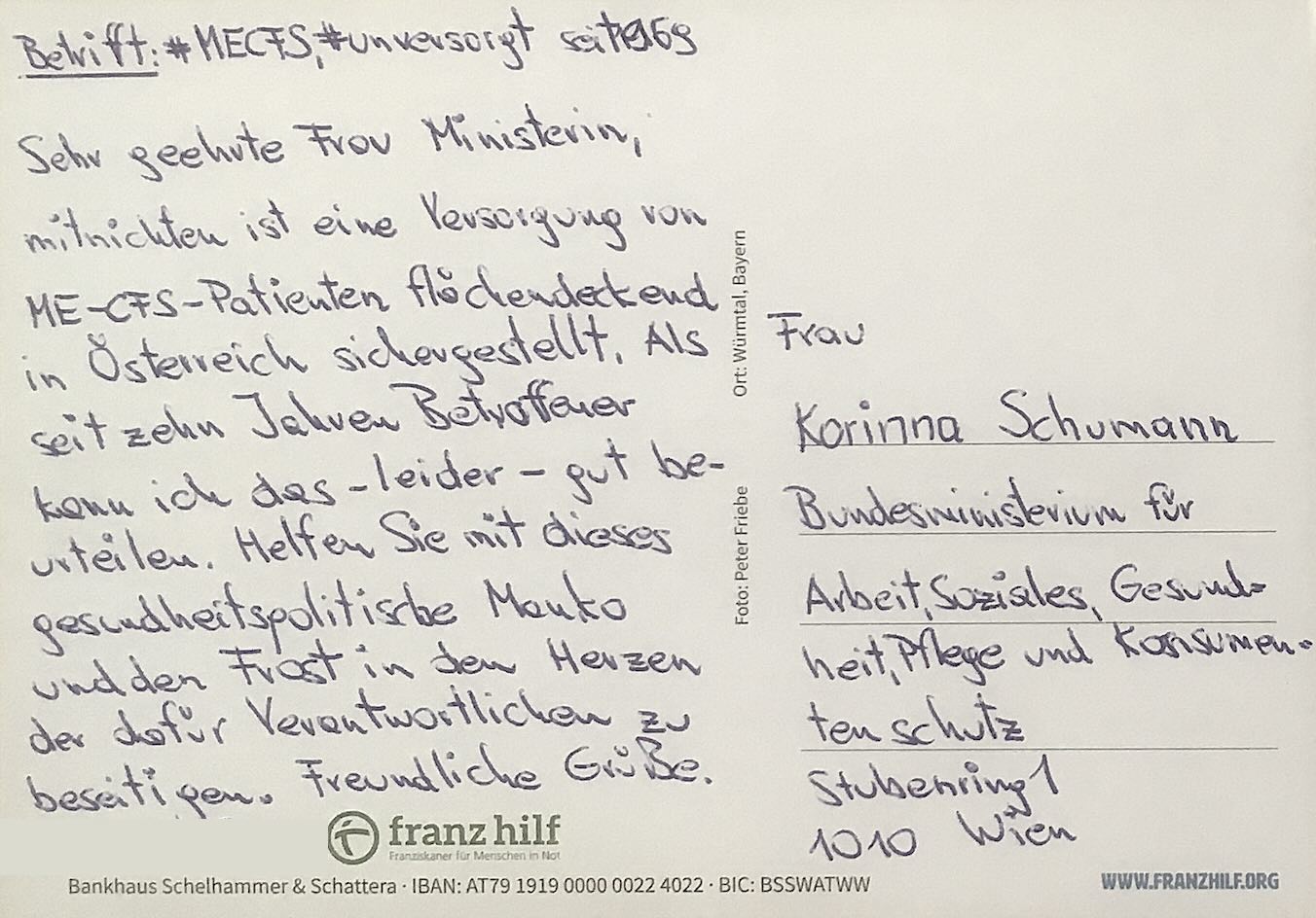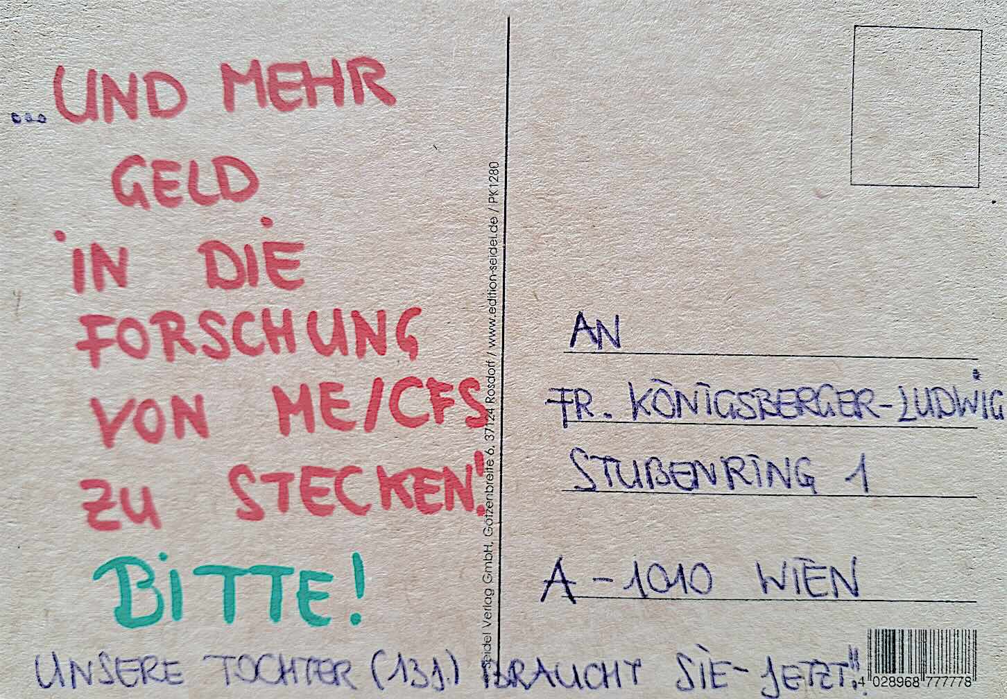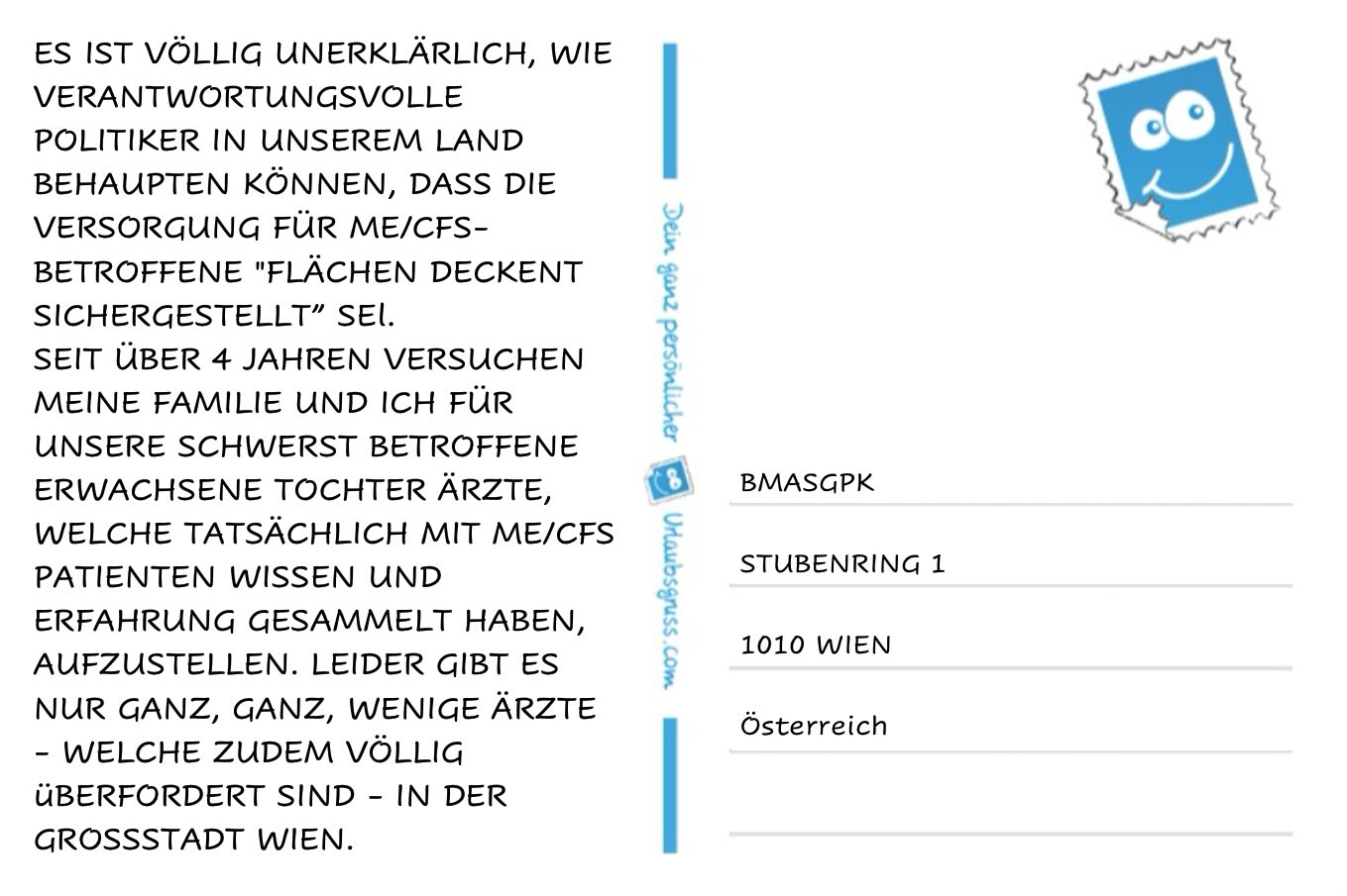 Um auf die Situation der Betroffenen – bedauerlicherweise erneut – aufmerksam zu machen, starten wir eine digitale Protestaktion in Form einer Postkartenaktion. Wir freuen uns über alle ME/CFS-Betroffene, Angehörige von Betroffenen oder nicht-Betroffene die sich an der Aktion beteiligen! Alle Infos zur Protestaktion gibt es hier.