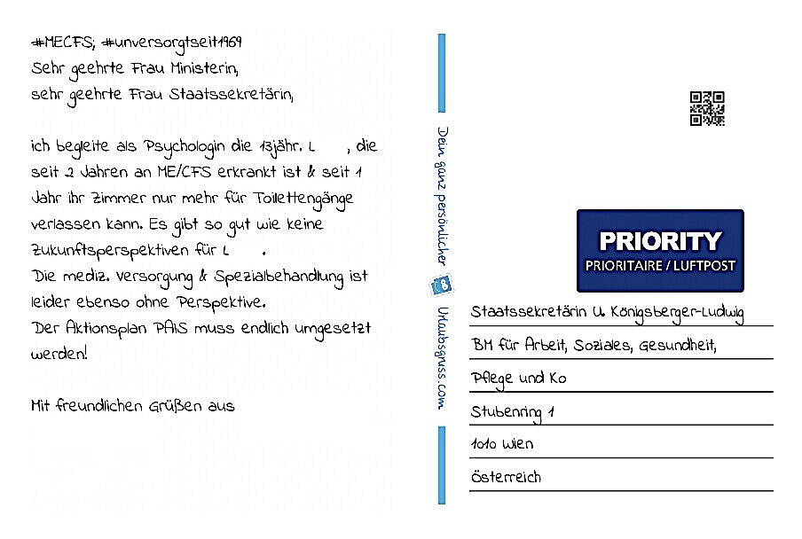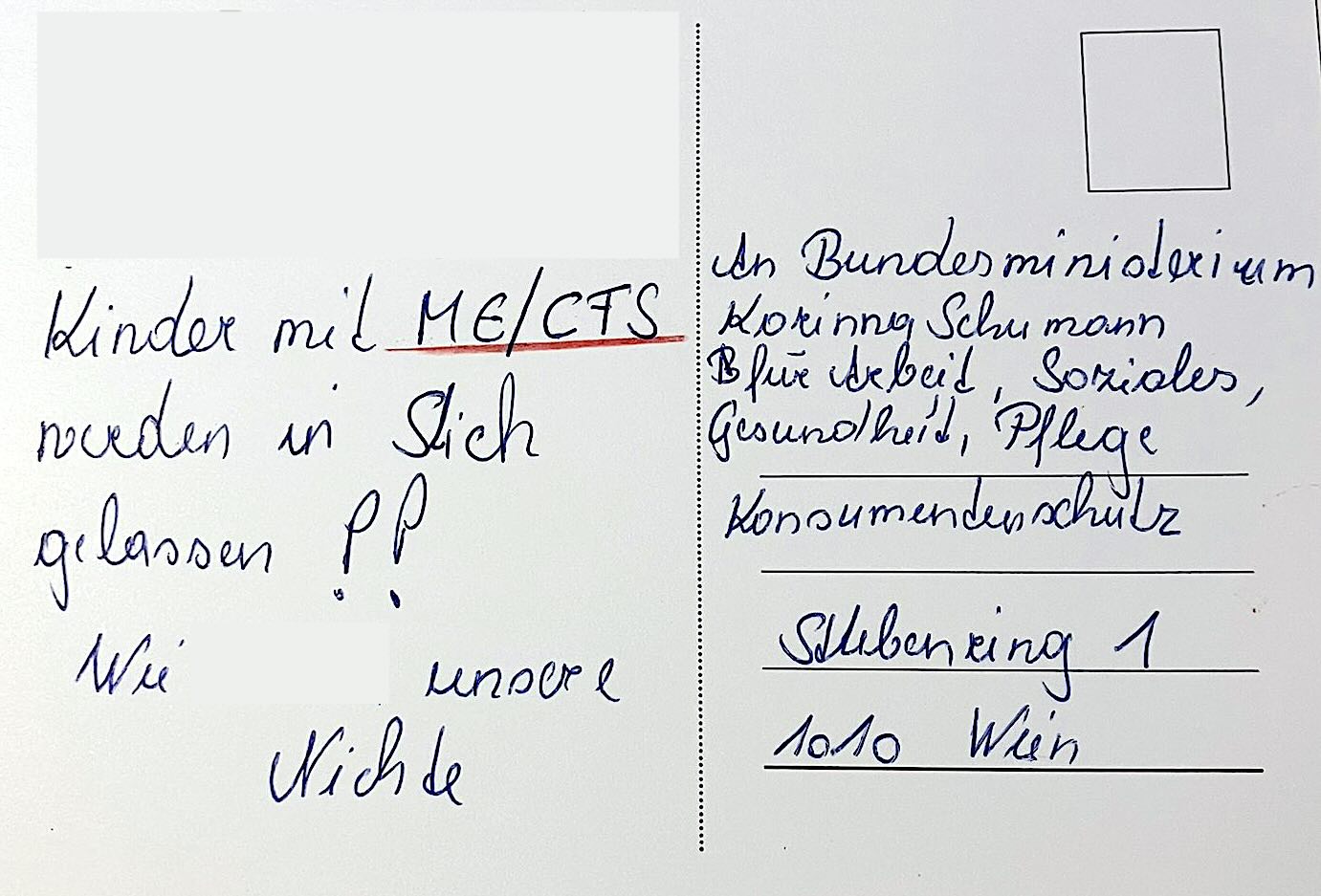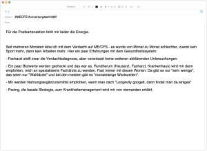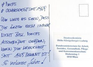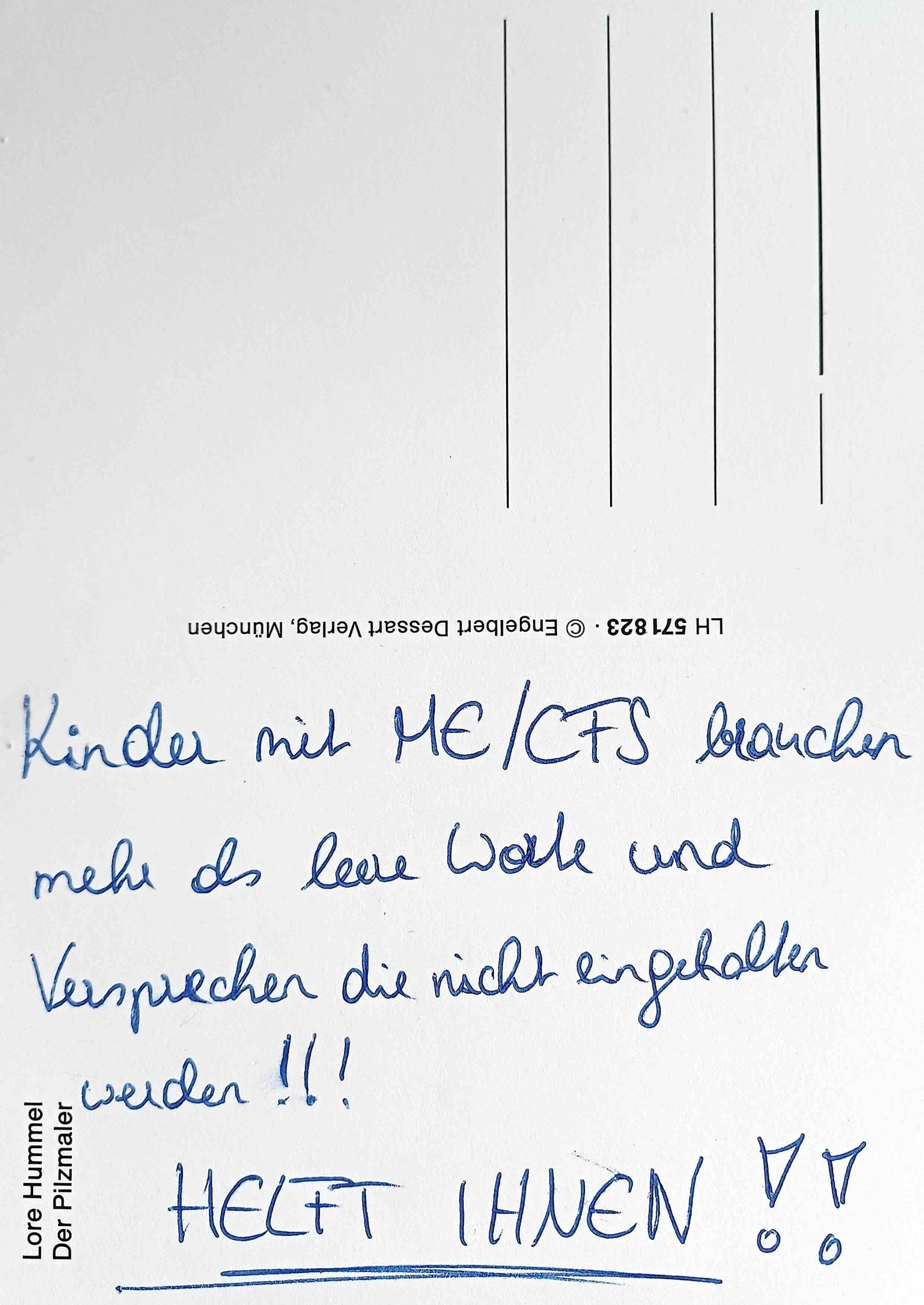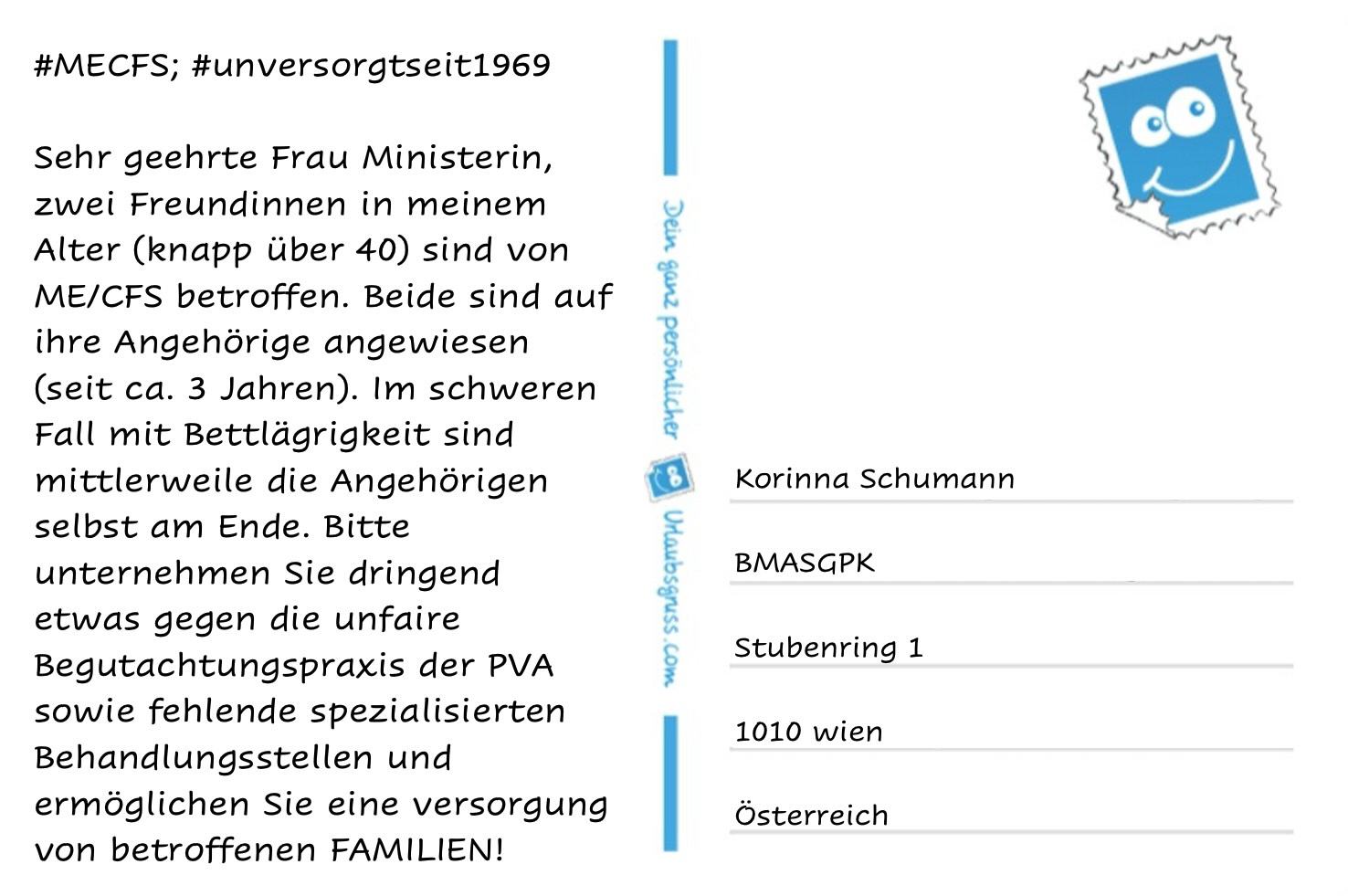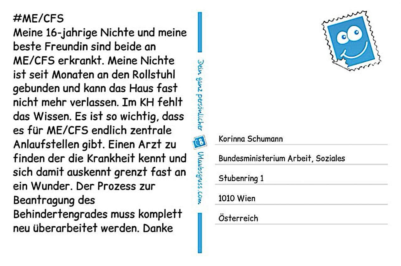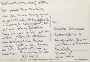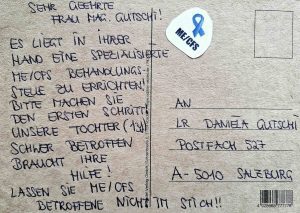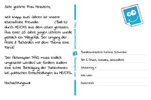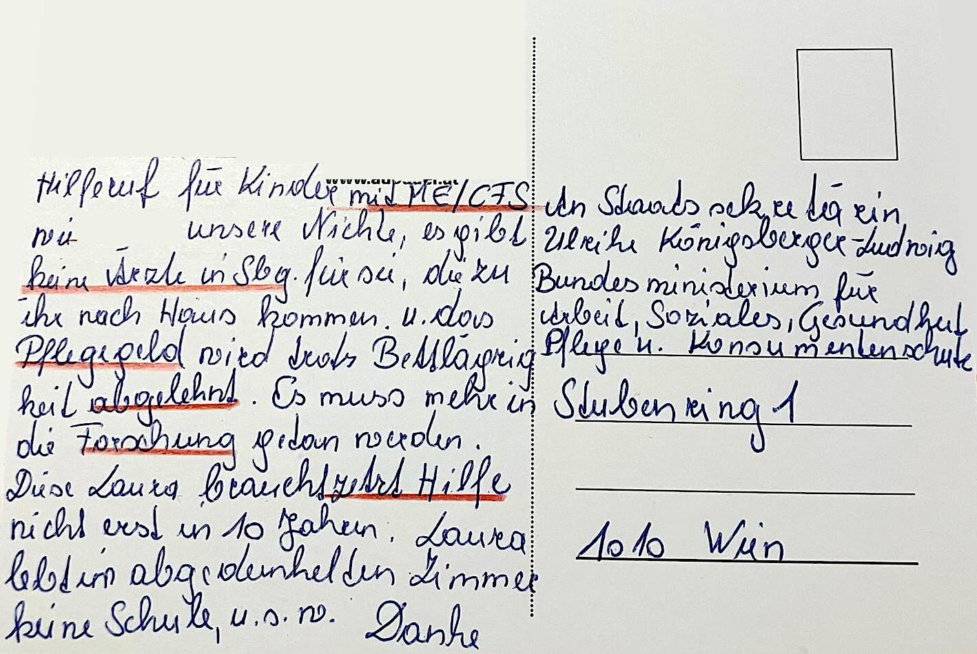 Um auf die Situation der Betroffenen – bedauerlicherweise erneut – aufmerksam zu machen, starten wir eine digitale Protestaktion in Form einer Postkartenaktion. Wir freuen uns über alle ME/CFS-Betroffene, Angehörige von Betroffenen oder nicht-Betroffene die sich an der Aktion beteiligen! Alle Infos zur Protestaktion gibt es hier.