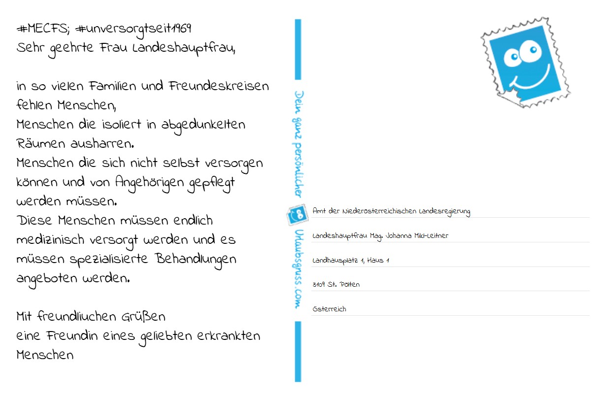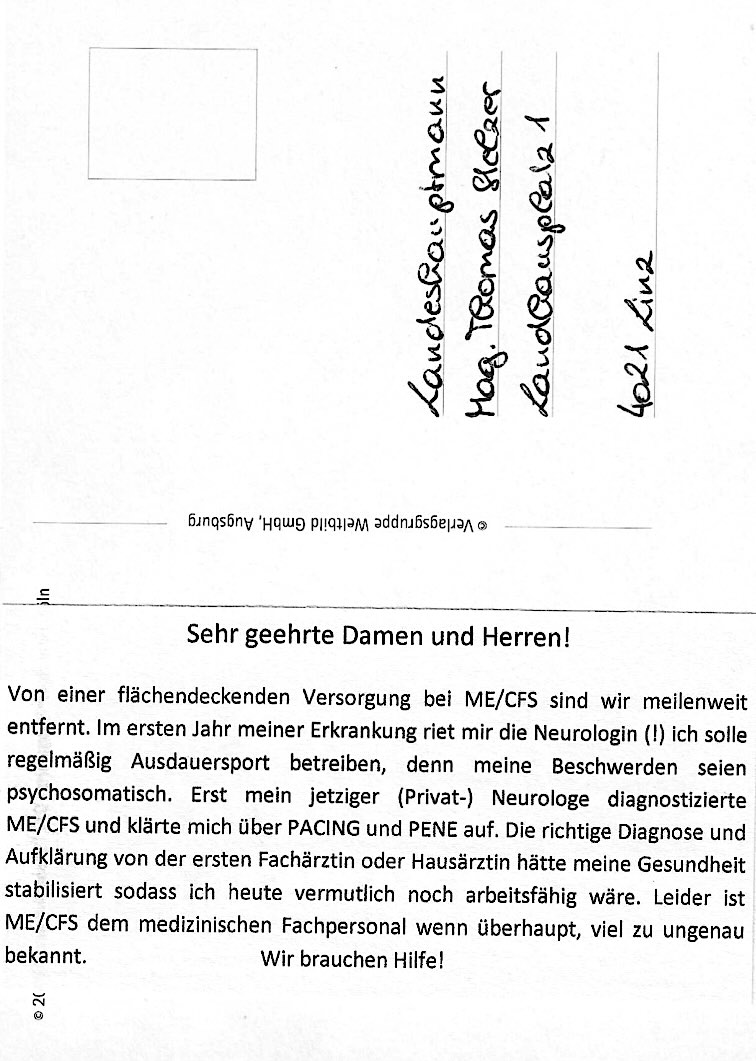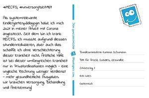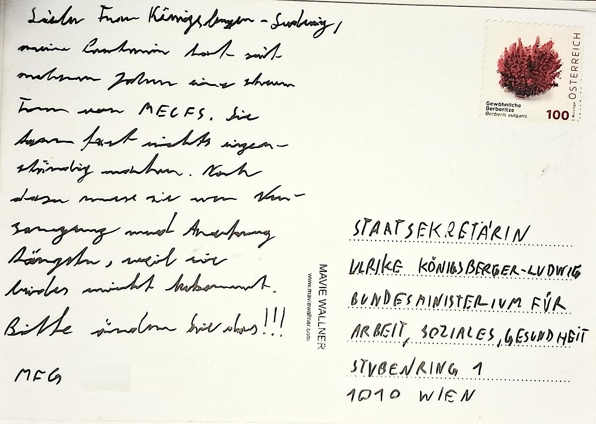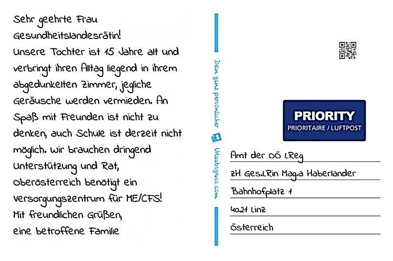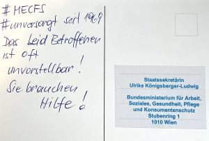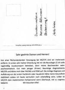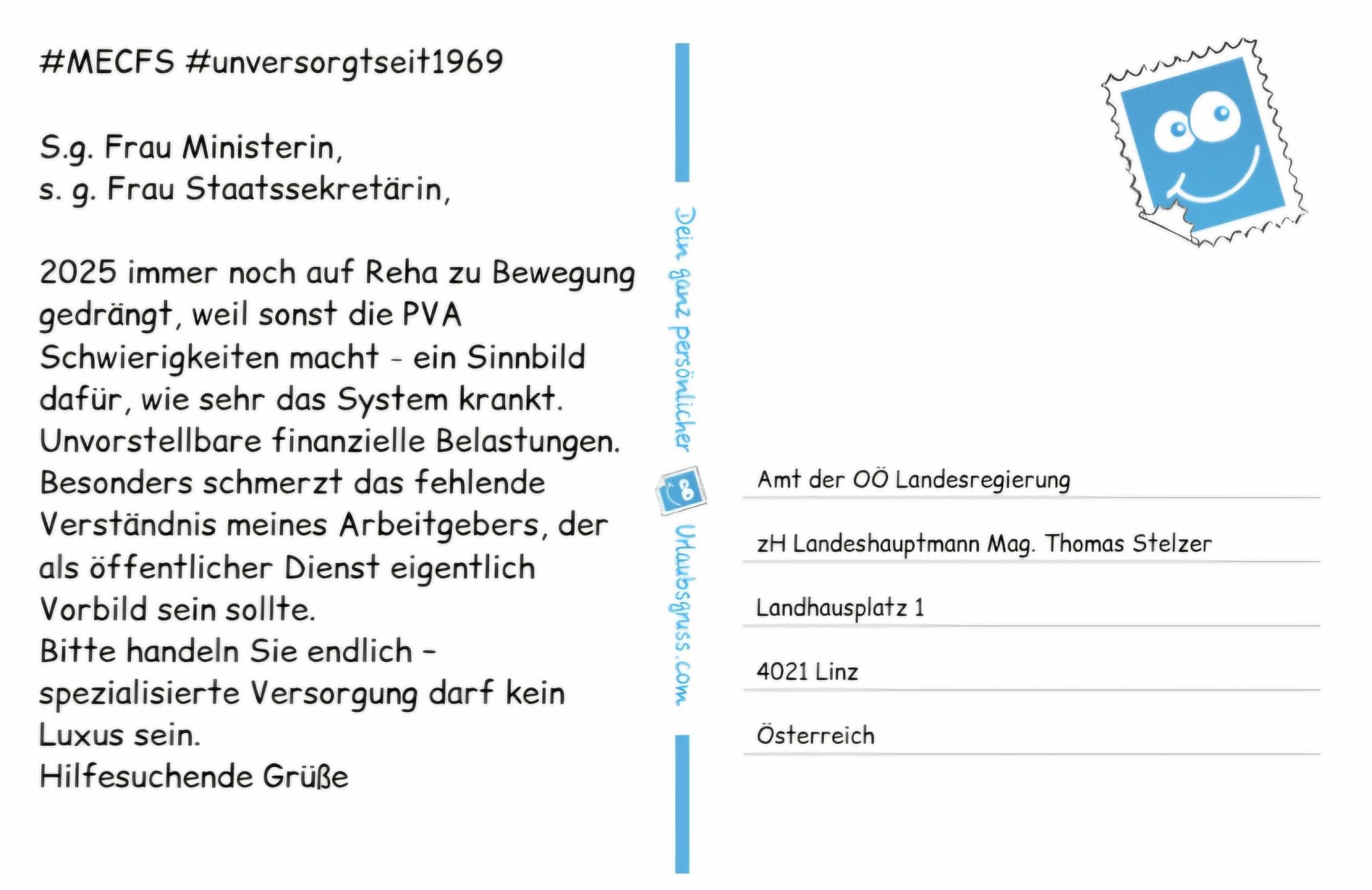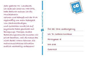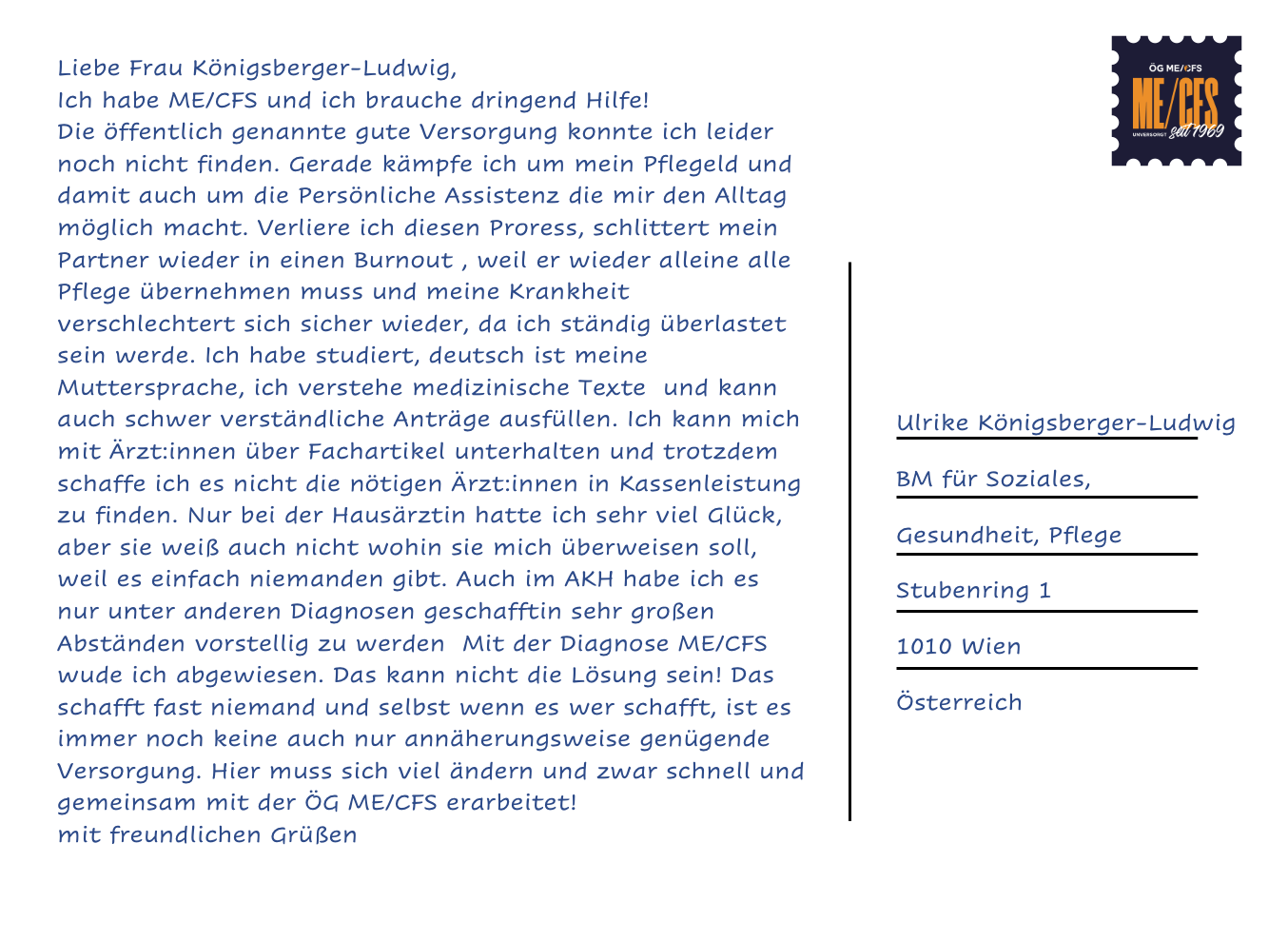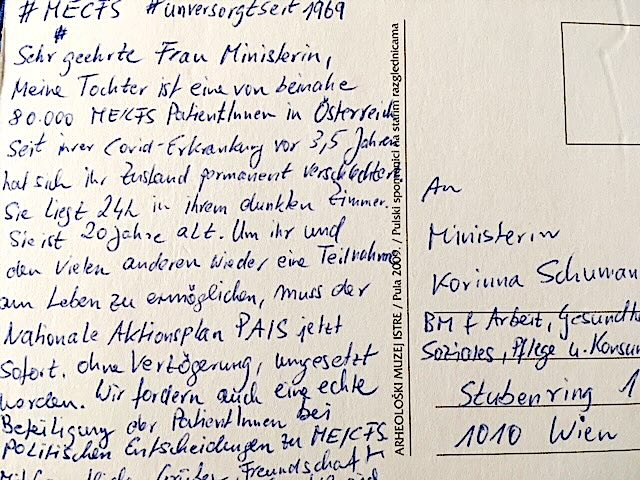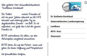 Um auf die Situation der Betroffenen – bedauerlicherweise erneut – aufmerksam zu machen, starten wir eine digitale Protestaktion in Form einer Postkartenaktion. Wir freuen uns über alle ME/CFS-Betroffene, Angehörige von Betroffenen oder nicht-Betroffene die sich an der Aktion beteiligen! Alle Infos zur Protestaktion gibt es hier.