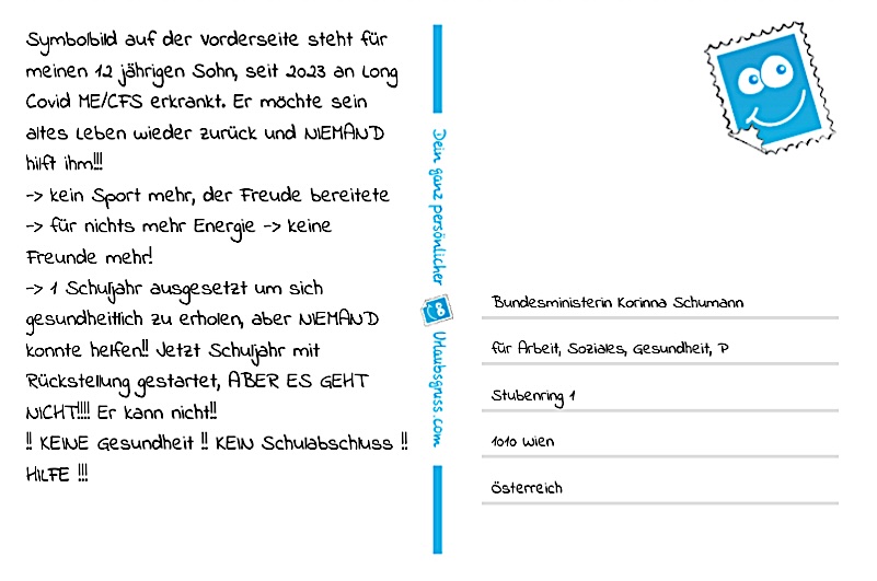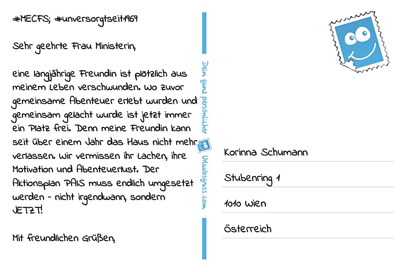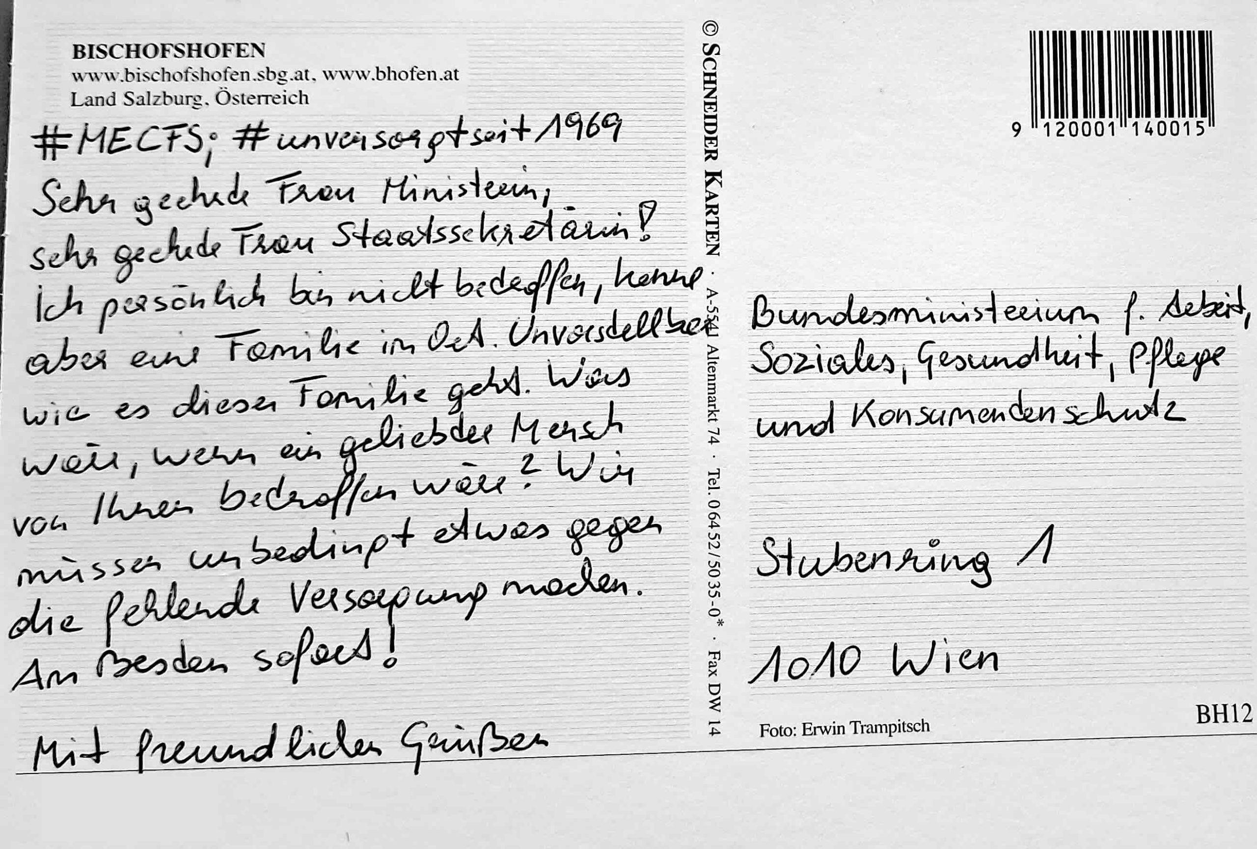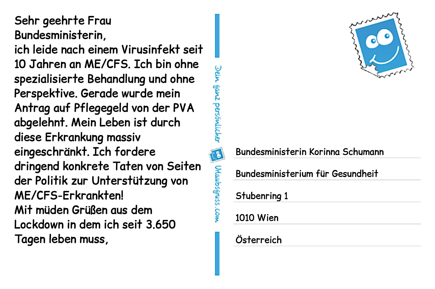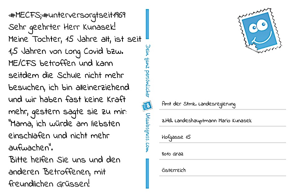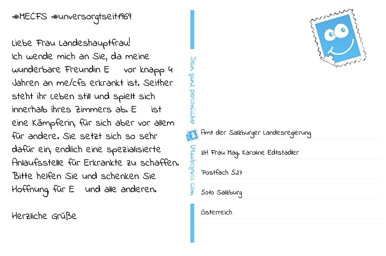 Um auf die Situation der Betroffenen – bedauerlicherweise erneut – aufmerksam zu machen, starten wir eine digitale Protestaktion in Form einer Postkartenaktion. Wir freuen uns über alle ME/CFS-Betroffene, Angehörige von Betroffenen oder nicht-Betroffene die sich an der Aktion beteiligen! Alle Infos zur Protestaktion gibt es hier.