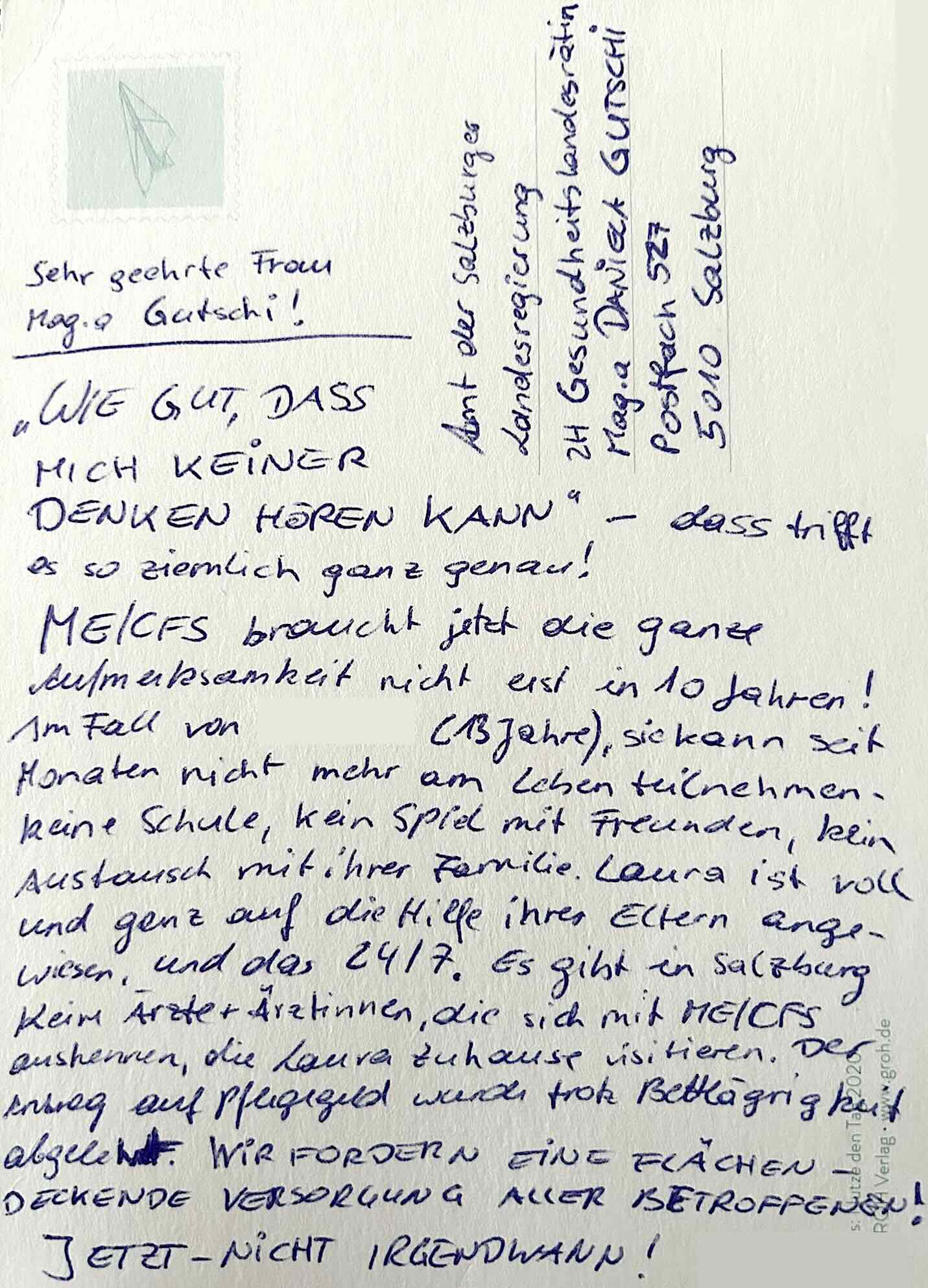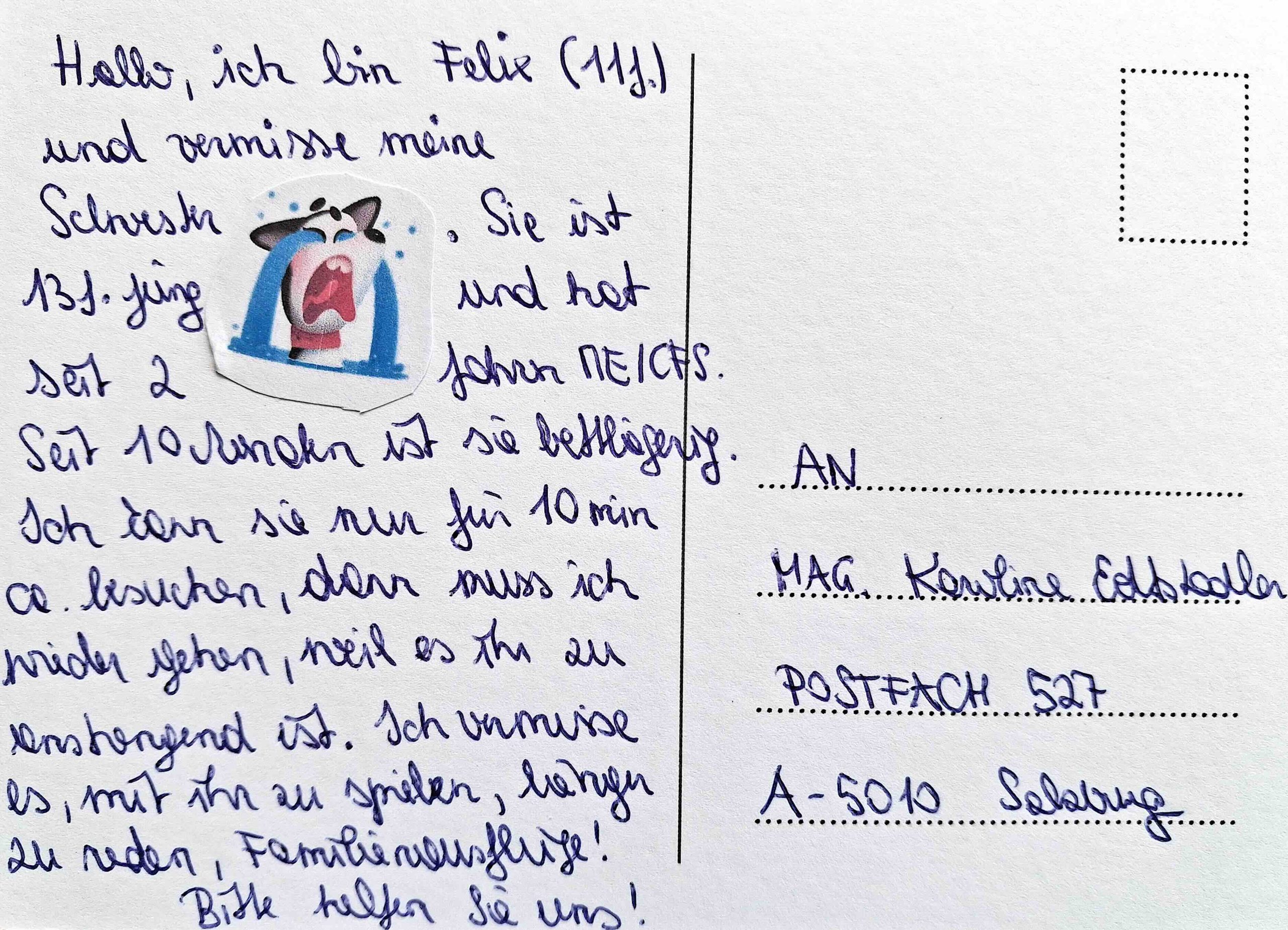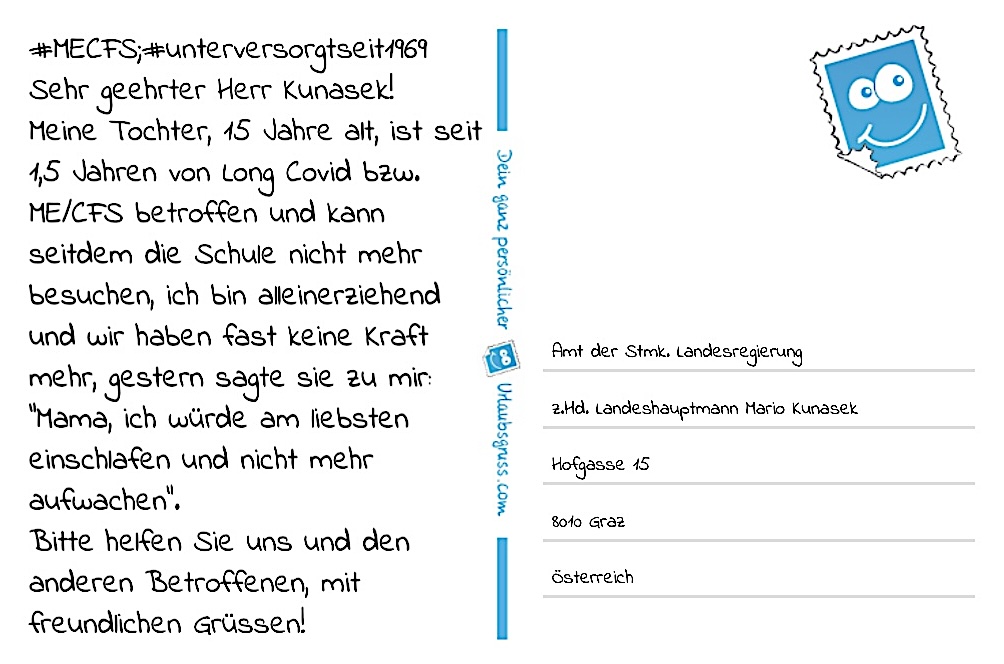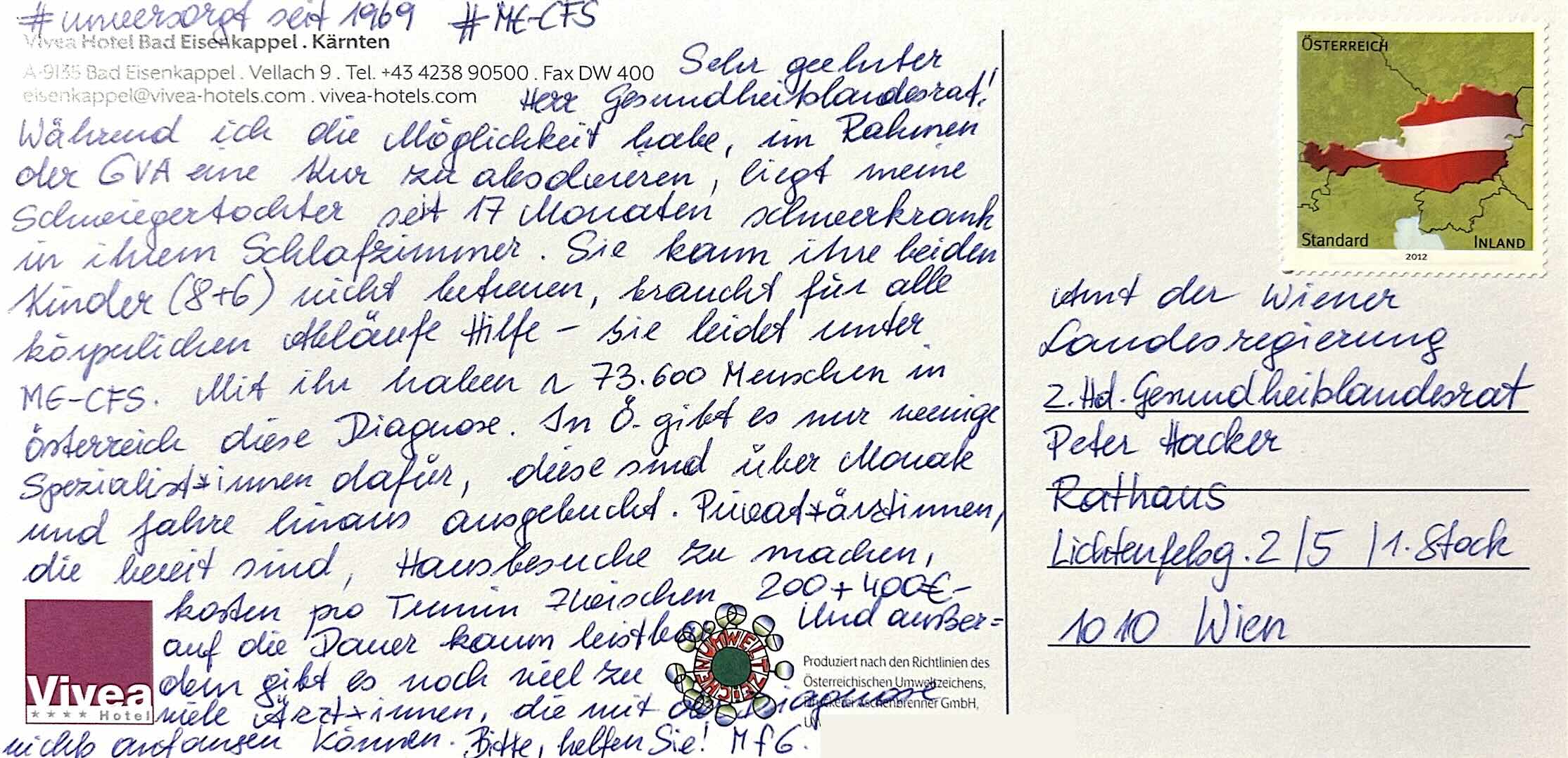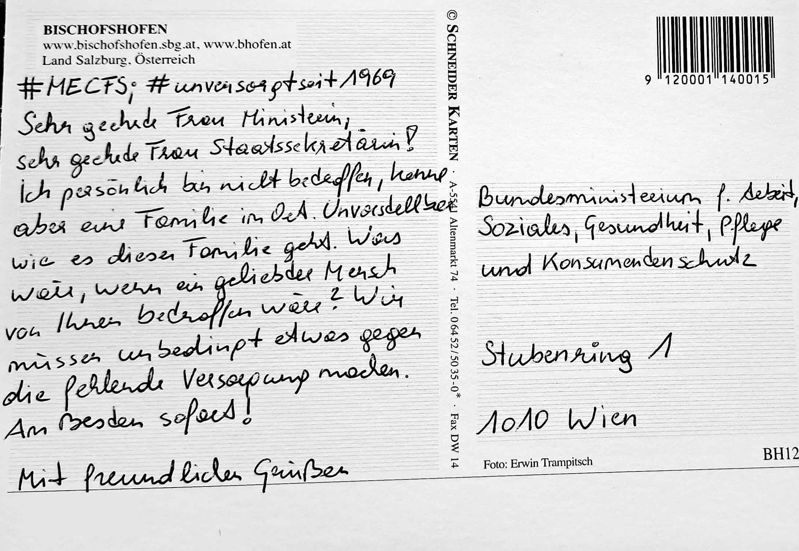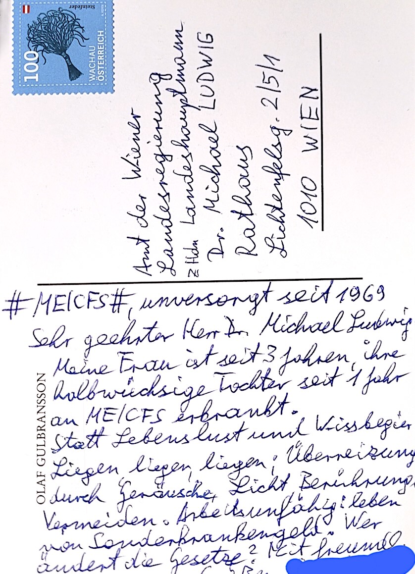 Um auf die Situation der Betroffenen – bedauerlicherweise erneut – aufmerksam zu machen, starten wir eine digitale Protestaktion in Form einer Postkartenaktion. Wir freuen uns über alle ME/CFS-Betroffene, Angehörige von Betroffenen oder nicht-Betroffene die sich an der Aktion beteiligen! Alle Infos zur Protestaktion gibt es hier.