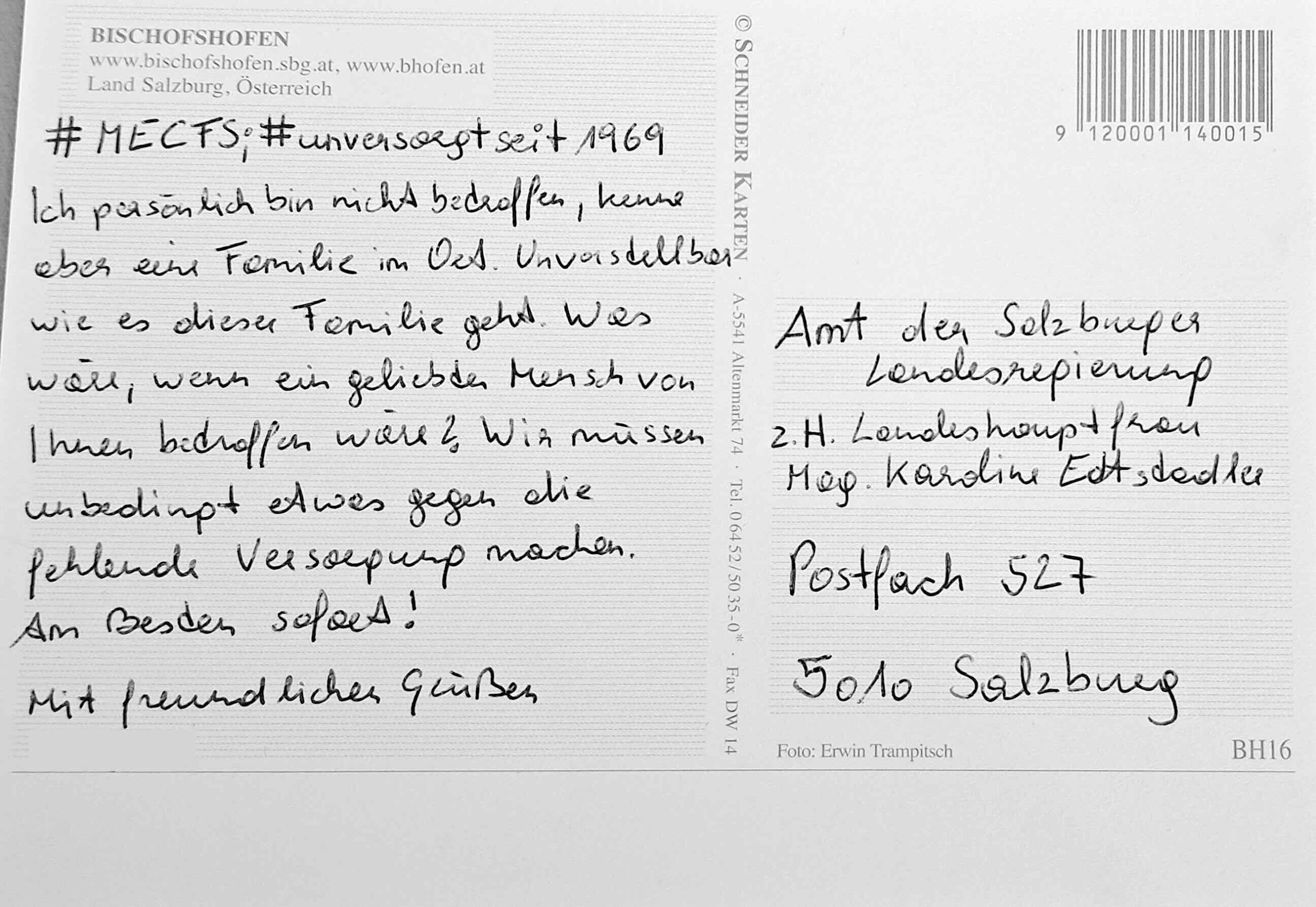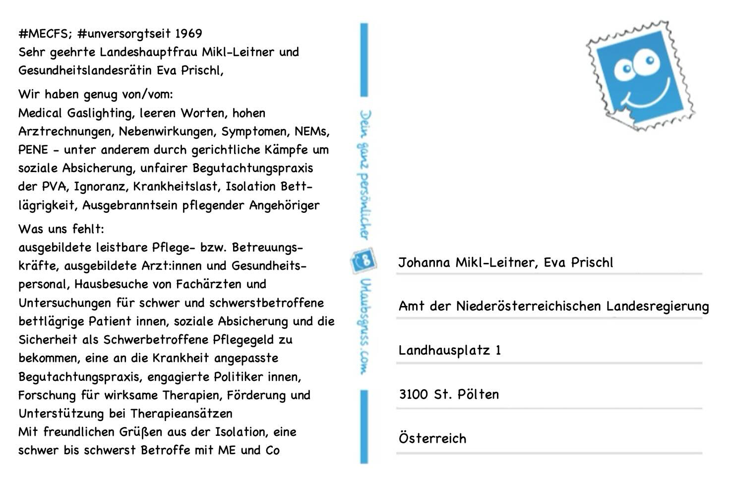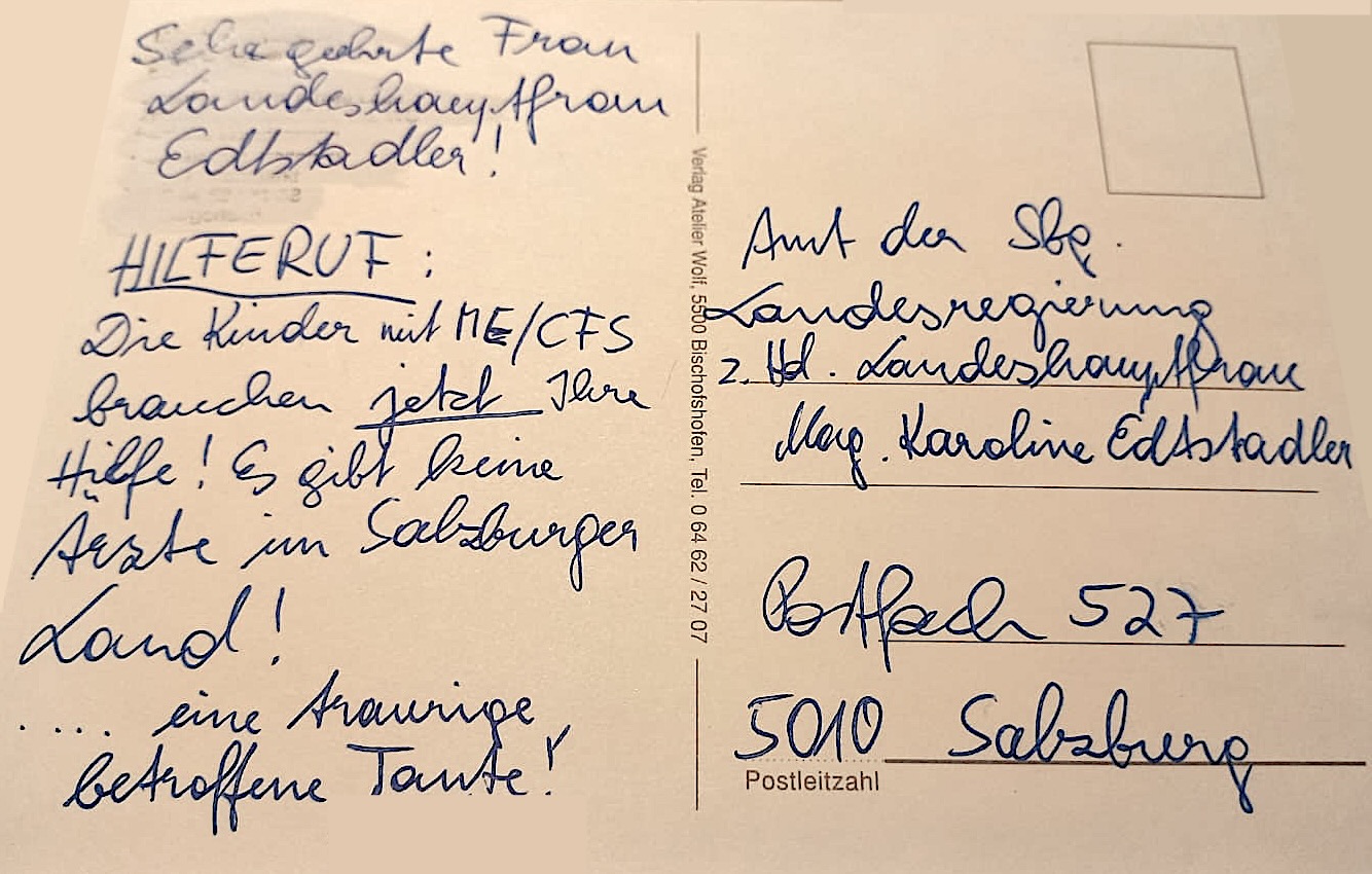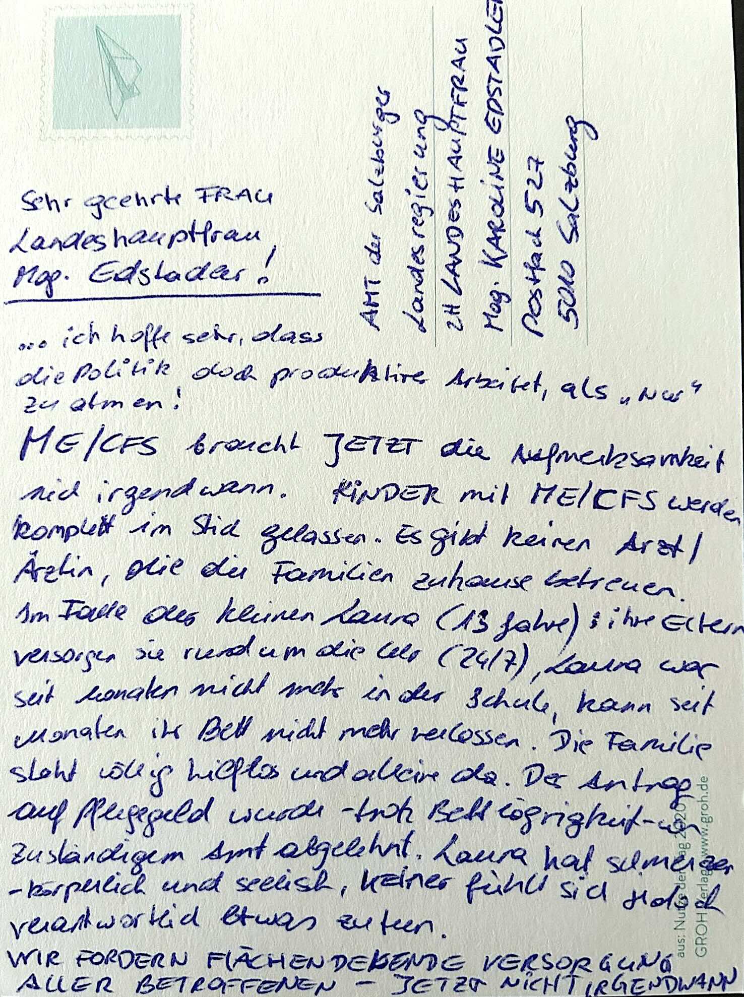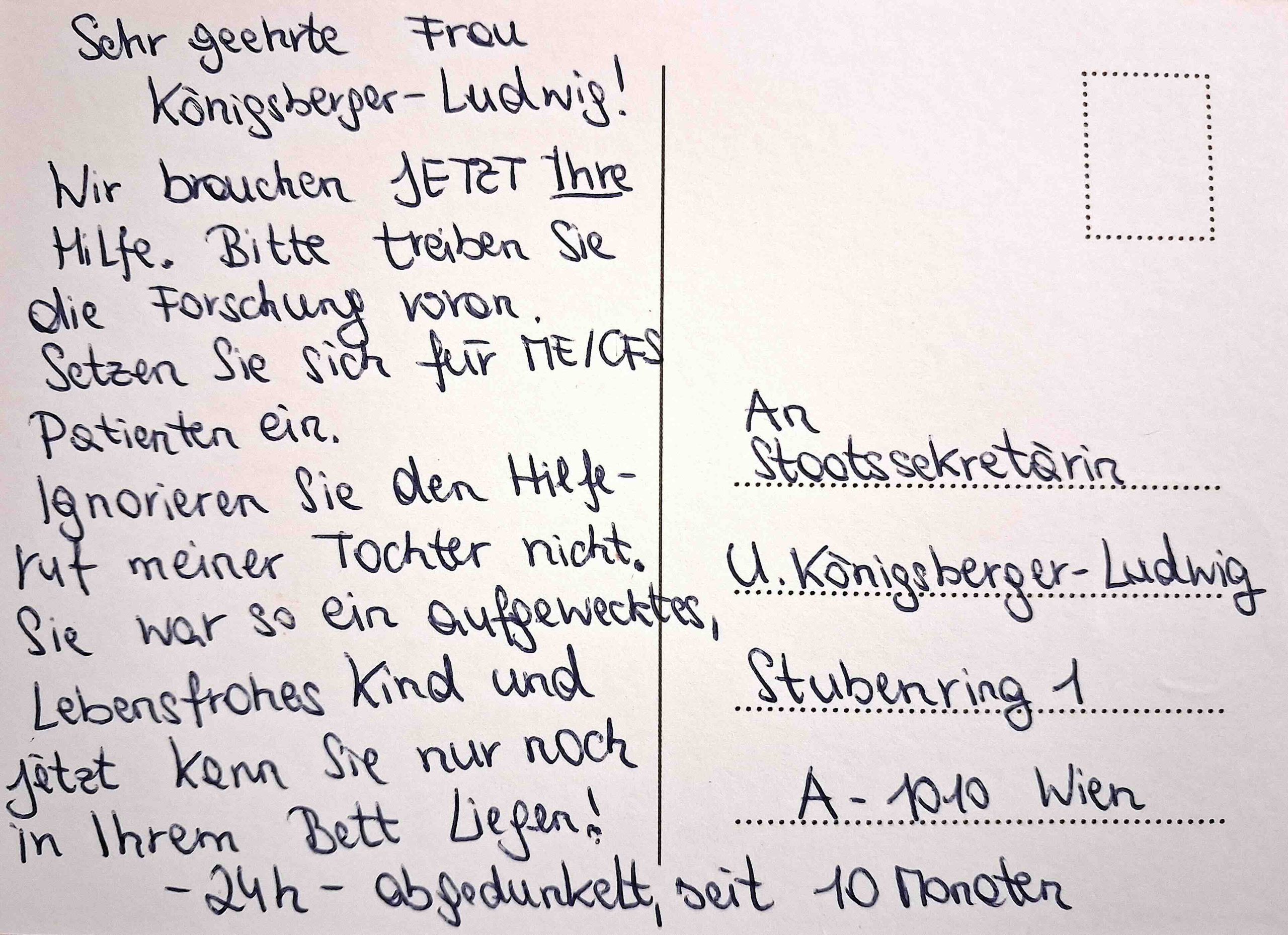Um auf die Situation der Betroffenen – bedauerlicherweise erneut – aufmerksam zu machen, starten wir eine digitale Protestaktion in Form einer Postkartenaktion. Wir freuen uns über alle ME/CFS-Betroffene, Angehörige von Betroffenen oder nicht-Betroffene die sich an der Aktion beteiligen! Alle Infos zur Protestaktion gibt es hier.