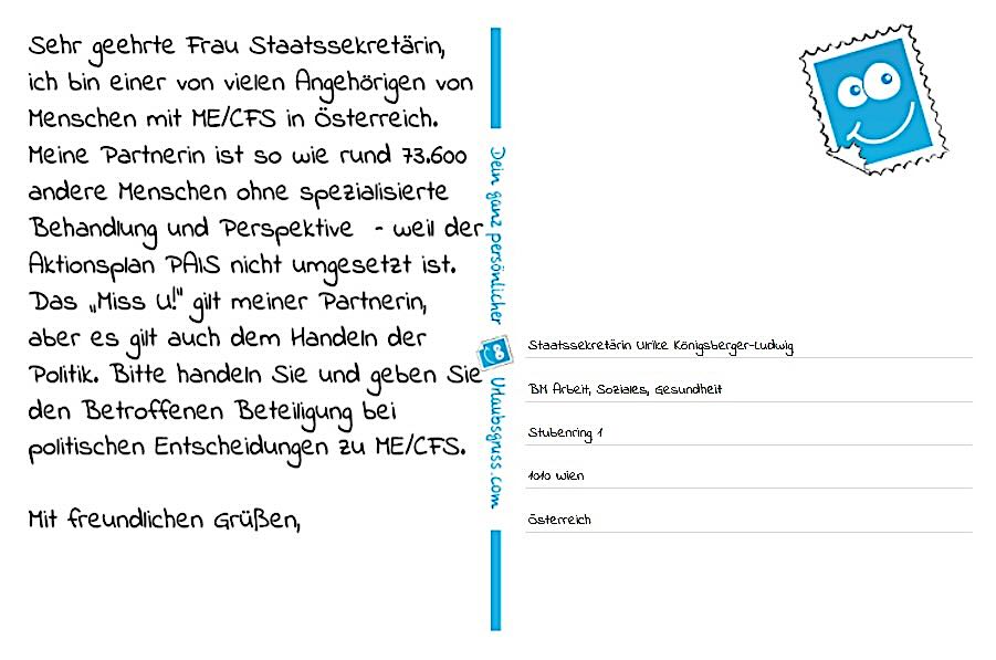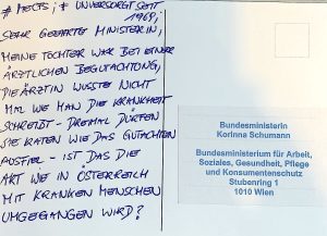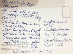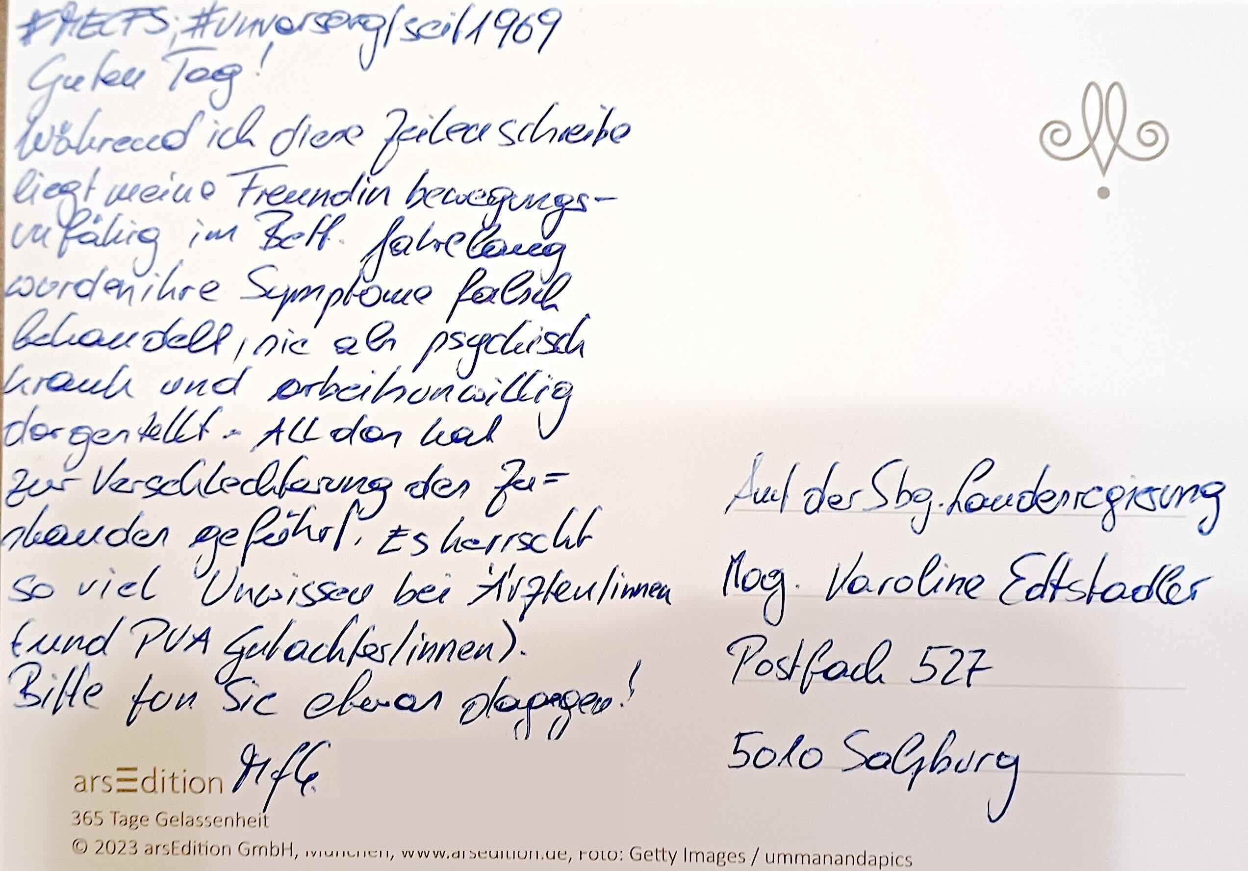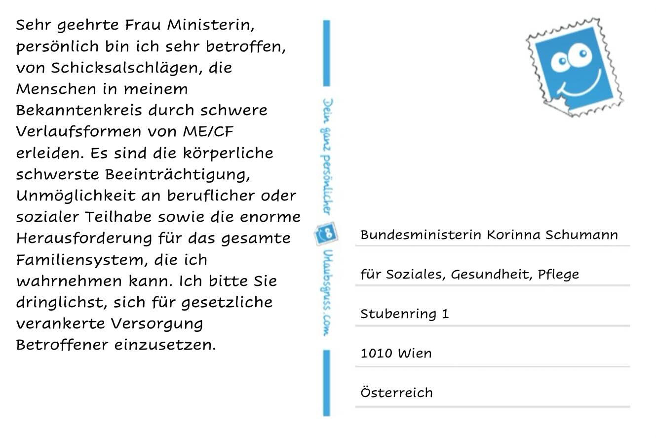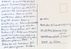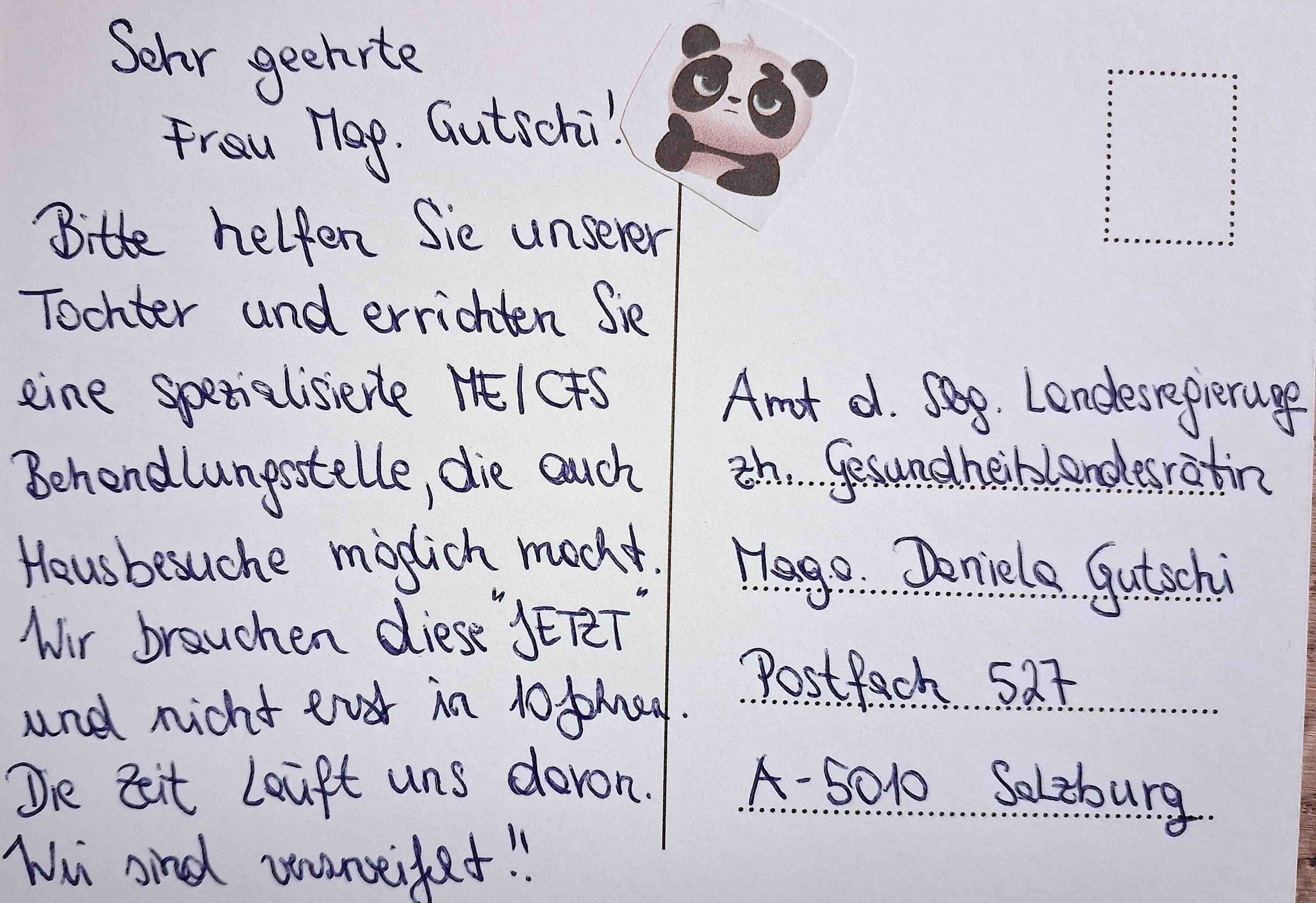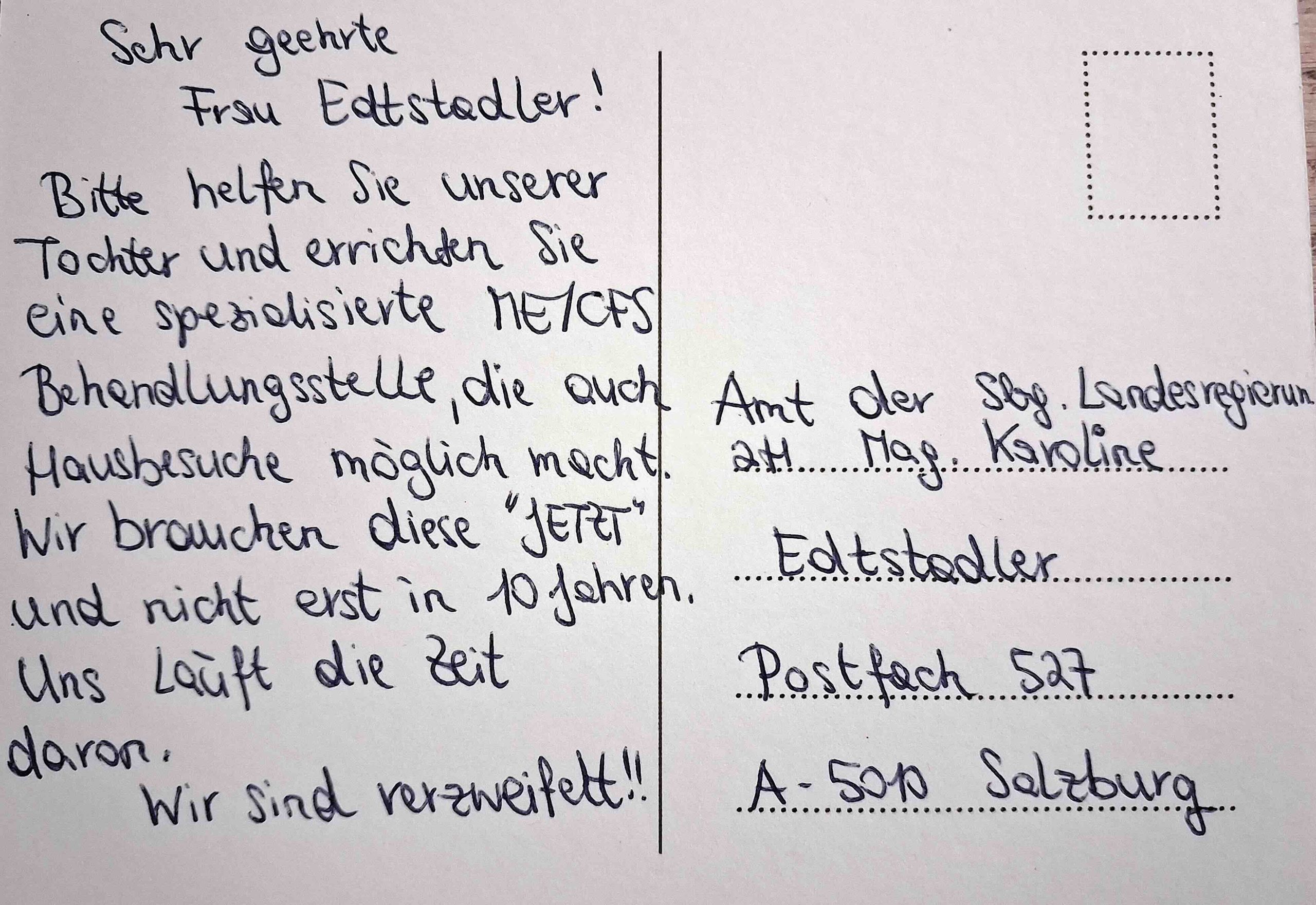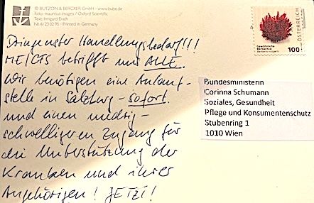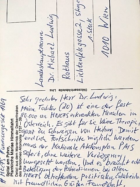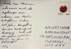 Um auf die Situation der Betroffenen – bedauerlicherweise erneut – aufmerksam zu machen, starten wir eine digitale Protestaktion in Form einer Postkartenaktion. Wir freuen uns über alle ME/CFS-Betroffene, Angehörige von Betroffenen oder nicht-Betroffene die sich an der Aktion beteiligen! Alle Infos zur Protestaktion gibt es hier.