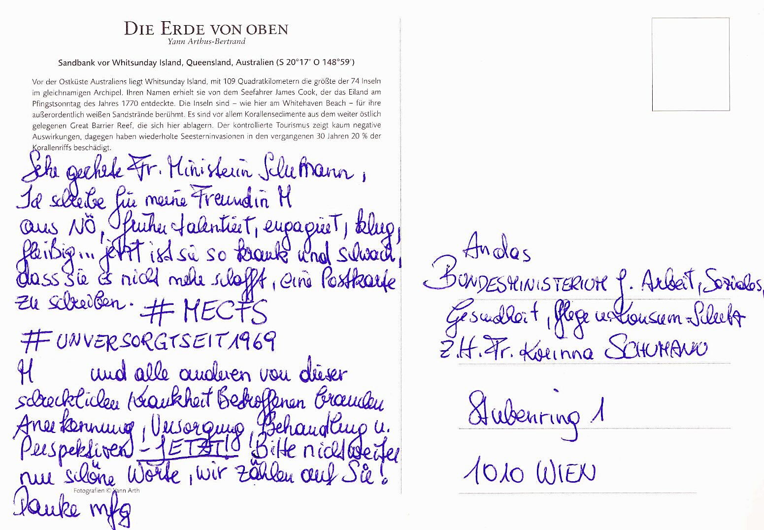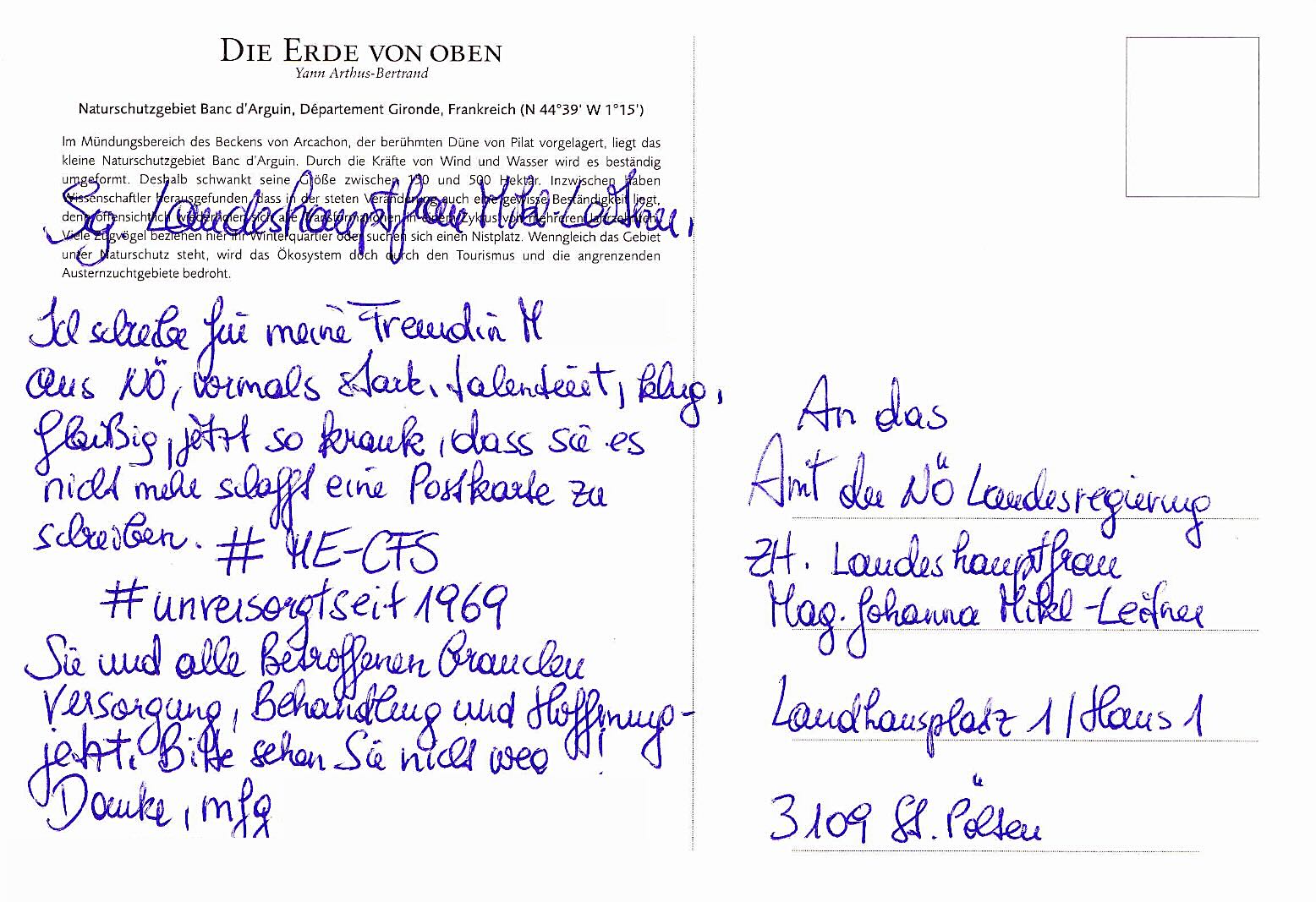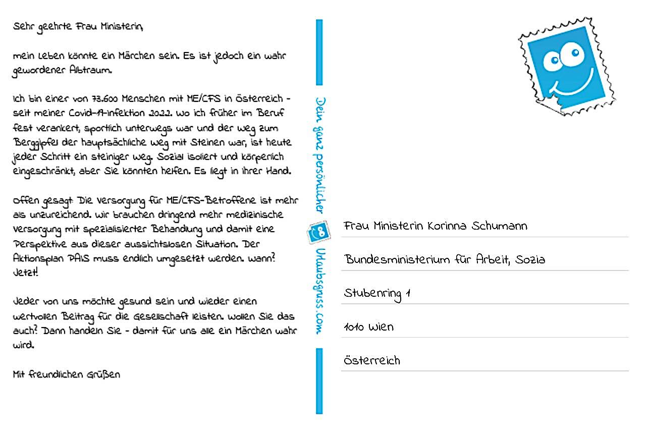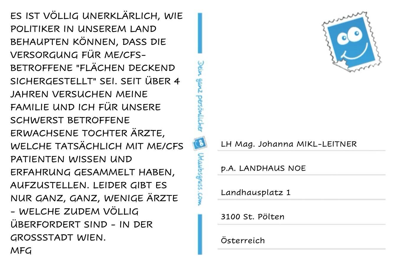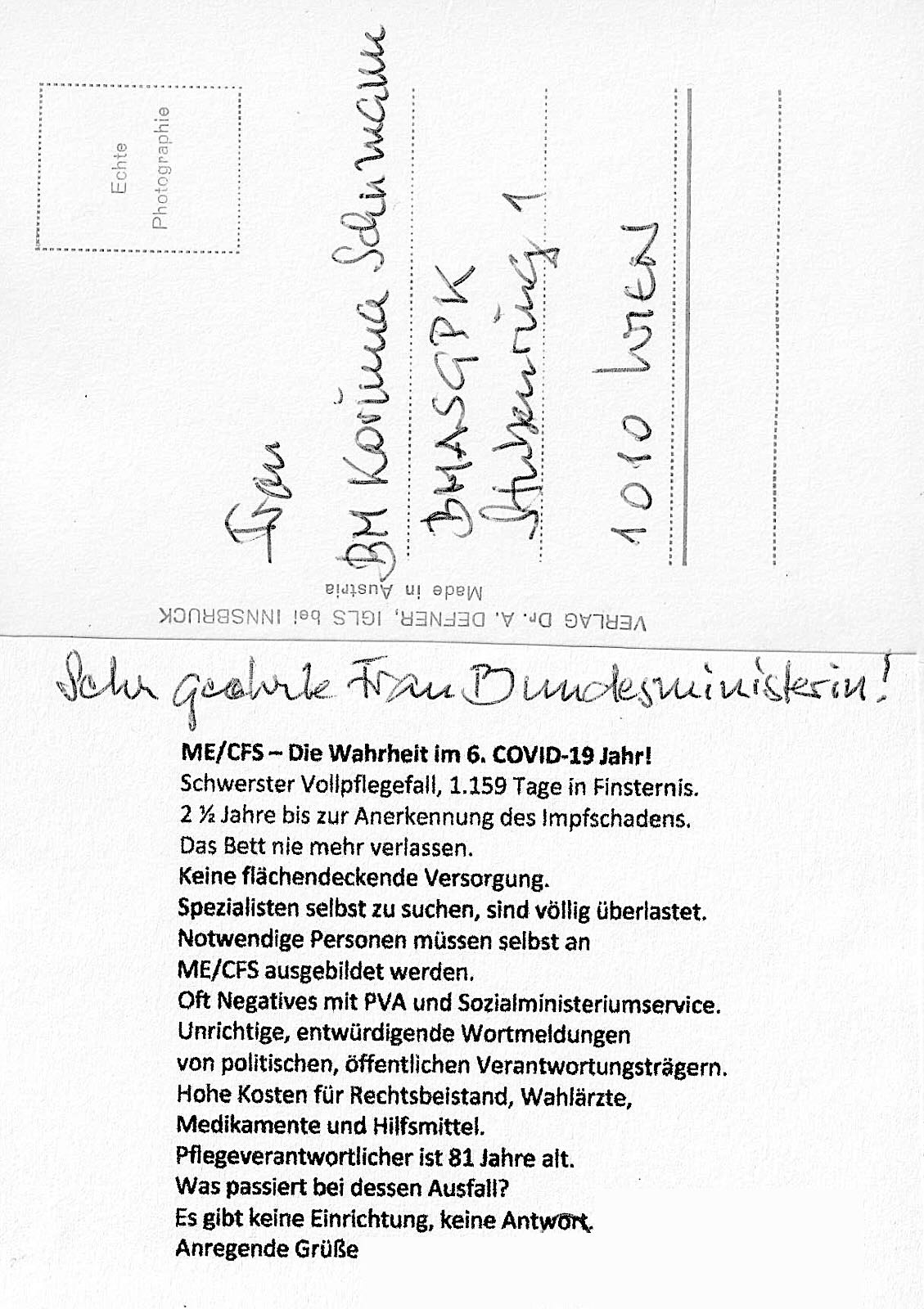 Um auf die Situation der Betroffenen – bedauerlicherweise erneut – aufmerksam zu machen, starten wir eine digitale Protestaktion in Form einer Postkartenaktion. Wir freuen uns über alle ME/CFS-Betroffene, Angehörige von Betroffenen oder nicht-Betroffene die sich an der Aktion beteiligen! Alle Infos zur Protestaktion gibt es hier.