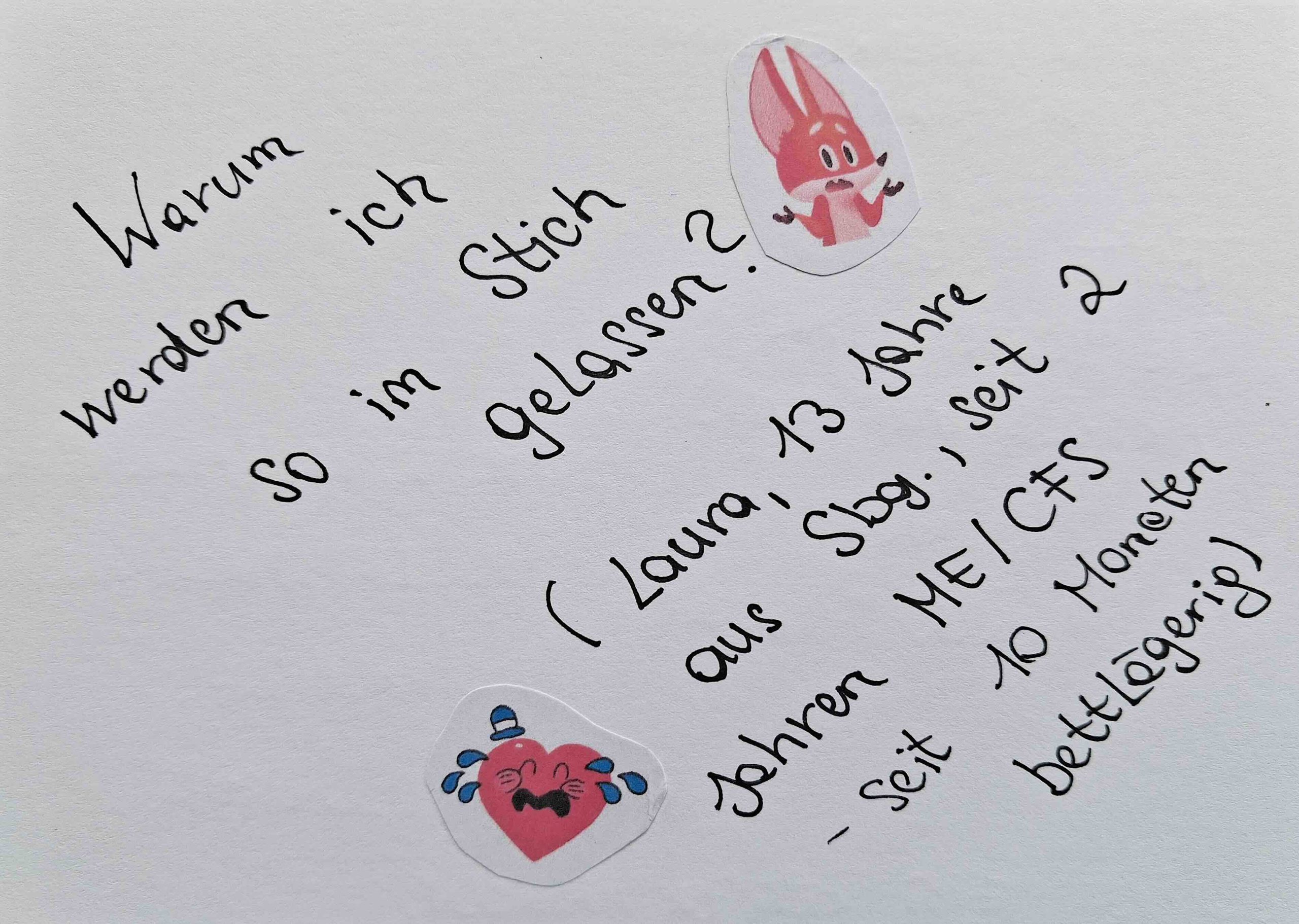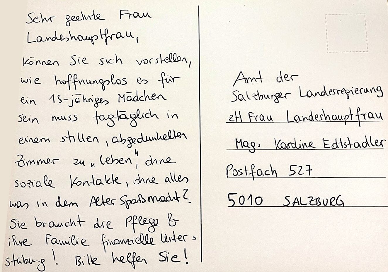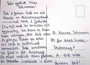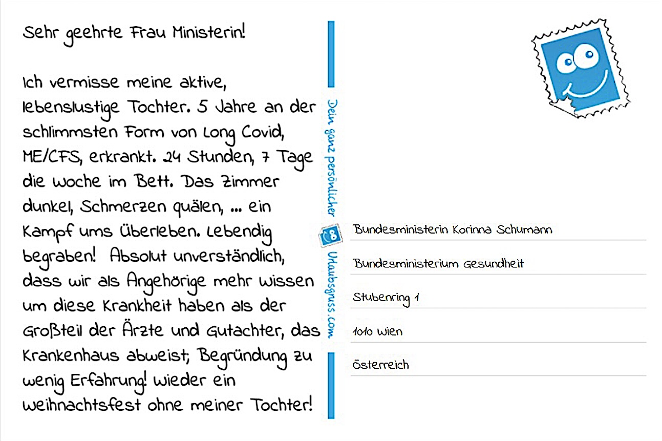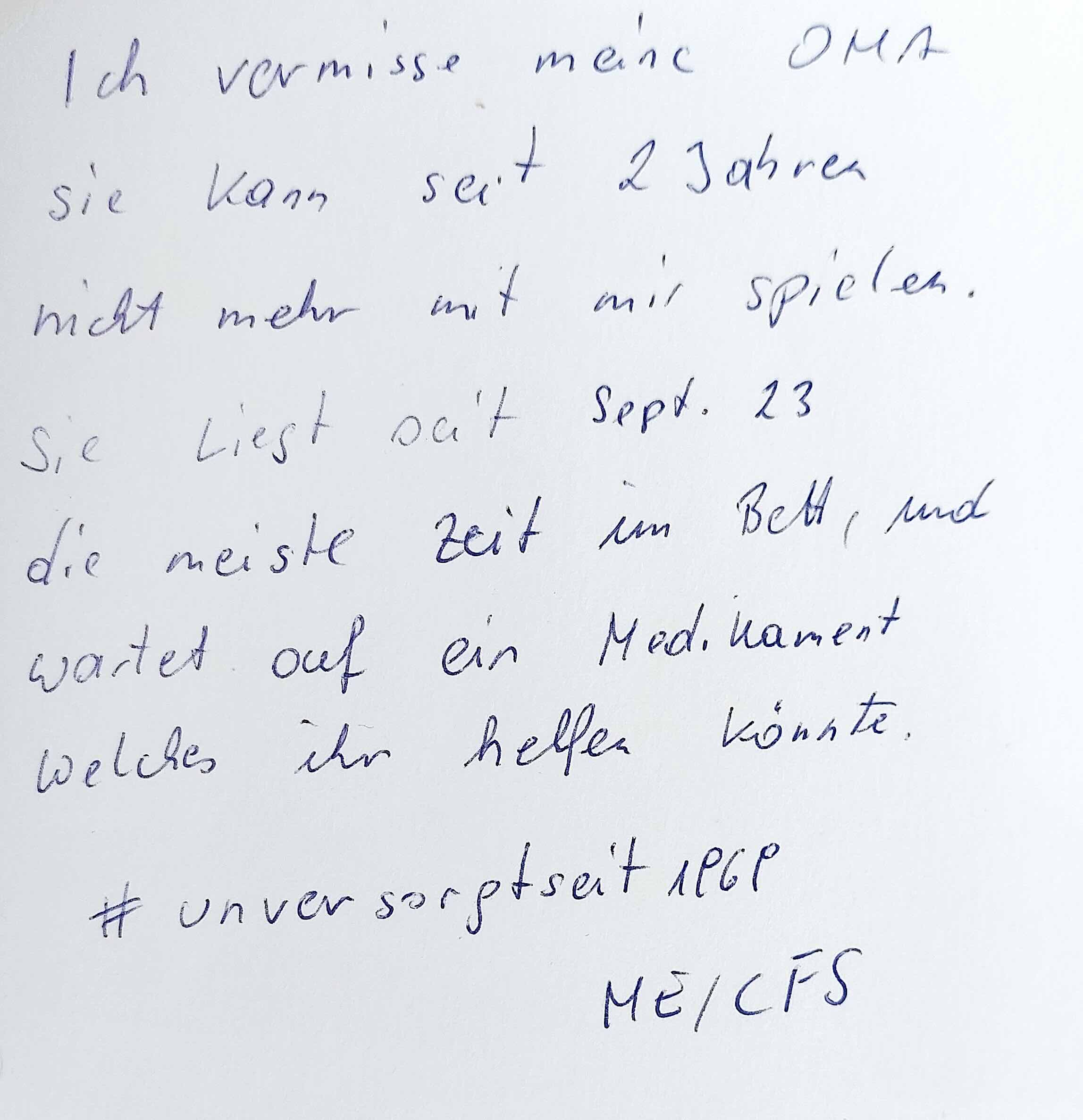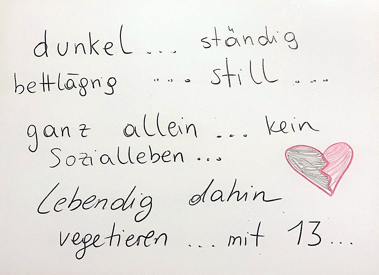 “Hermine, 19 Jahre. Seit 637 Tagen im Bett gefangen”, steht auf dem Bild einer liegenden jungen Frau. “Liebe Tante Andrea! Ich vermisse dich bei jeder Familienfeier, auch wenn du ab und zu über Videotelefonie dabei bist”, steht auf einer anderen Botschaft.