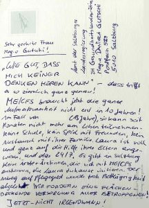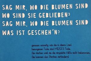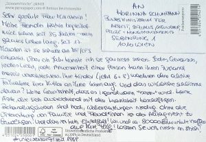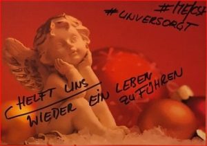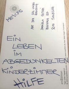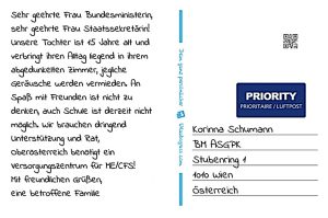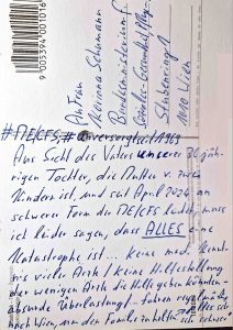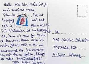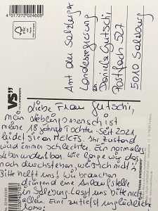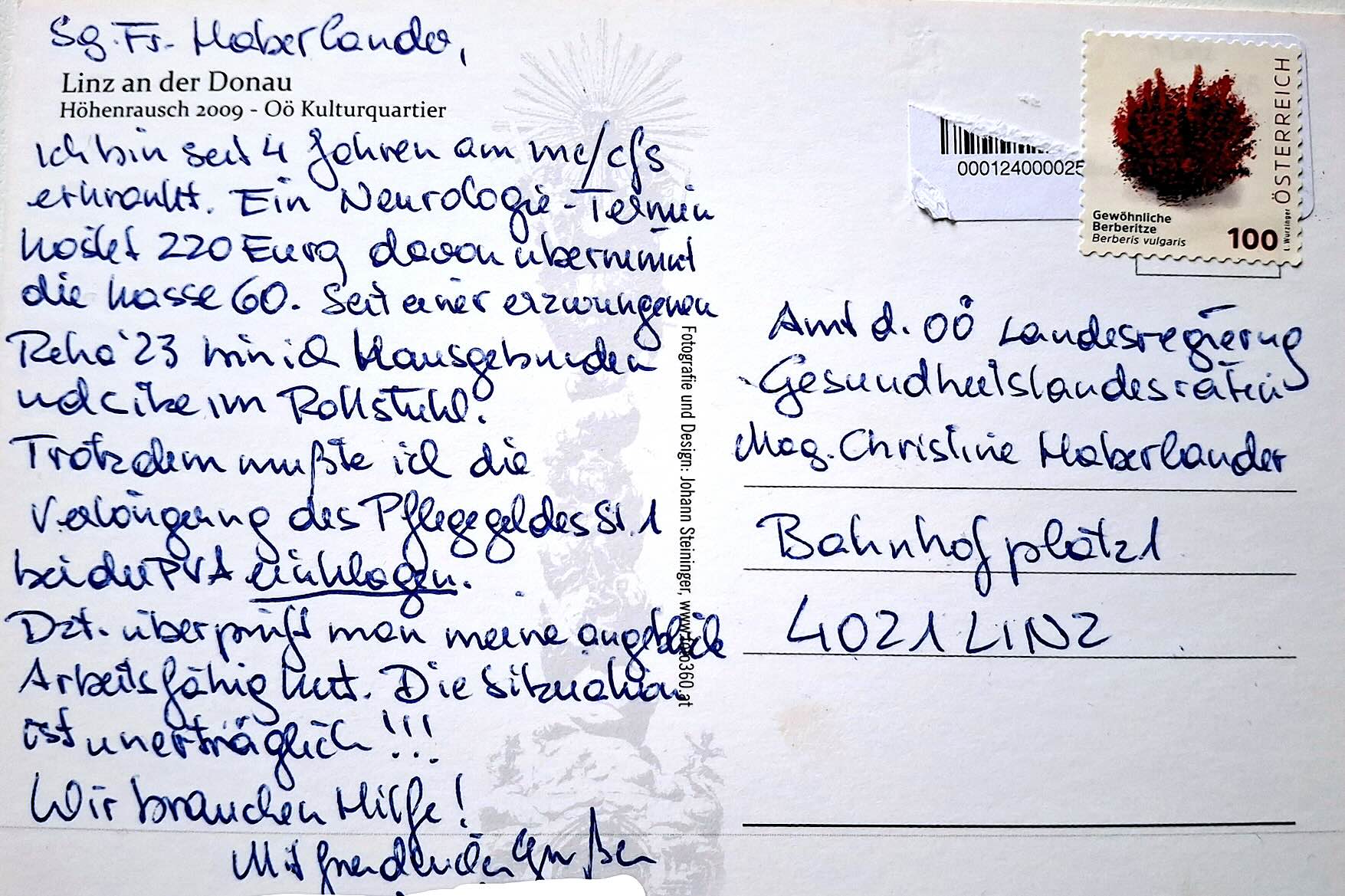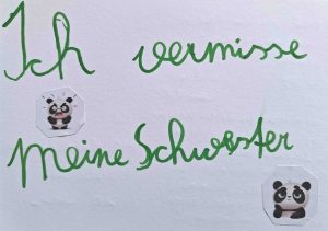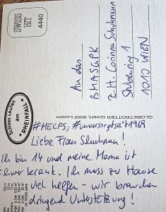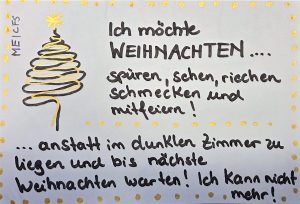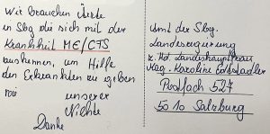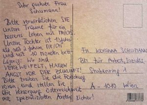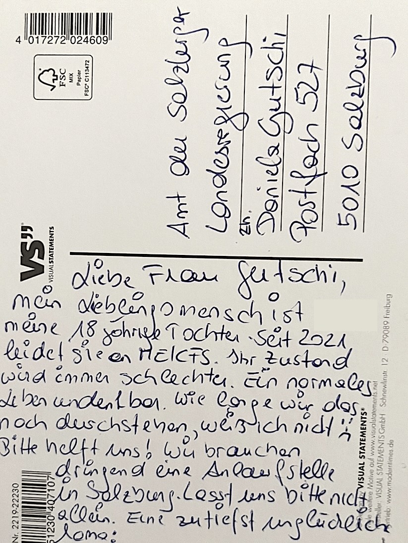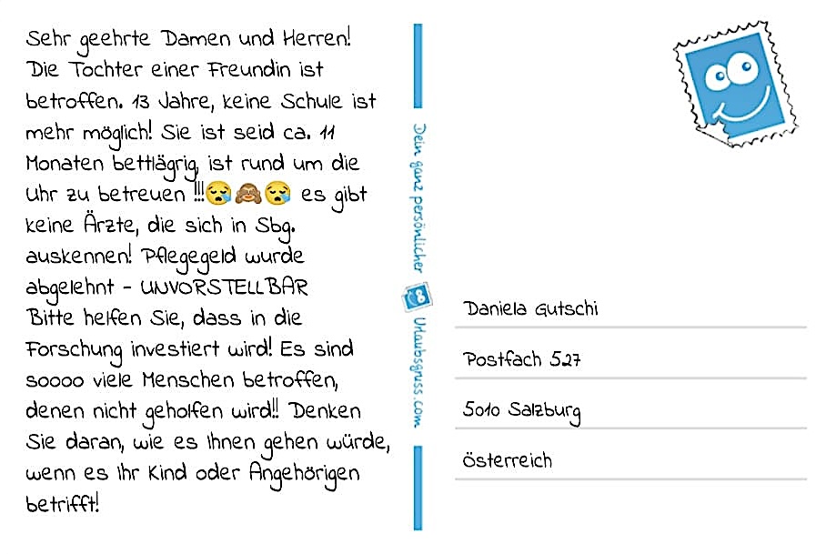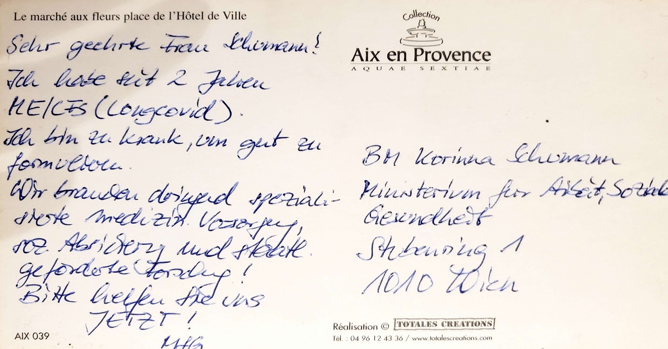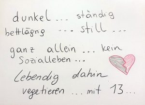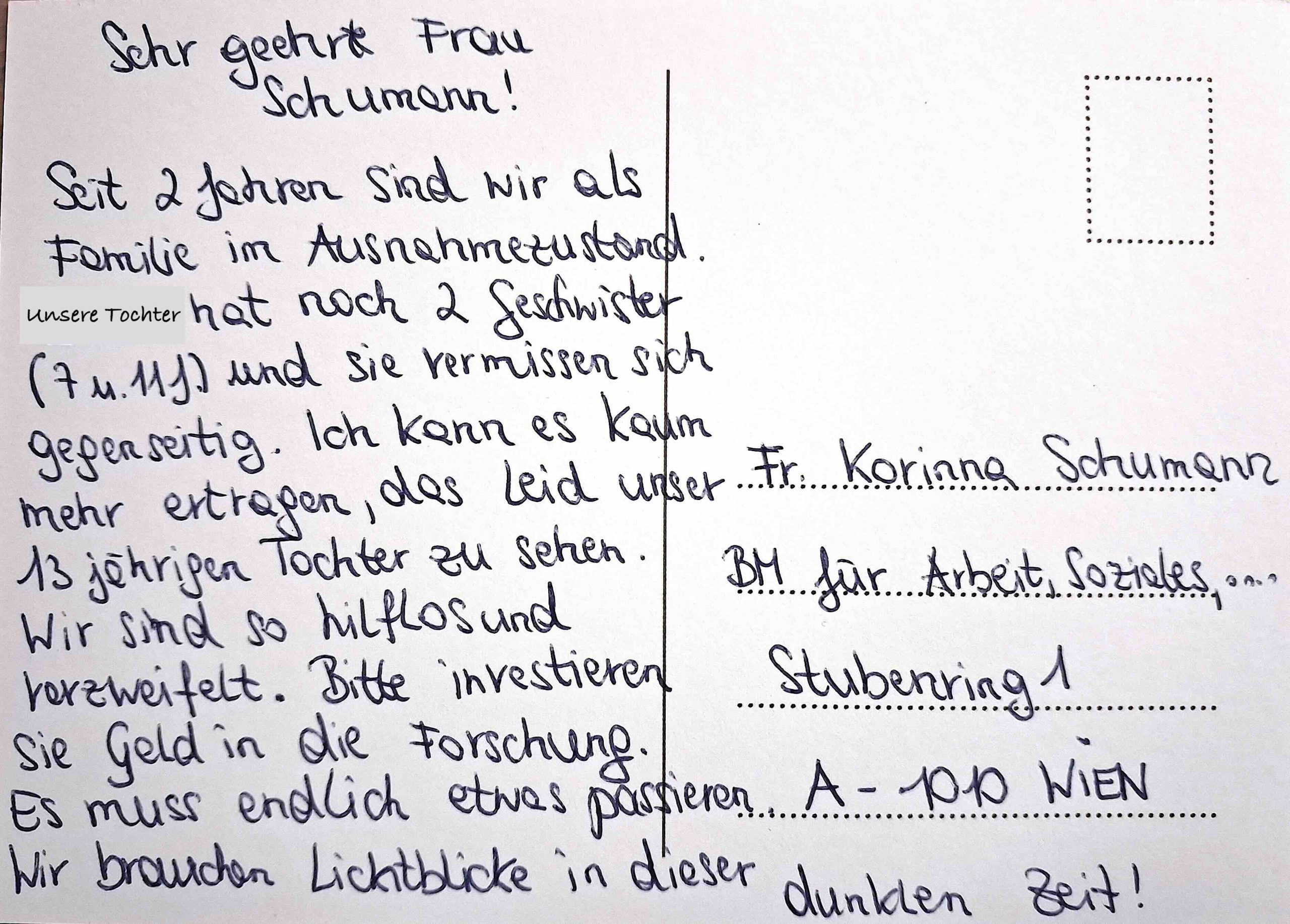 “Hermine, 19 Jahre. Seit 637 Tagen im Bett gefangen”, steht auf dem Bild einer liegenden jungen Frau. “Liebe Tante Andrea! Ich vermisse dich bei jeder Familienfeier, auch wenn du ab und zu über Videotelefonie dabei bist”, steht auf einer anderen Botschaft.