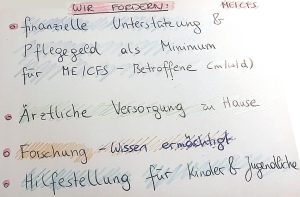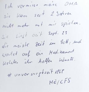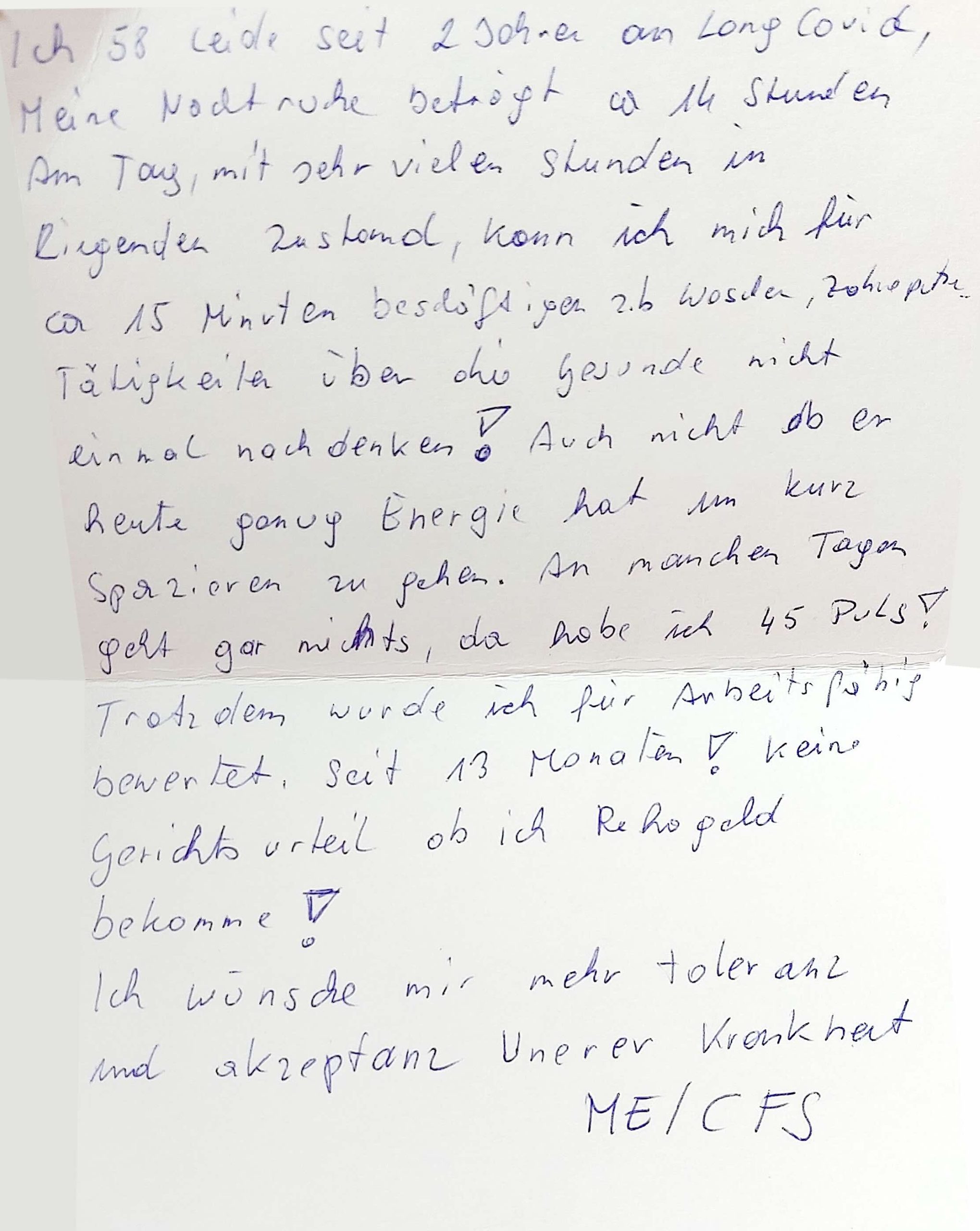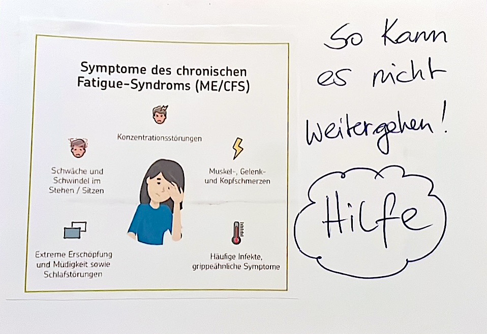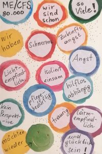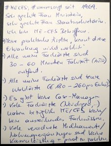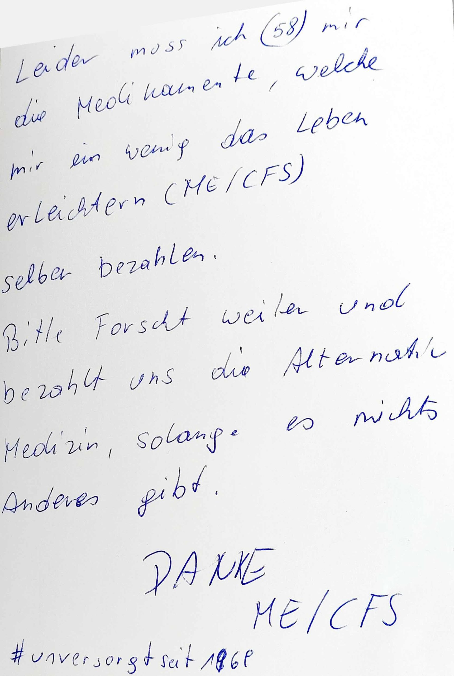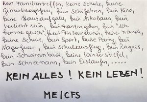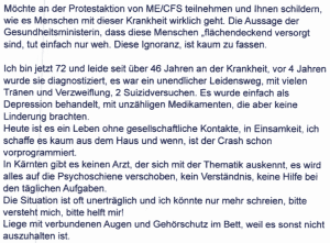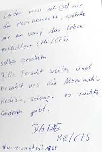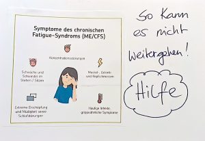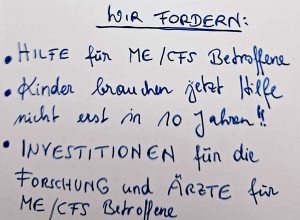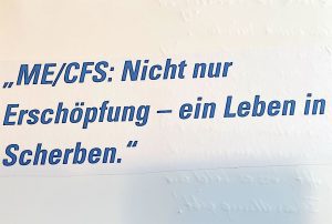 “Mit ME/CFS ist nichts selbstverständlich! Duschen? Essen? Sprechen?” stand auf einem Schild, das drei Geschwister aus Salzburg mitbrachten. Sie kamen für ihre erkrankte Mutter und die ebenfalls erkrankte Schwester. Sie leidet mit 28 so schwer an ME/CFS, dass sie kaum das Bett verlassen kann. Selbst das Sprechen geht nur noch in guten Phasen und kleinen Portionen.
