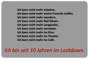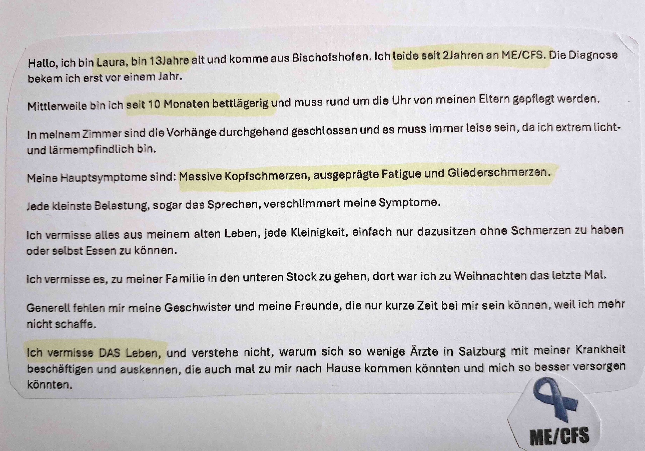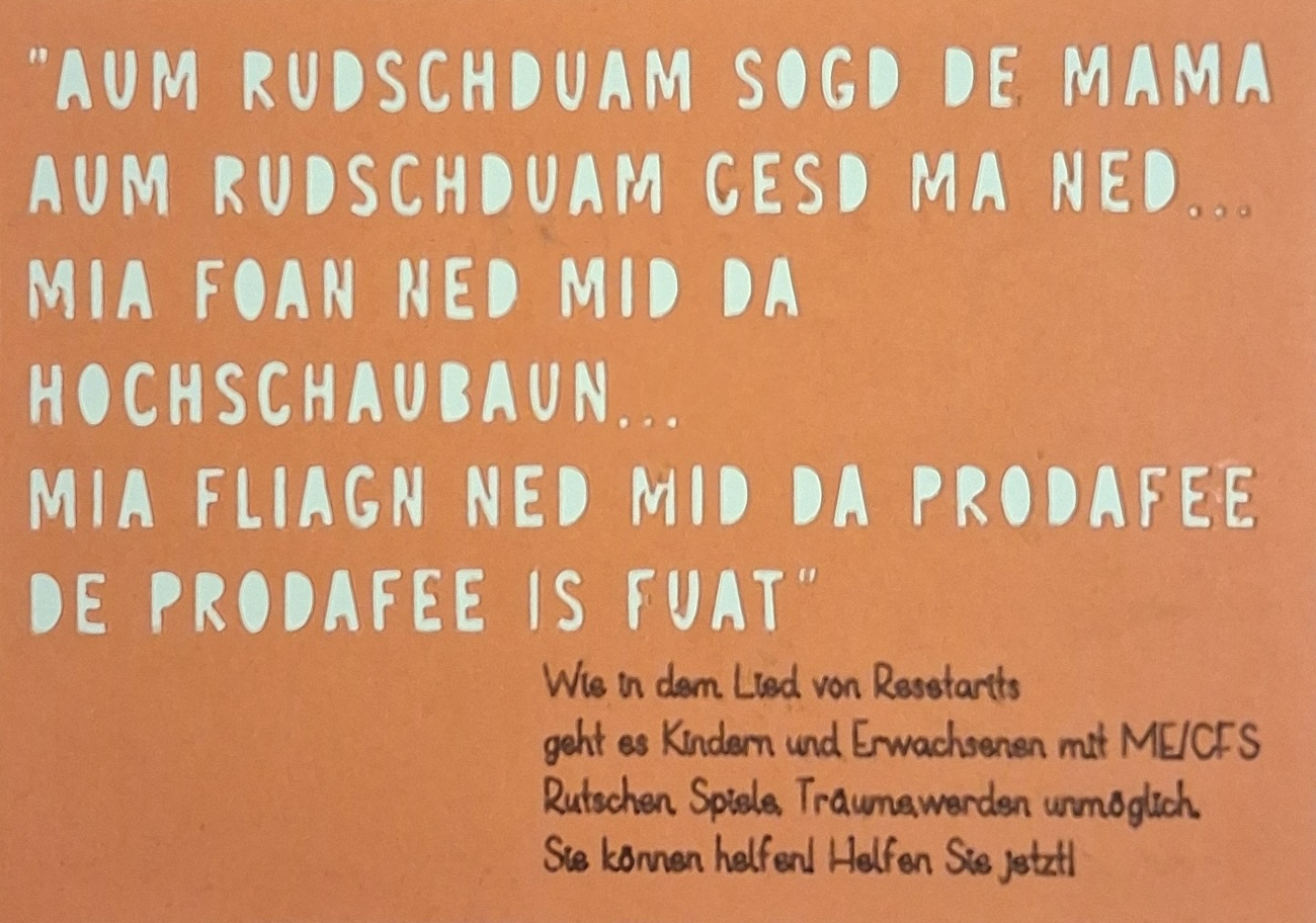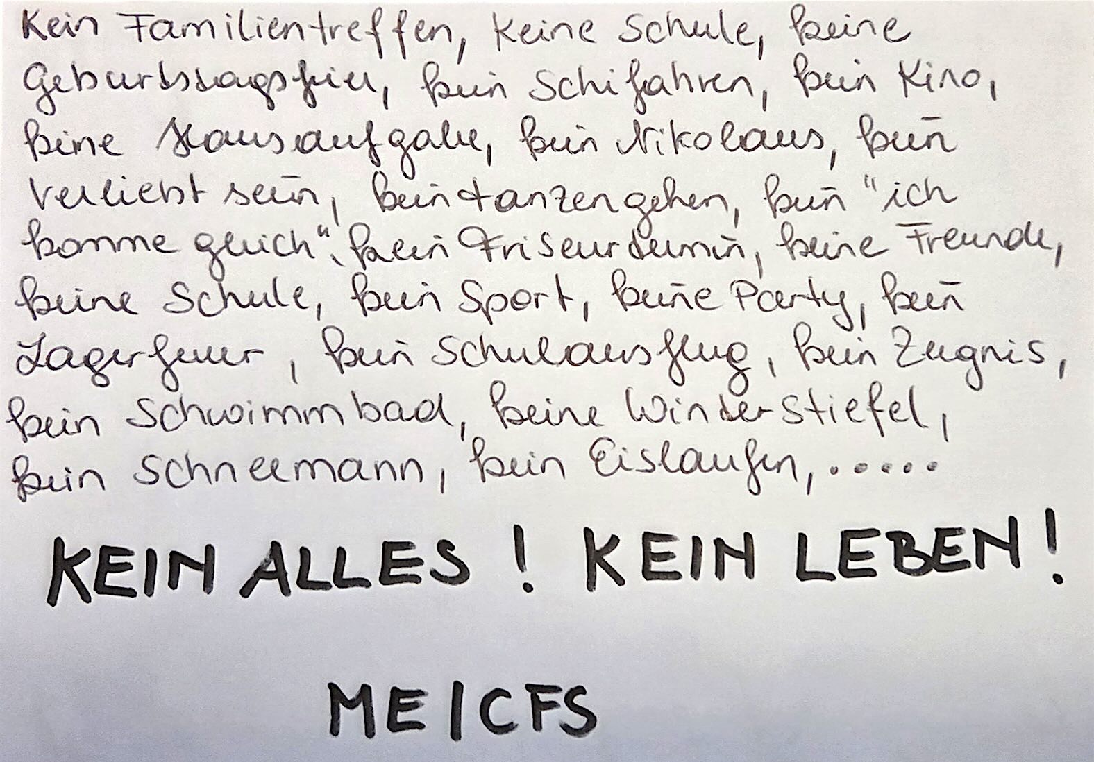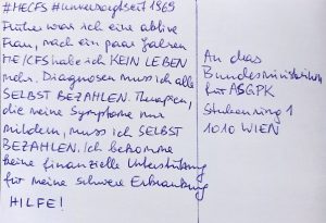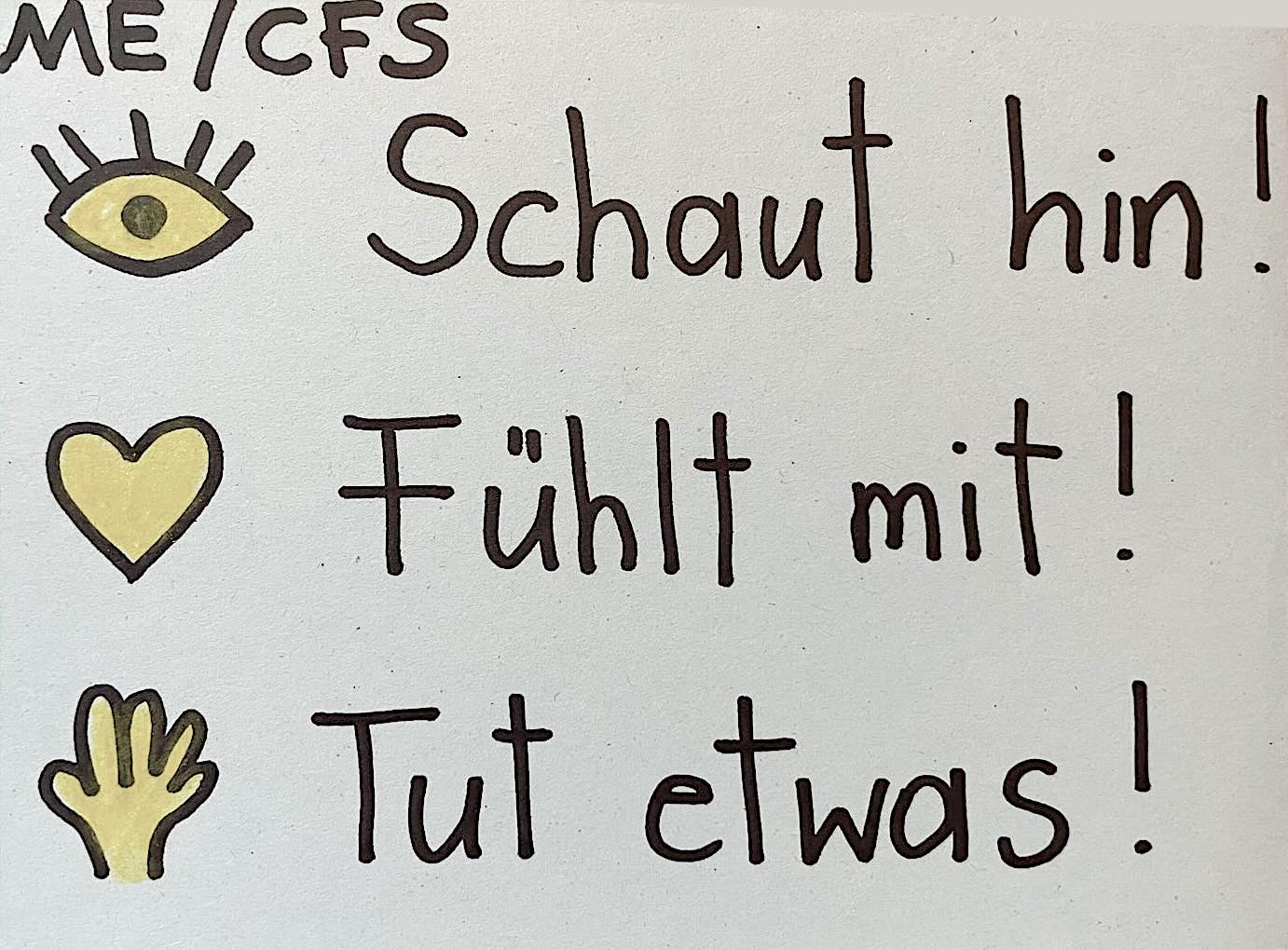 “Mit ME/CFS ist nichts selbstverständlich! Duschen? Essen? Sprechen?” stand auf einem Schild, das drei Geschwister aus Salzburg mitbrachten. Sie kamen für ihre erkrankte Mutter und die ebenfalls erkrankte Schwester. Sie leidet mit 28 so schwer an ME/CFS, dass sie kaum das Bett verlassen kann. Selbst das Sprechen geht nur noch in guten Phasen und kleinen Portionen.