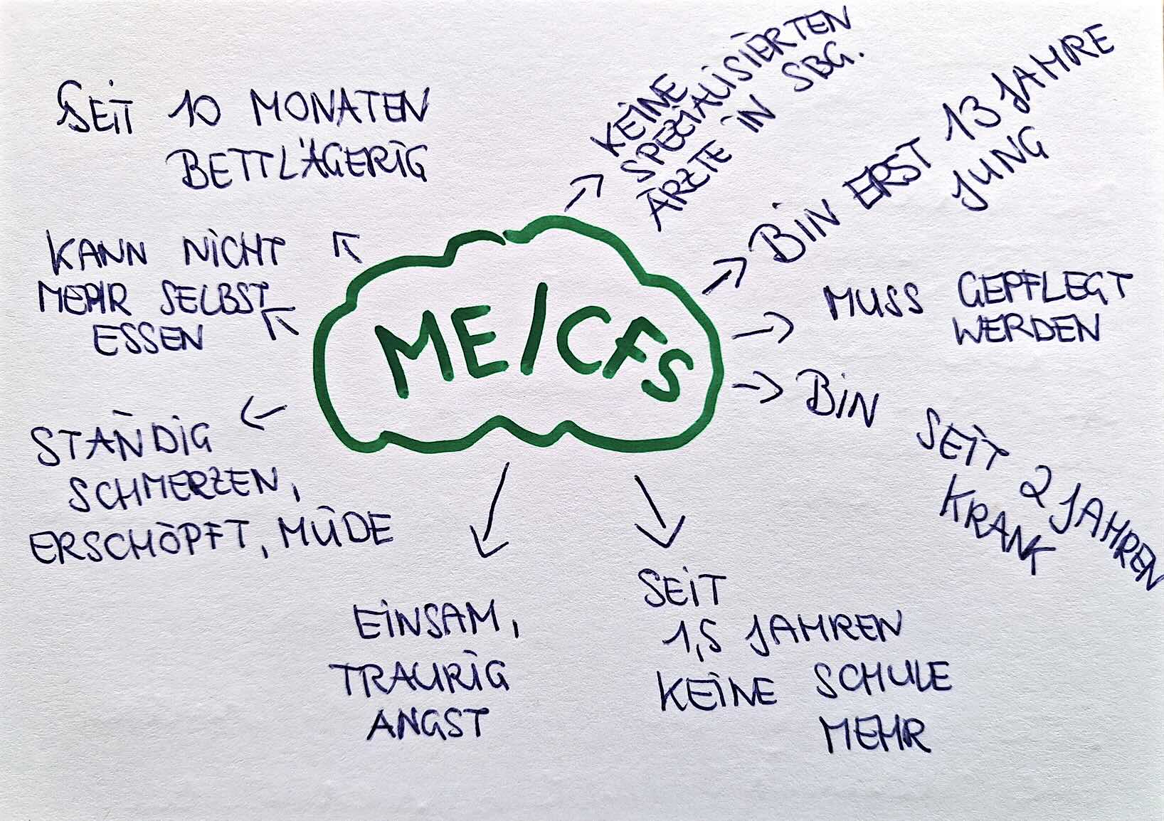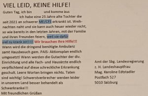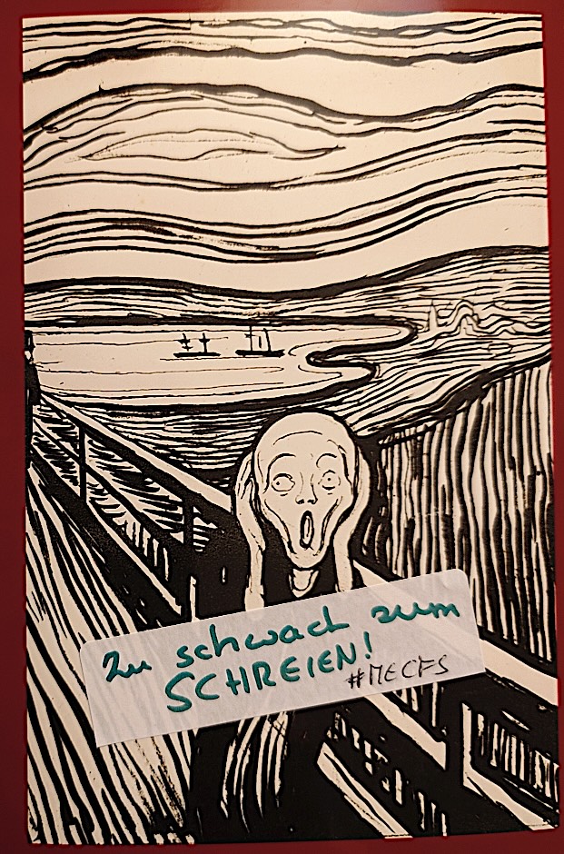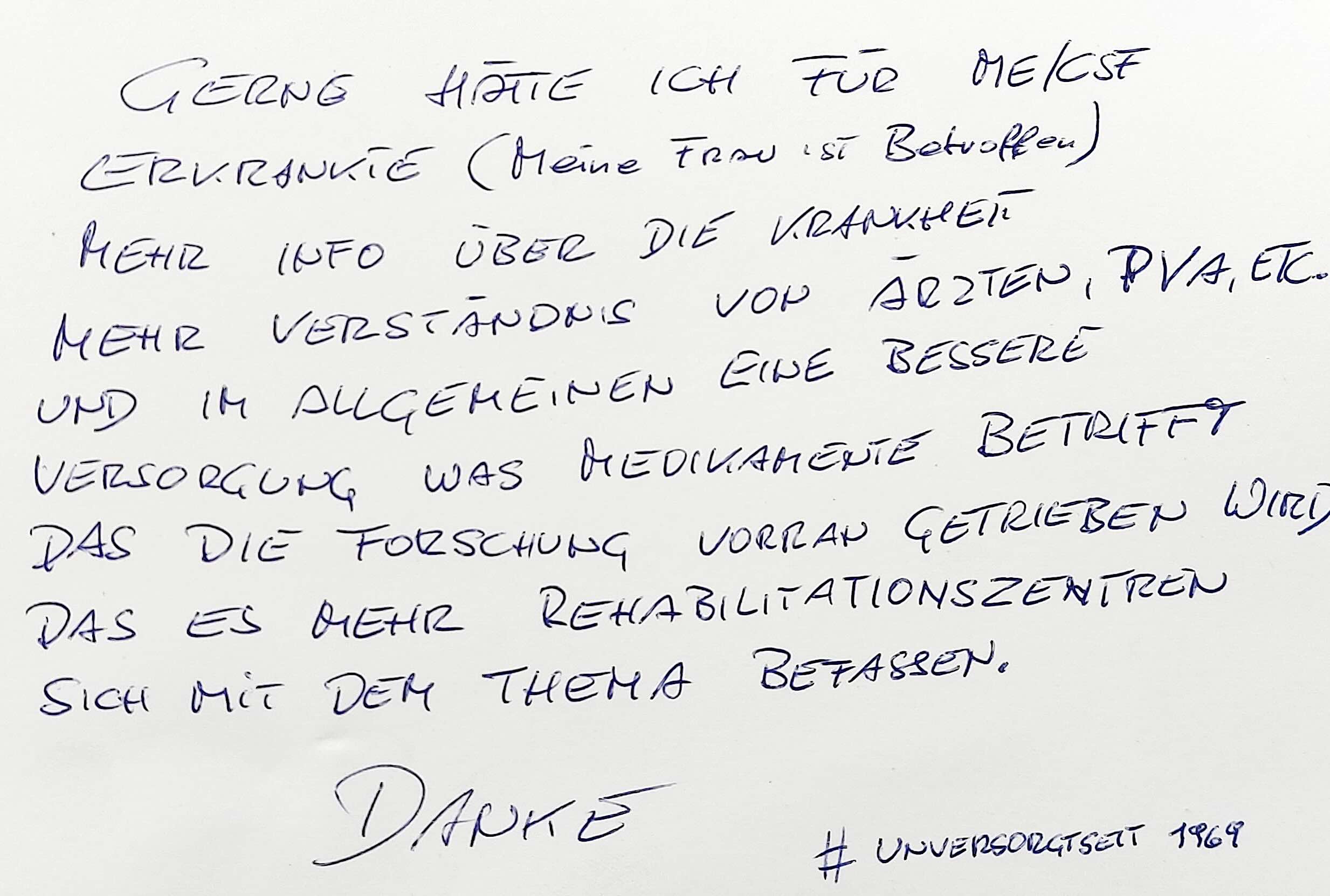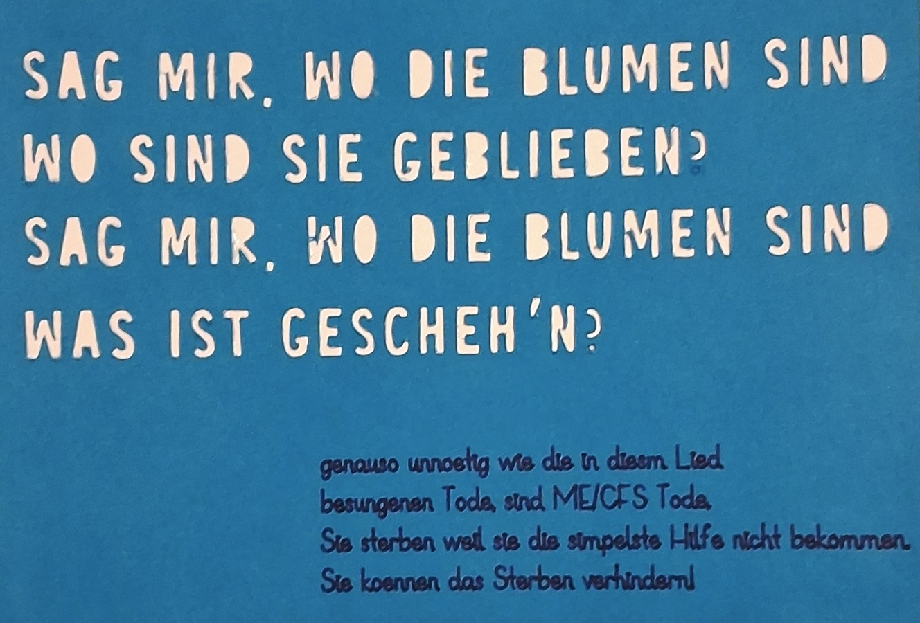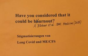“Mit ME/CFS ist nichts selbstverständlich! Duschen? Essen? Sprechen?” stand auf einem Schild, das drei Geschwister aus Salzburg mitbrachten. Sie kamen für ihre erkrankte Mutter und die ebenfalls erkrankte Schwester. Sie leidet mit 28 so schwer an ME/CFS, dass sie kaum das Bett verlassen kann. Selbst das Sprechen geht nur noch in guten Phasen und kleinen Portionen.