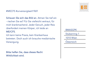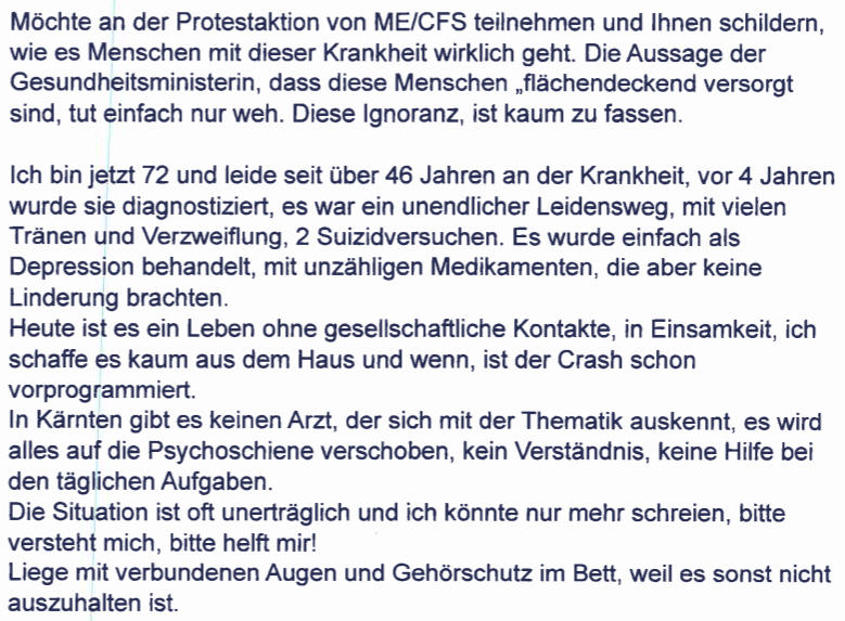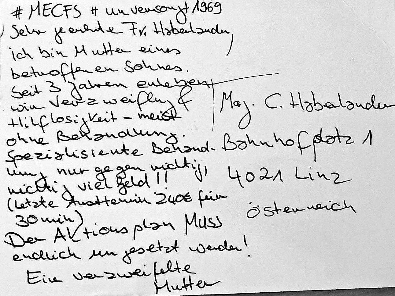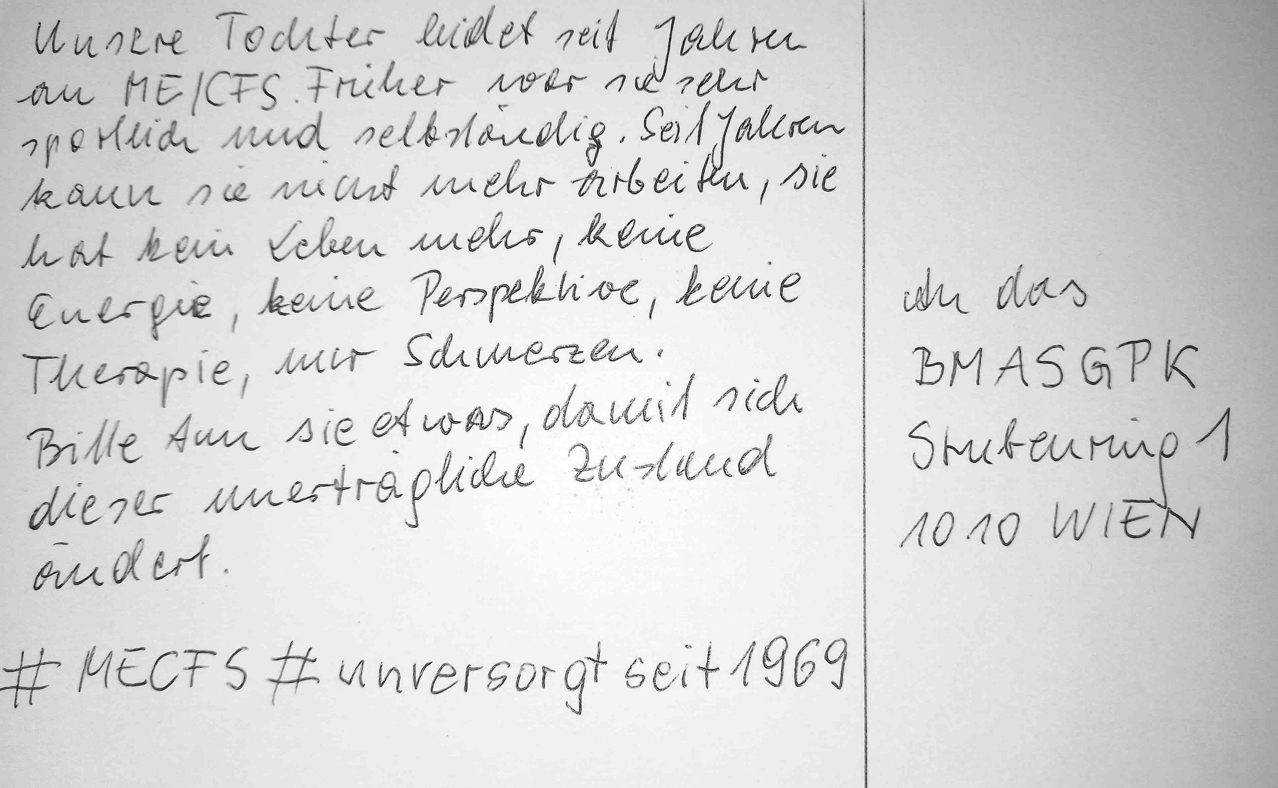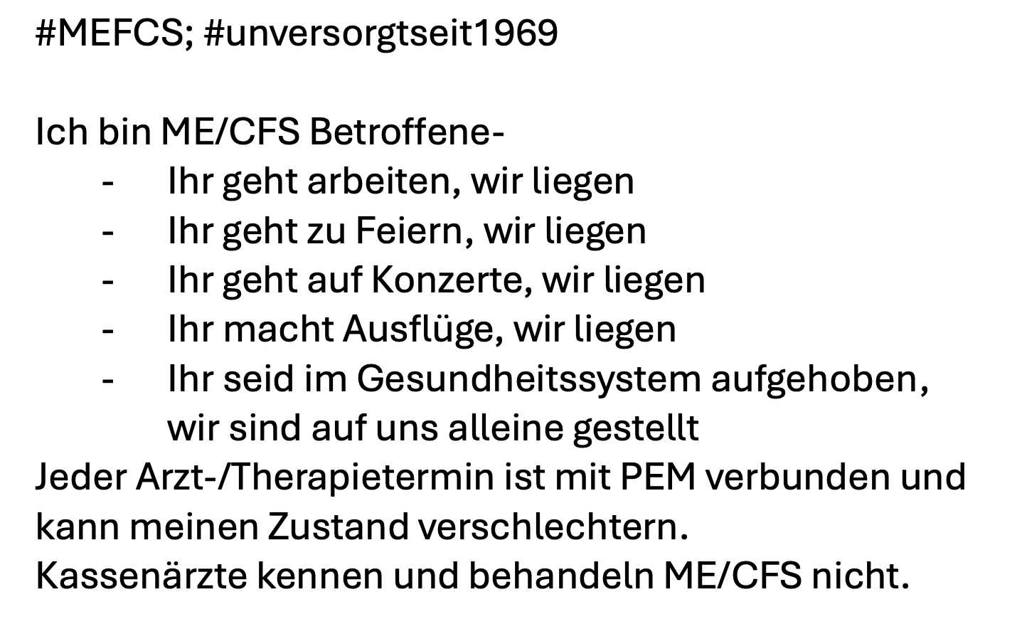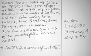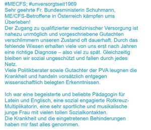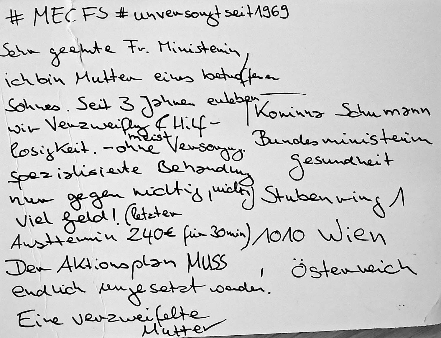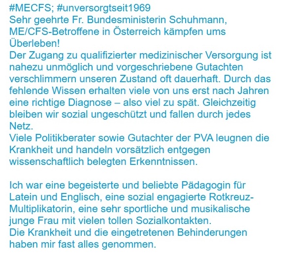 Wir bedanken uns bei allen die ihre Erfahrungsberichte an Politiker:innen sowie an uns geschickt haben um aufzuzeigen wie die Lage der ME/CFS-Betroffenen in Österreich wirklich ist: #unversorgtseit1969.