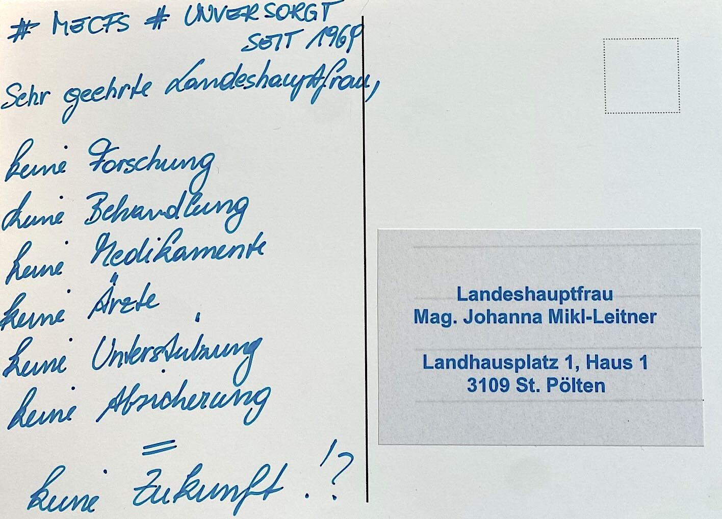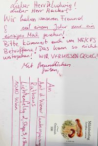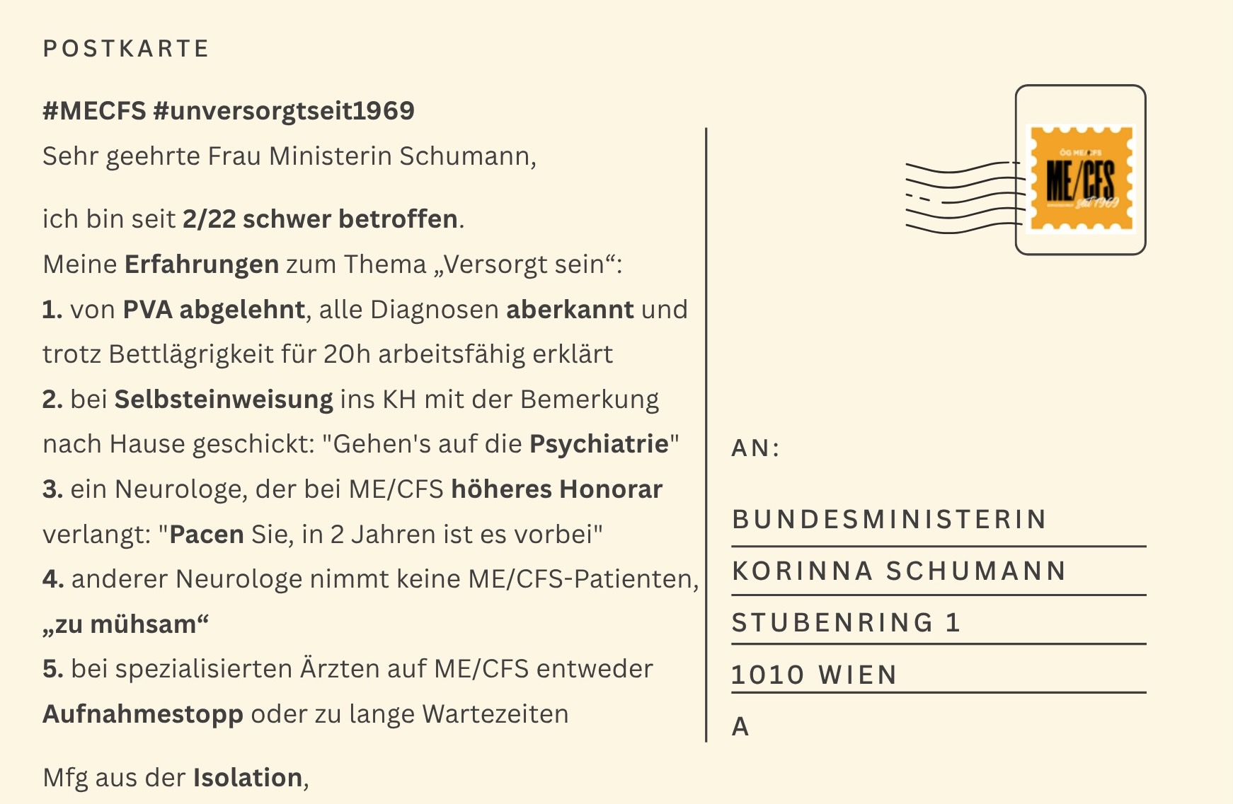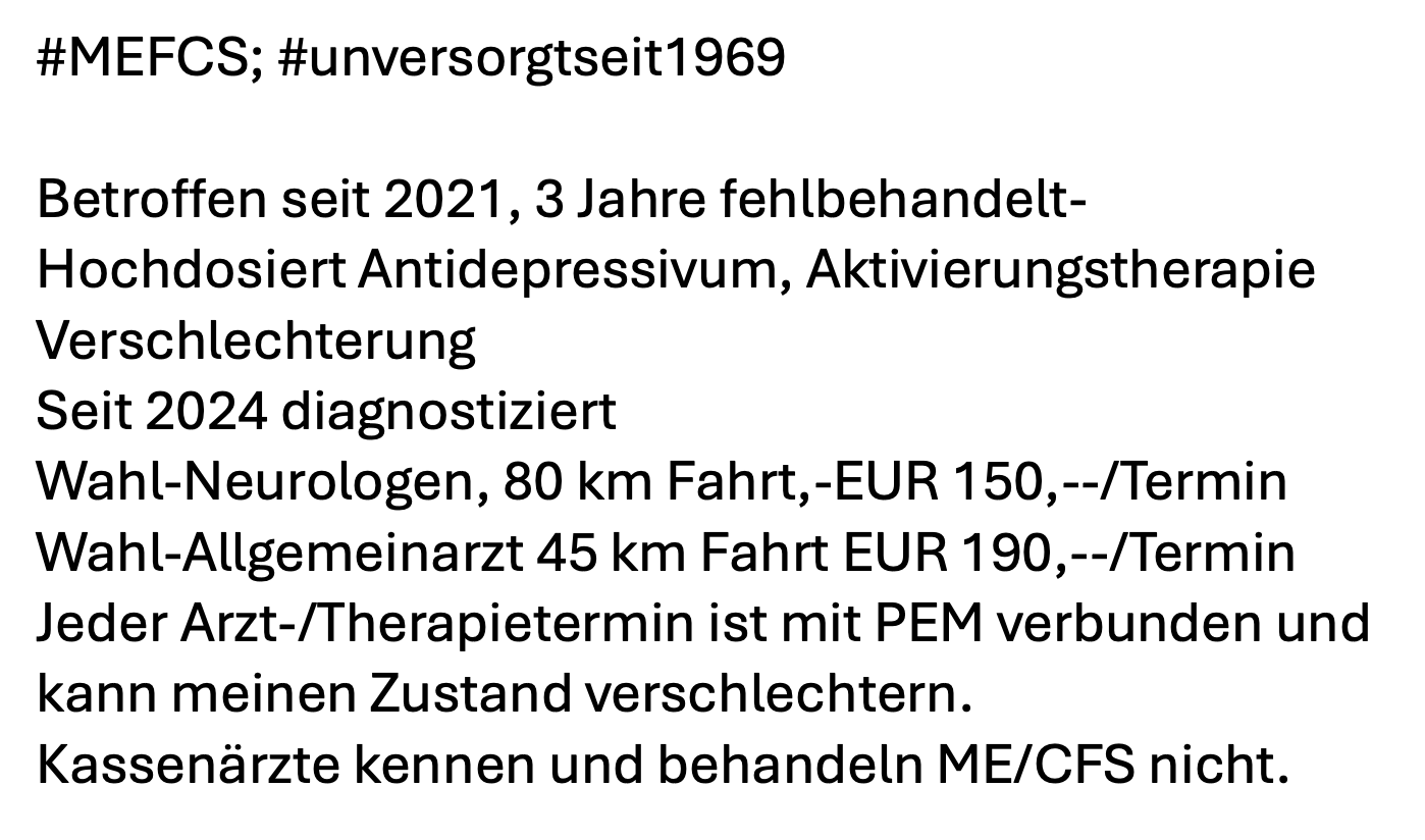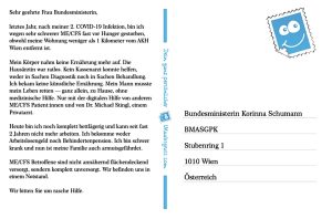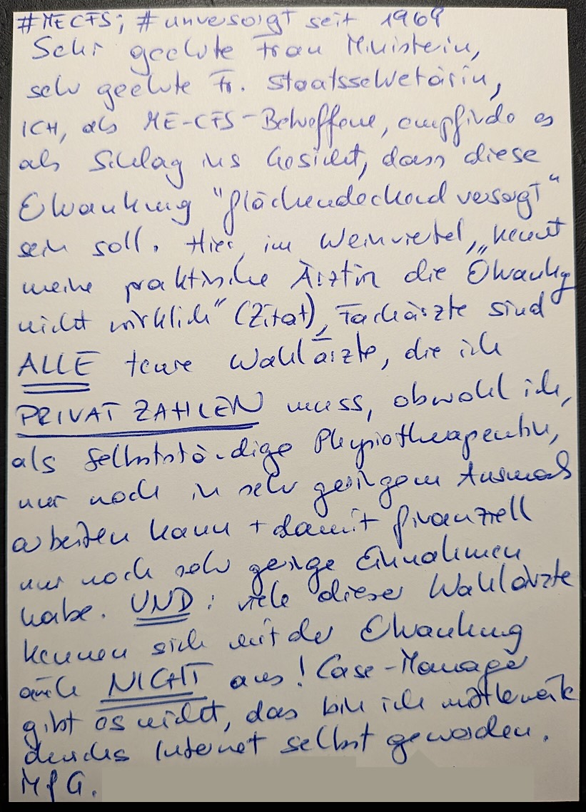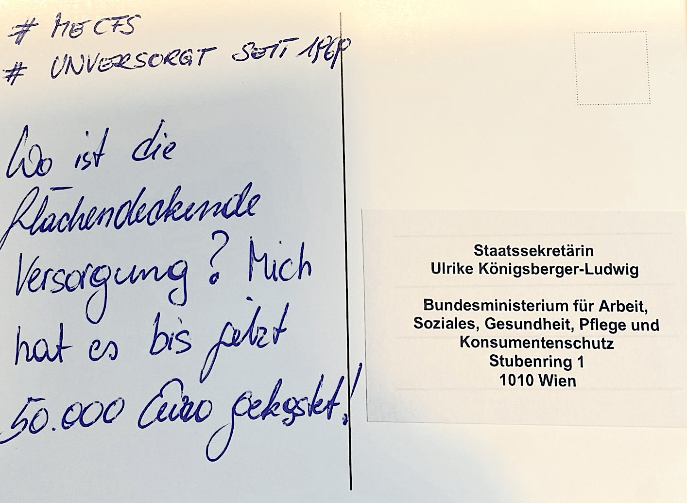 Wir bedanken uns bei allen die ihre Erfahrungsberichte an Politiker:innen sowie an uns geschickt haben um aufzuzeigen wie die Lage der ME/CFS-Betroffenen in Österreich wirklich ist: #unversorgtseit1969.