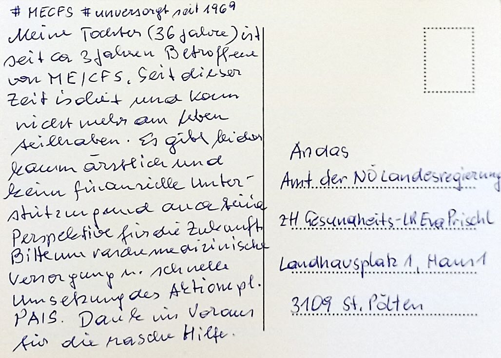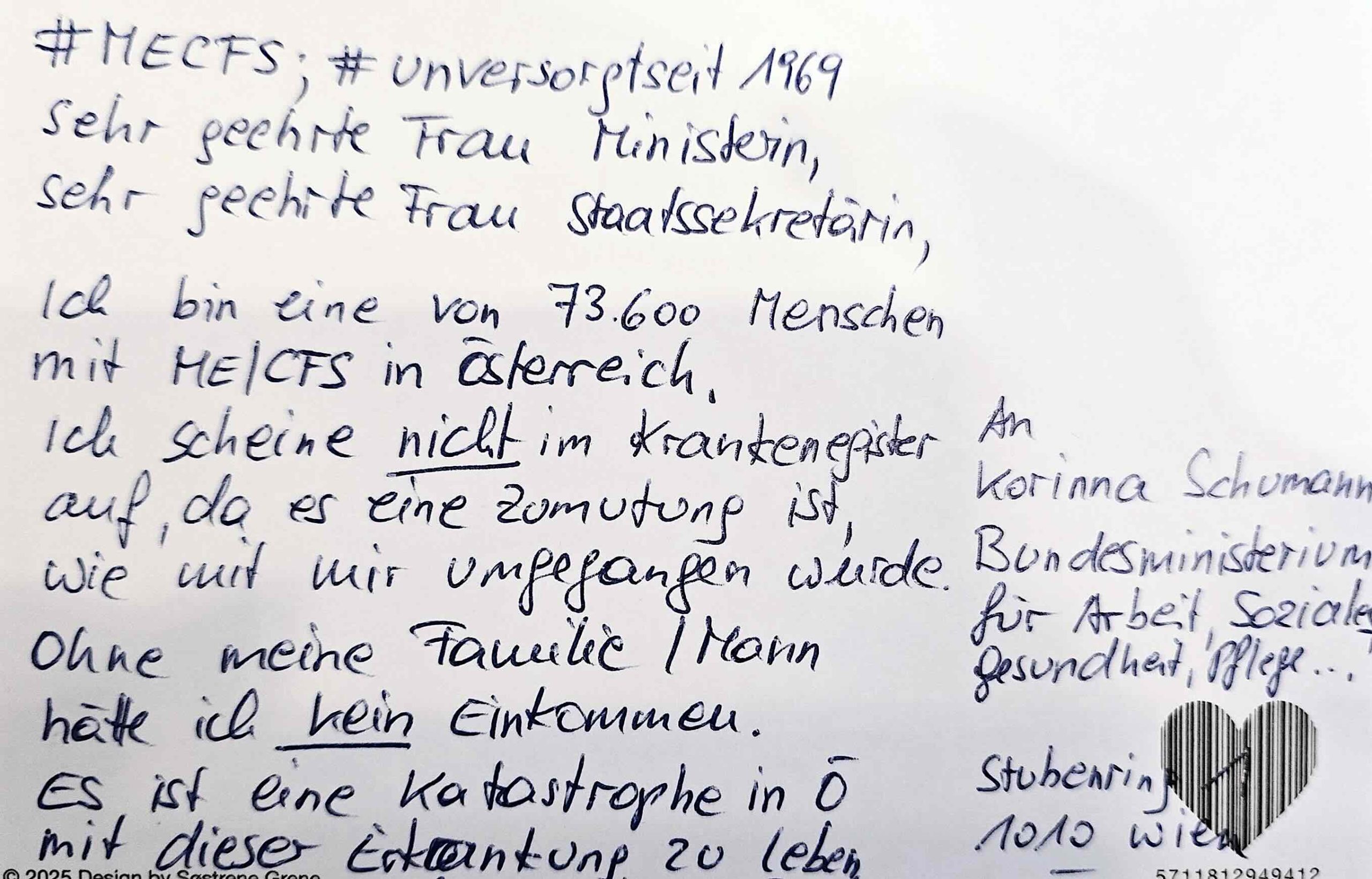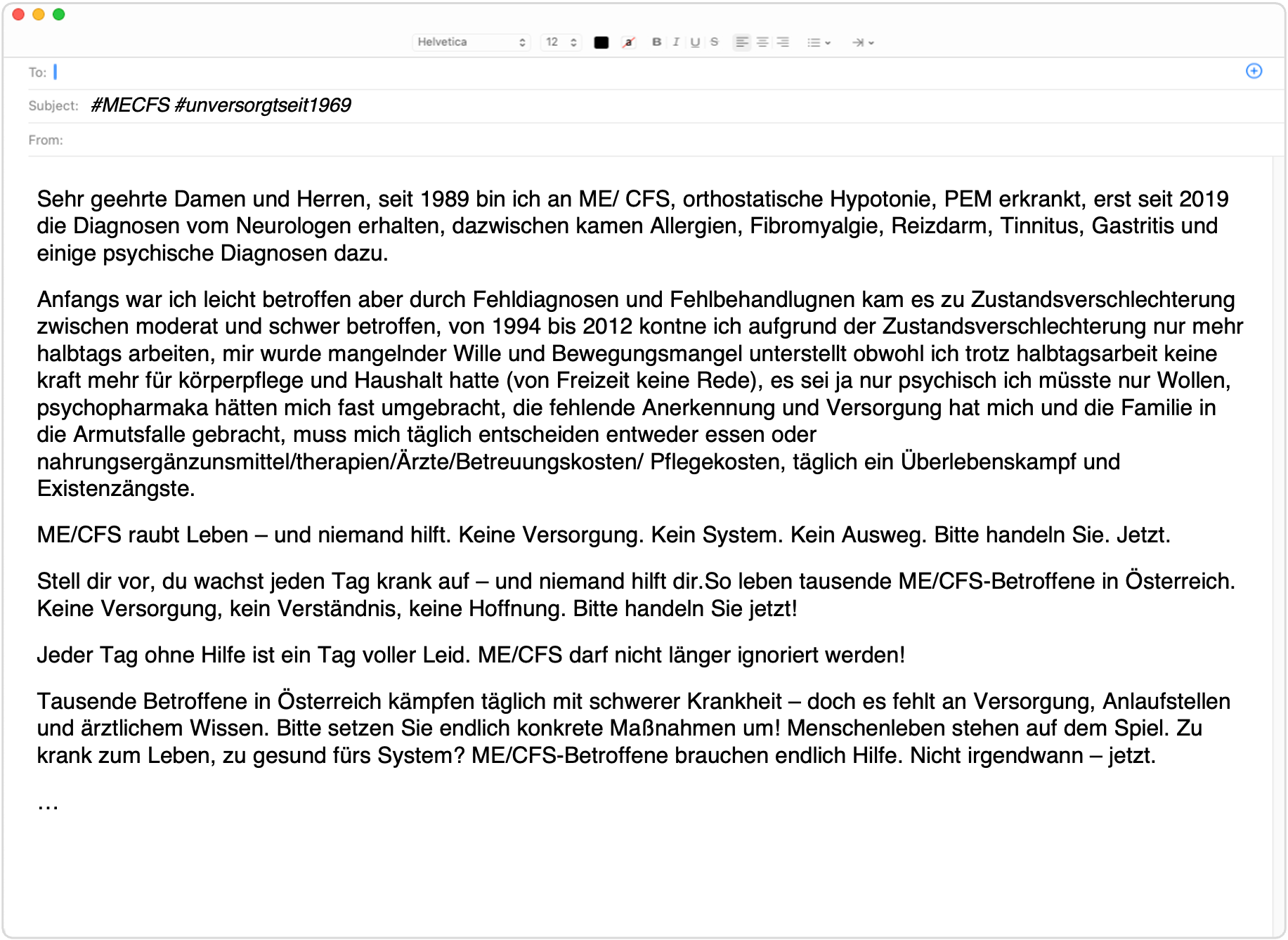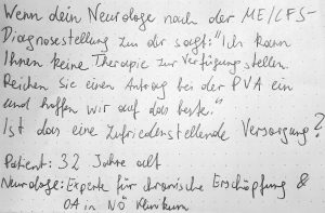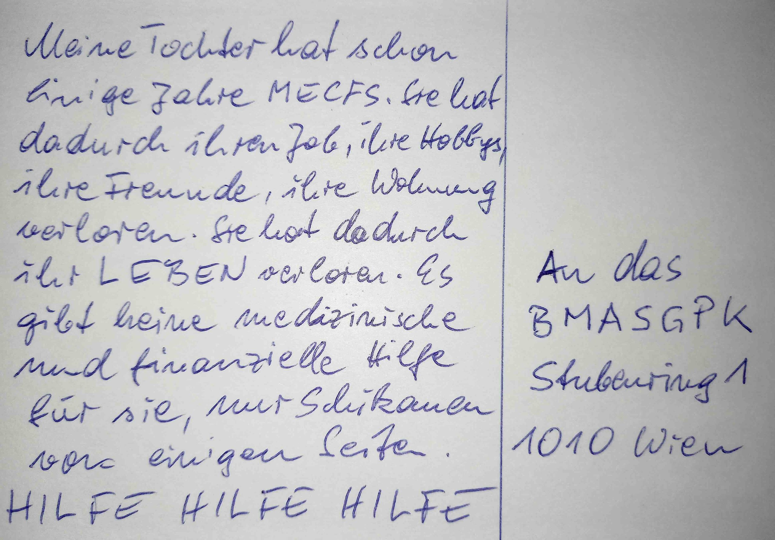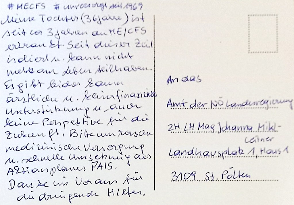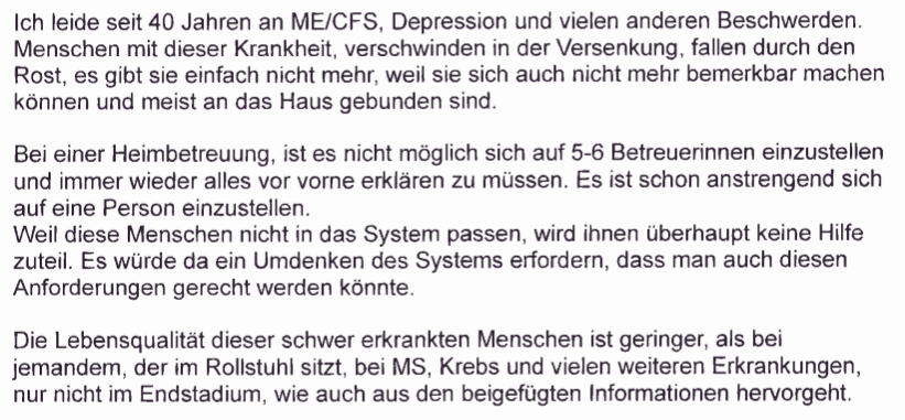 Wir bedanken uns bei allen die ihre Erfahrungsberichte an Politiker:innen sowie an uns geschickt haben um aufzuzeigen wie die Lage der ME/CFS-Betroffenen in Österreich wirklich ist: #unversorgtseit1969.