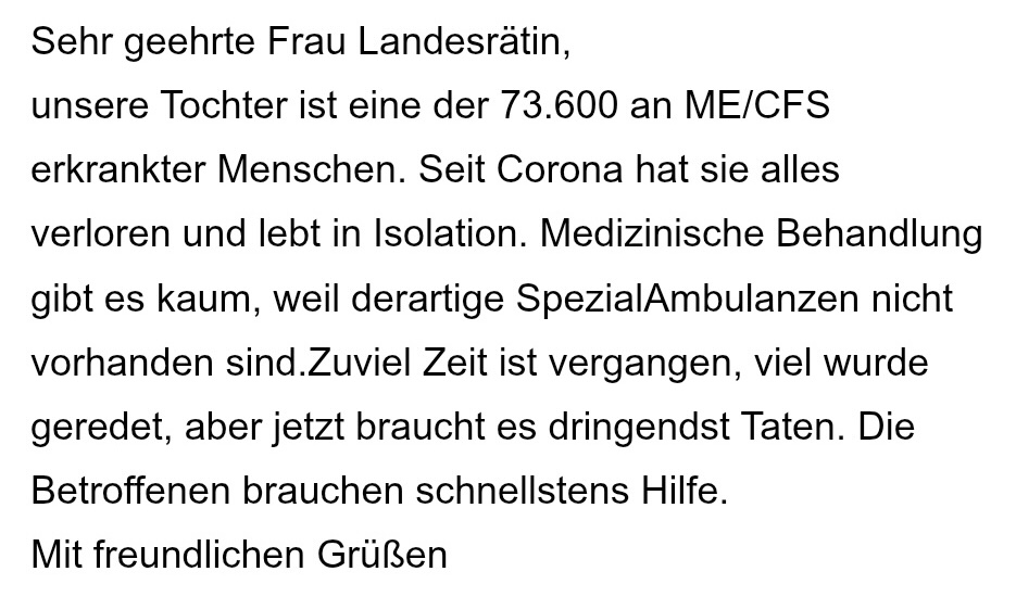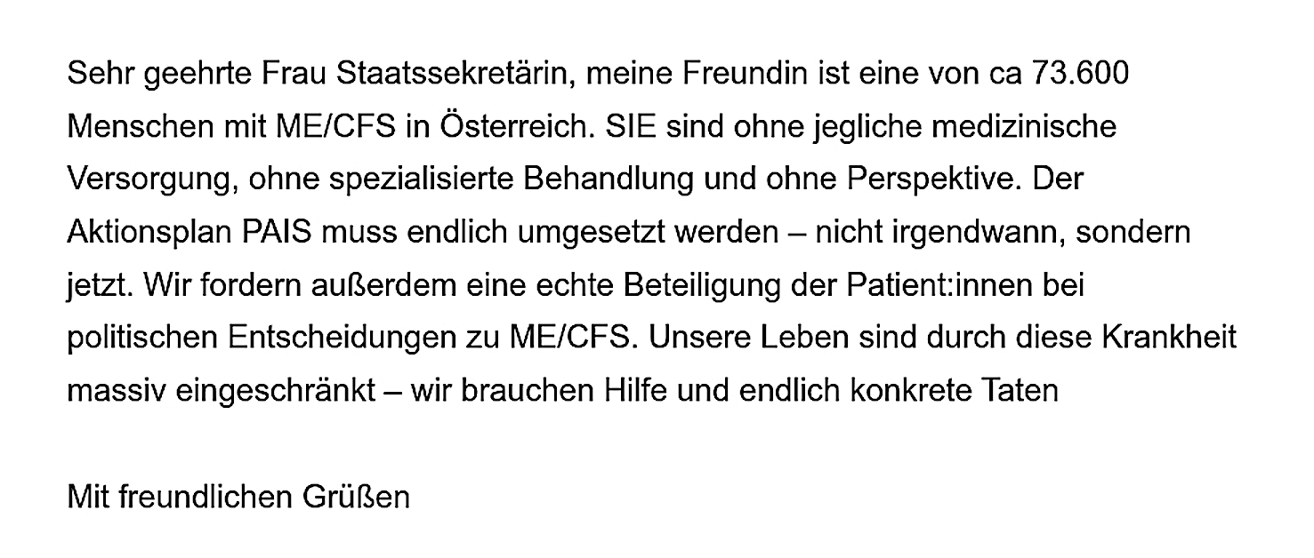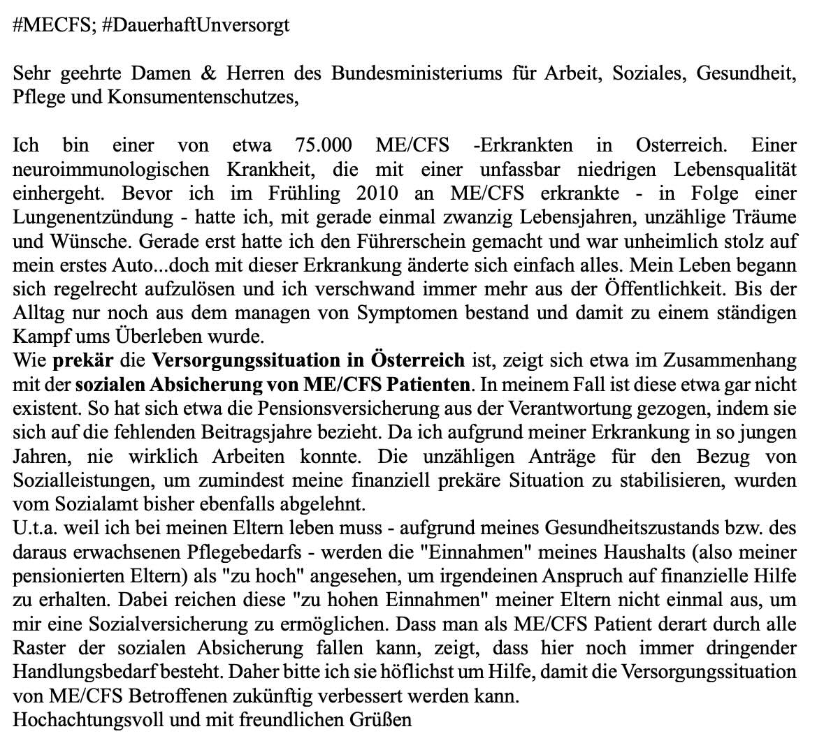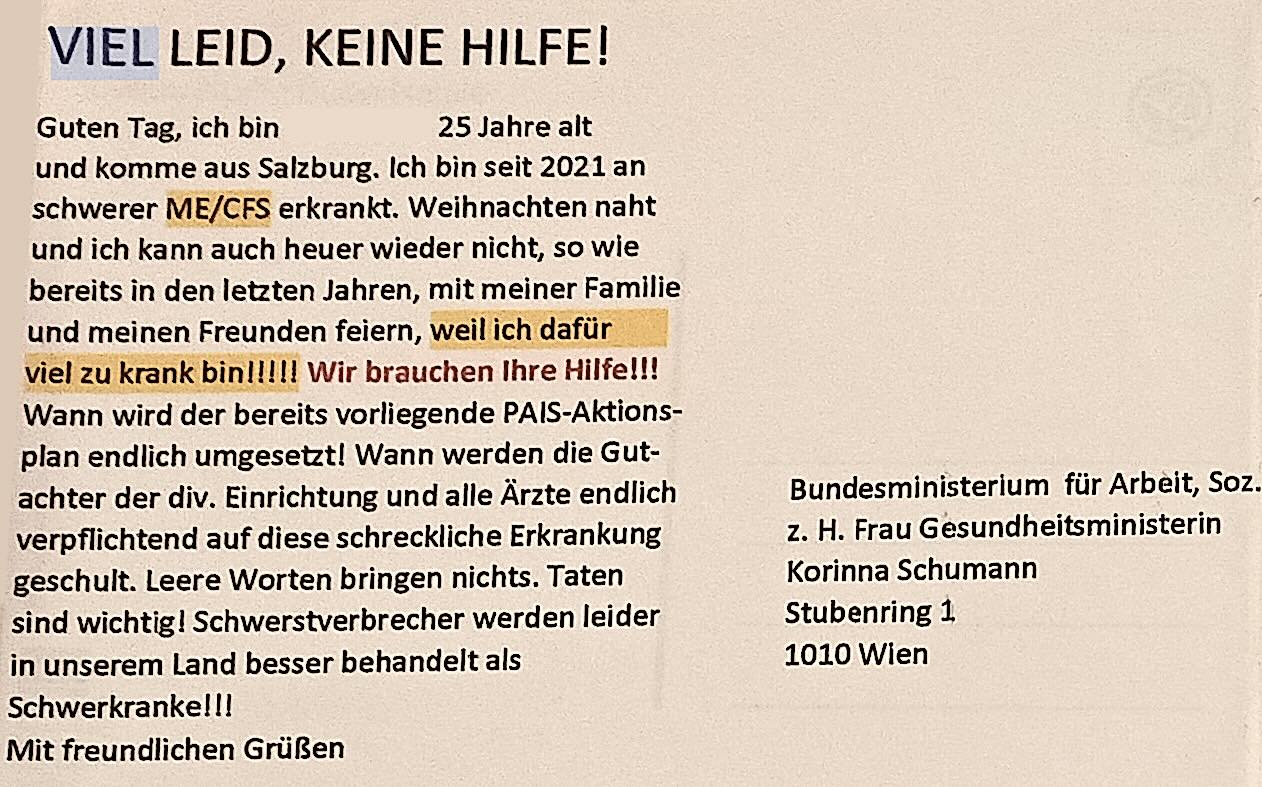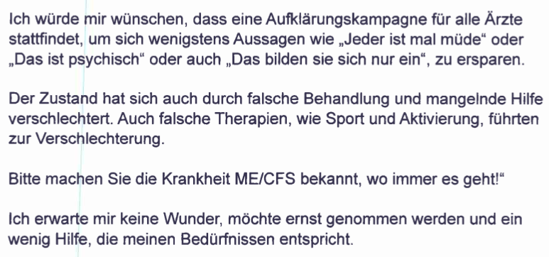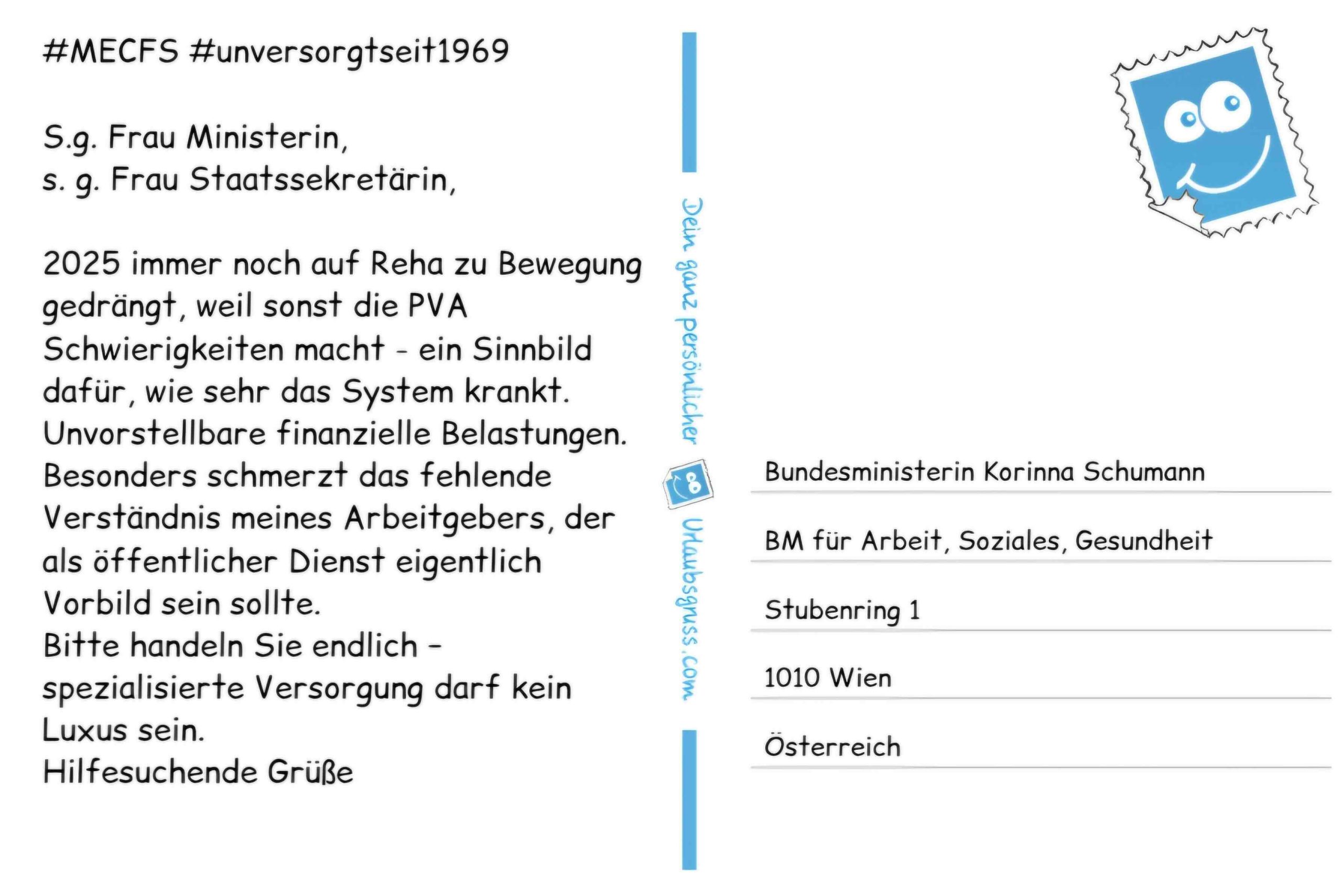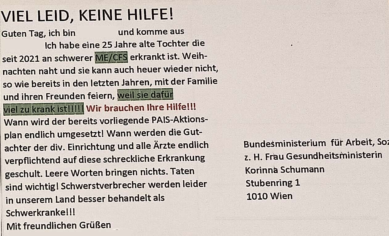 Wir bedanken uns bei allen die ihre Erfahrungsberichte an Politiker:innen sowie an uns geschickt haben um aufzuzeigen wie die Lage der ME/CFS-Betroffenen in Österreich wirklich ist: #unversorgtseit1969.