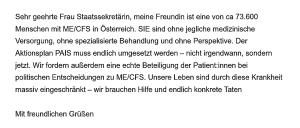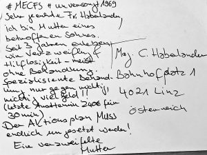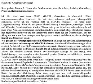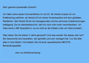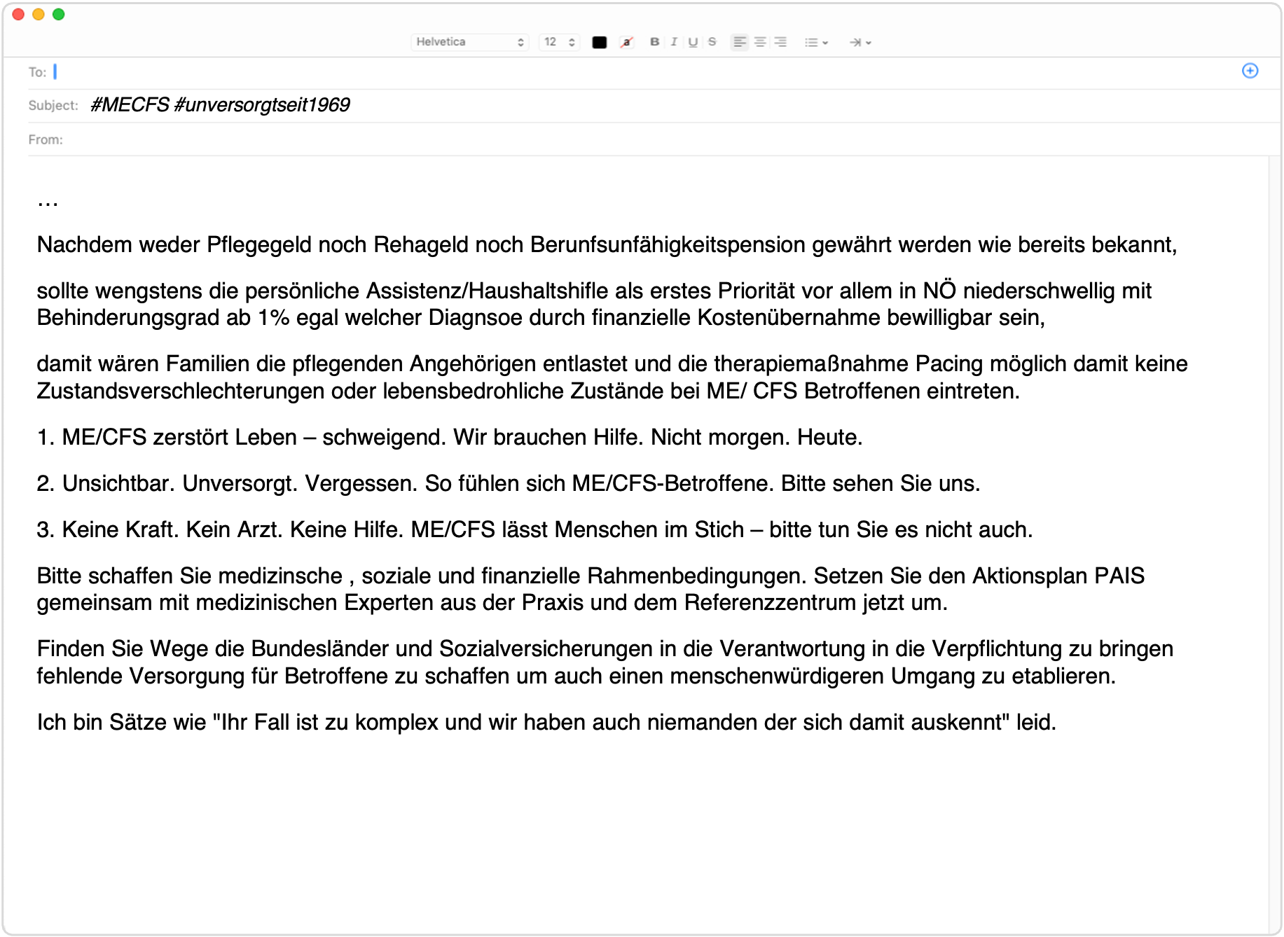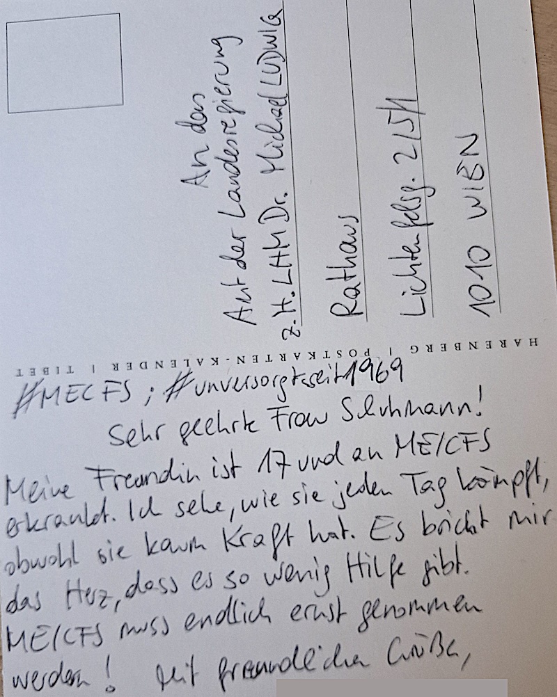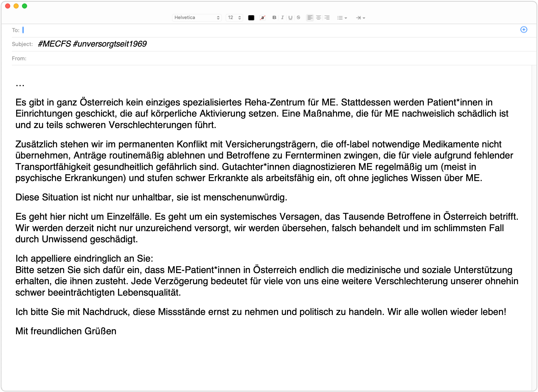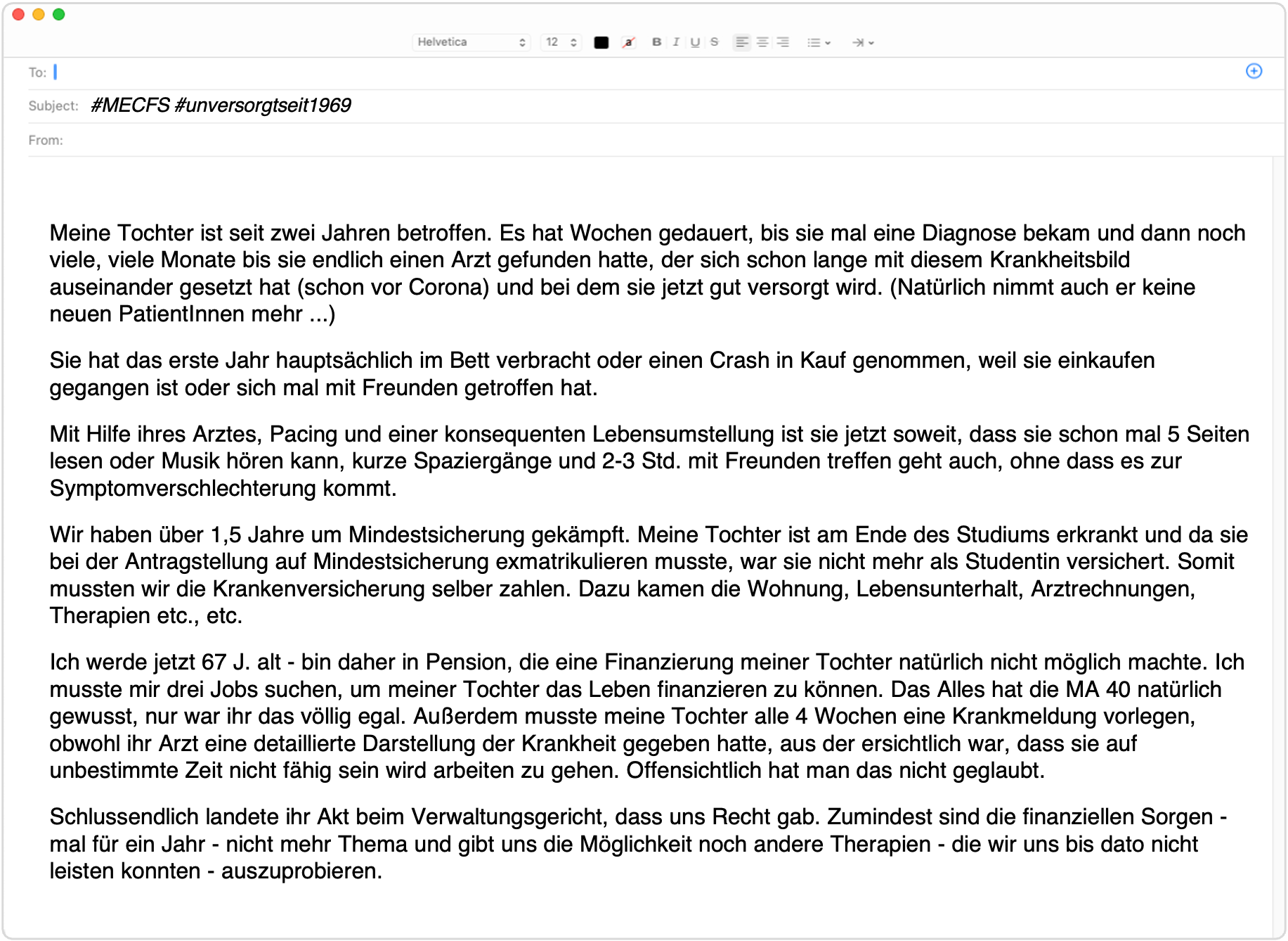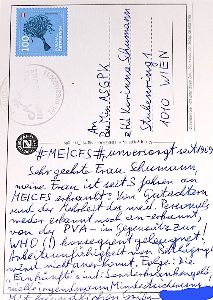 Wir bedanken uns bei allen die ihre Erfahrungsberichte an Politiker:innen sowie an uns geschickt haben um aufzuzeigen wie die Lage der ME/CFS-Betroffenen in Österreich wirklich ist: #unversorgtseit1969.
