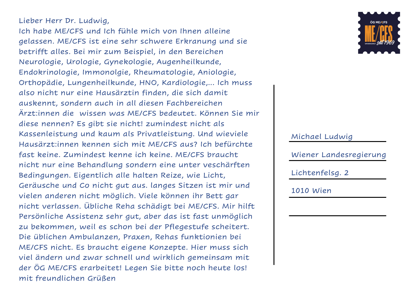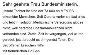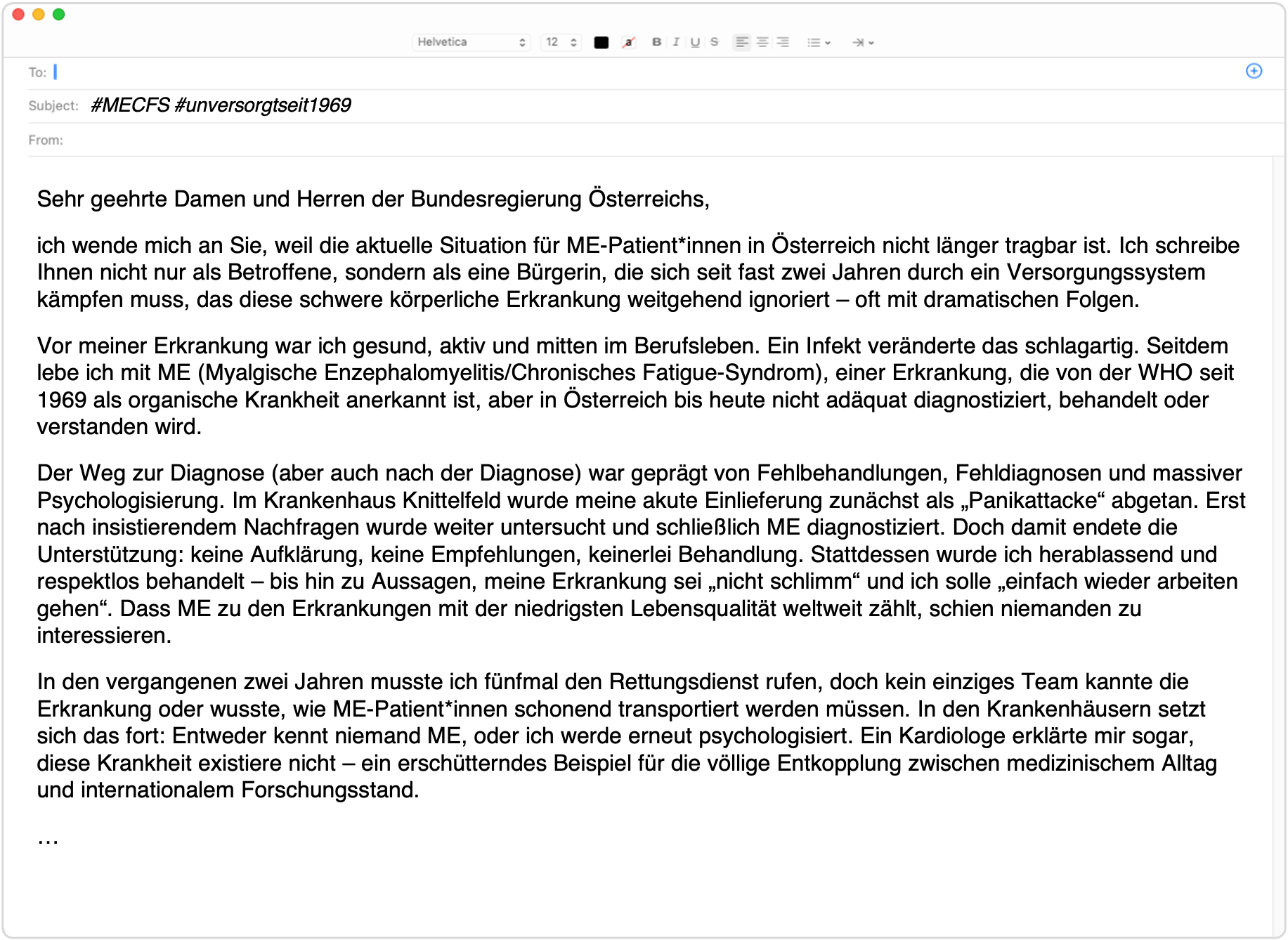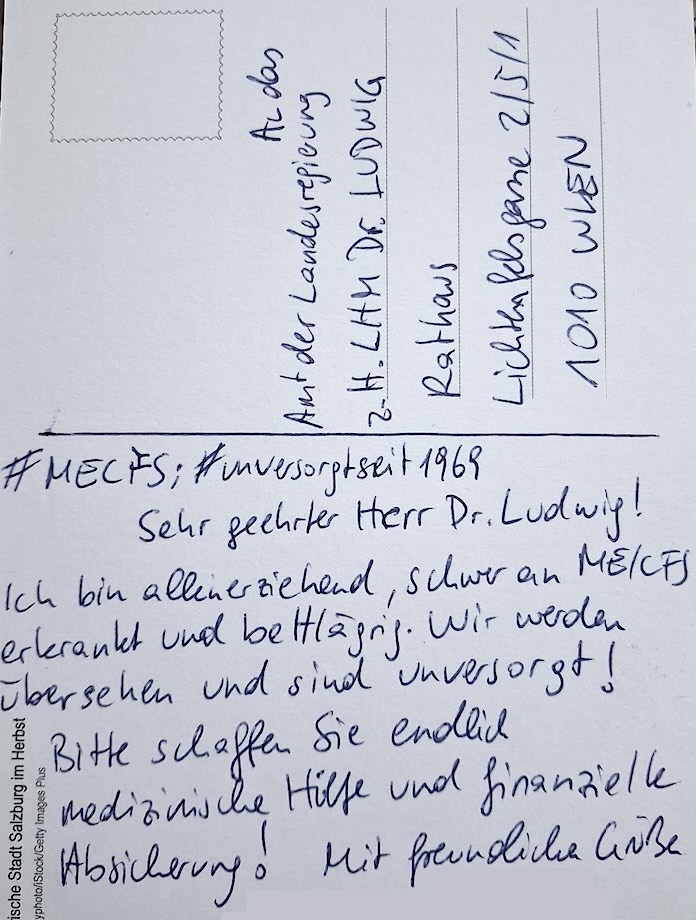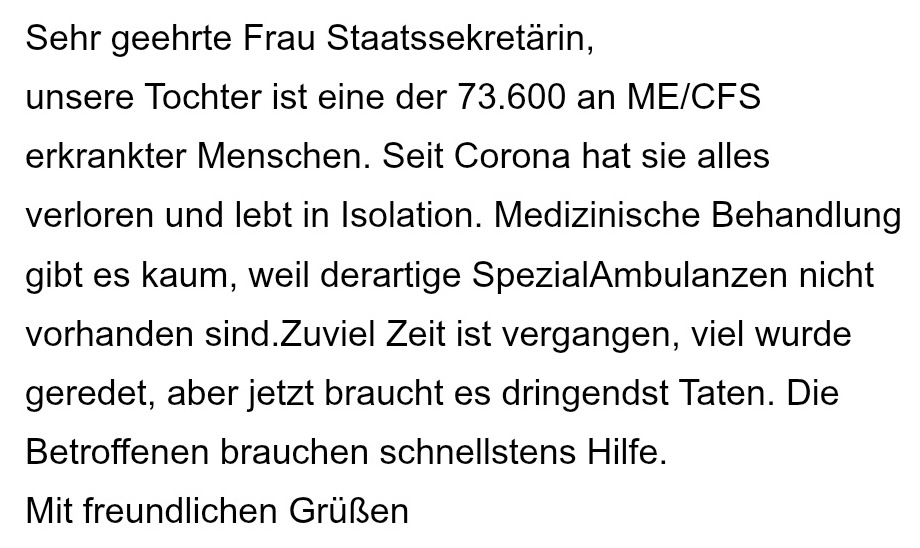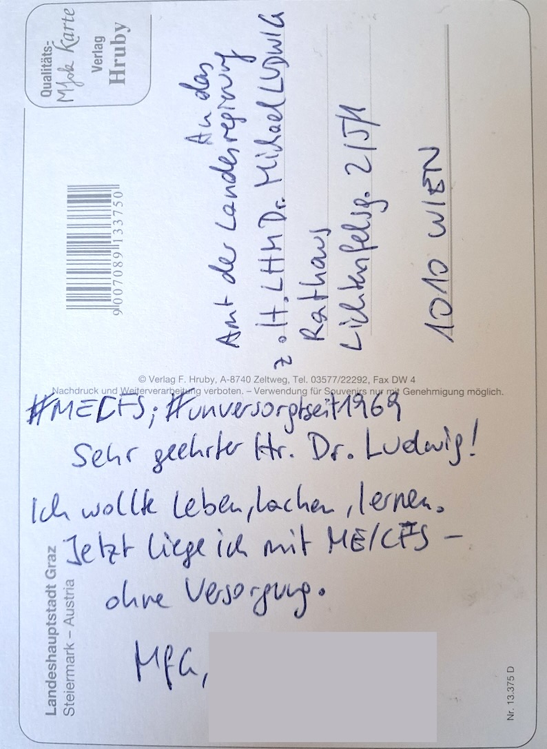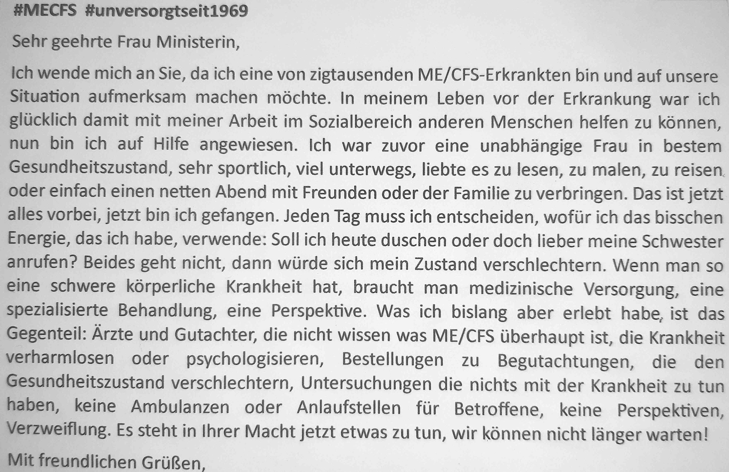 Wir bedanken uns bei allen die ihre Erfahrungsberichte an Politiker:innen sowie an uns geschickt haben um aufzuzeigen wie die Lage der ME/CFS-Betroffenen in Österreich wirklich ist: #unversorgtseit1969.