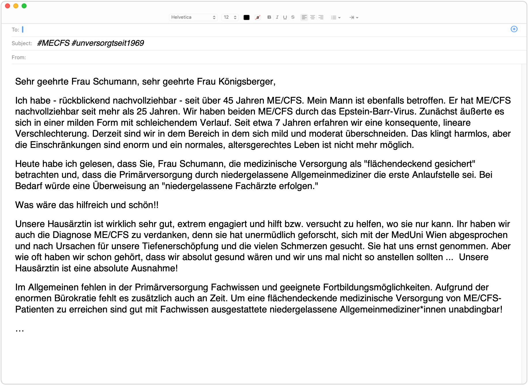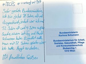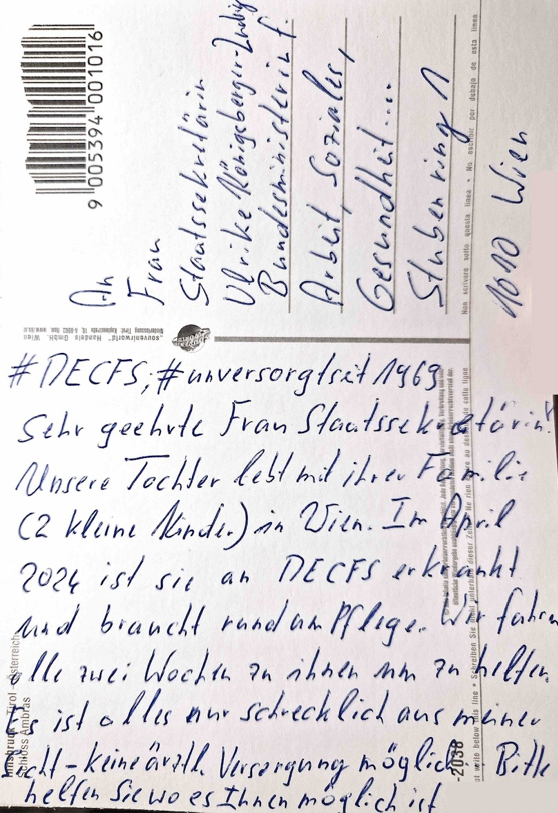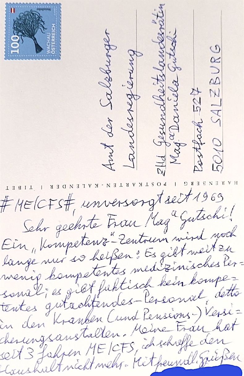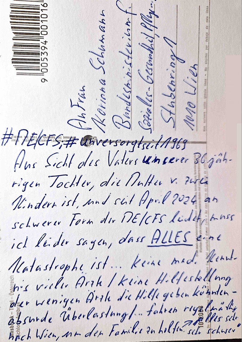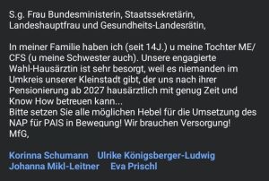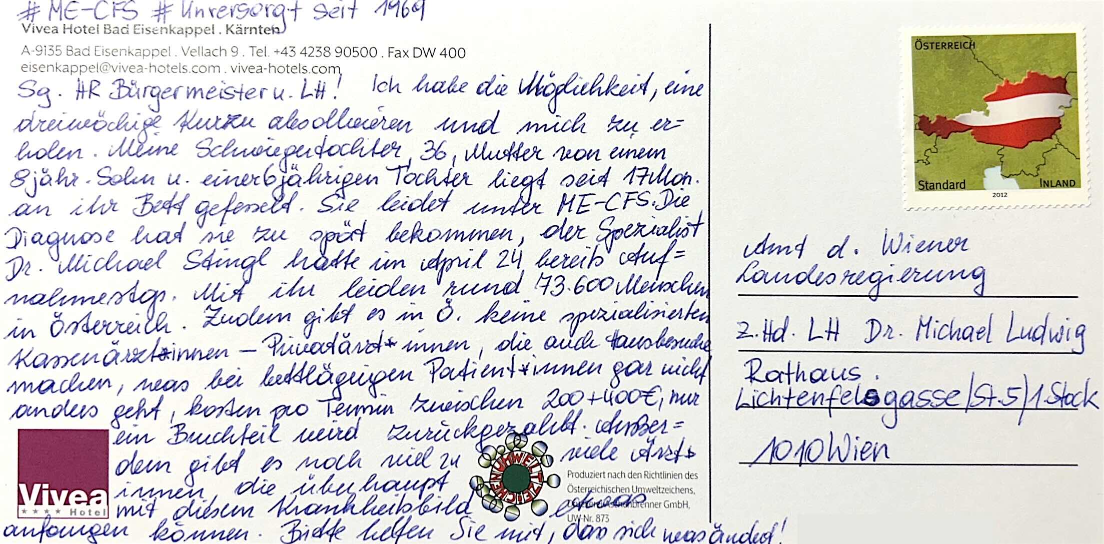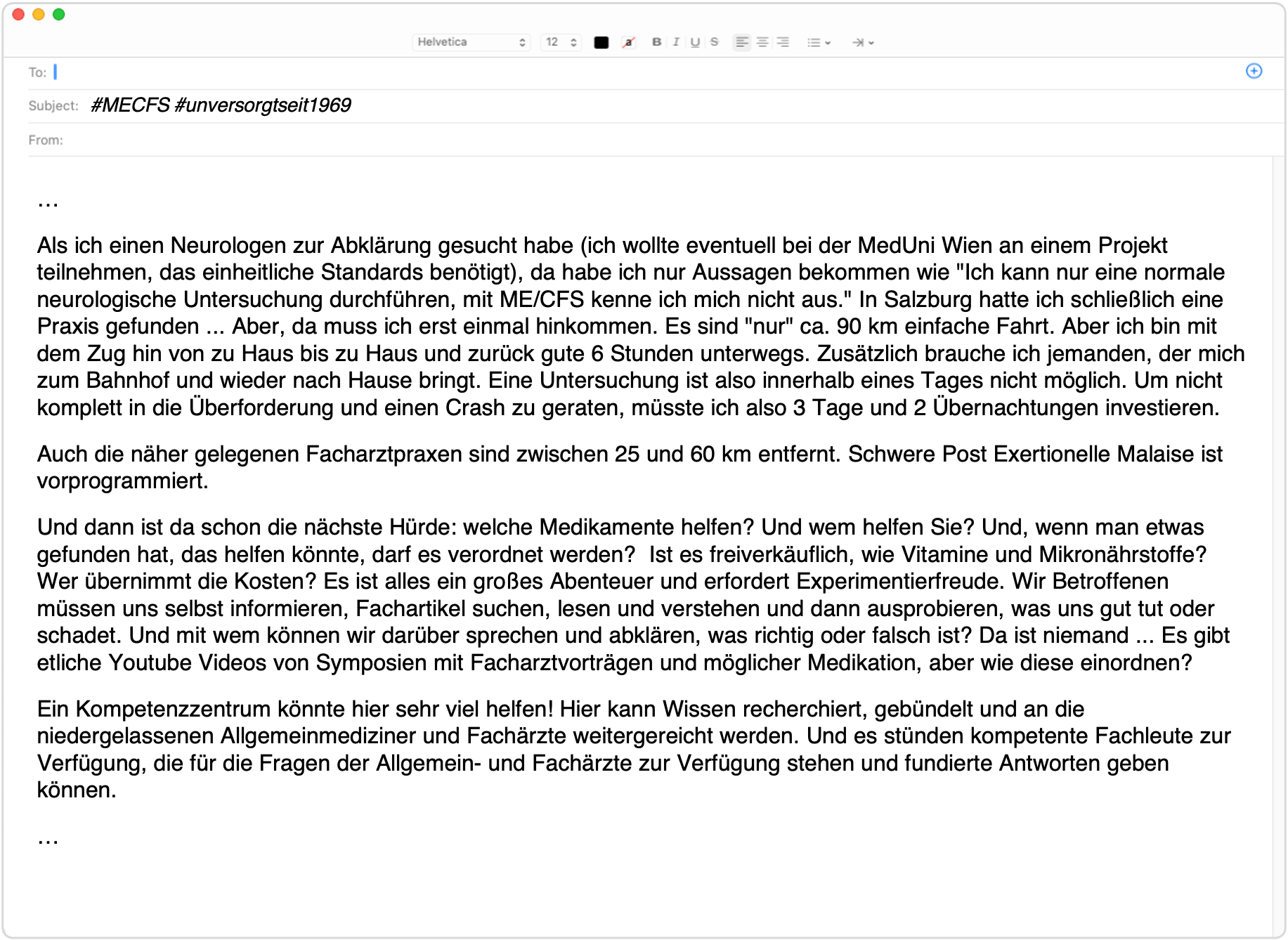 Wir bedanken uns bei allen die ihre Erfahrungsberichte an Politiker:innen sowie an uns geschickt haben um aufzuzeigen wie die Lage der ME/CFS-Betroffenen in Österreich wirklich ist: #unversorgtseit1969.