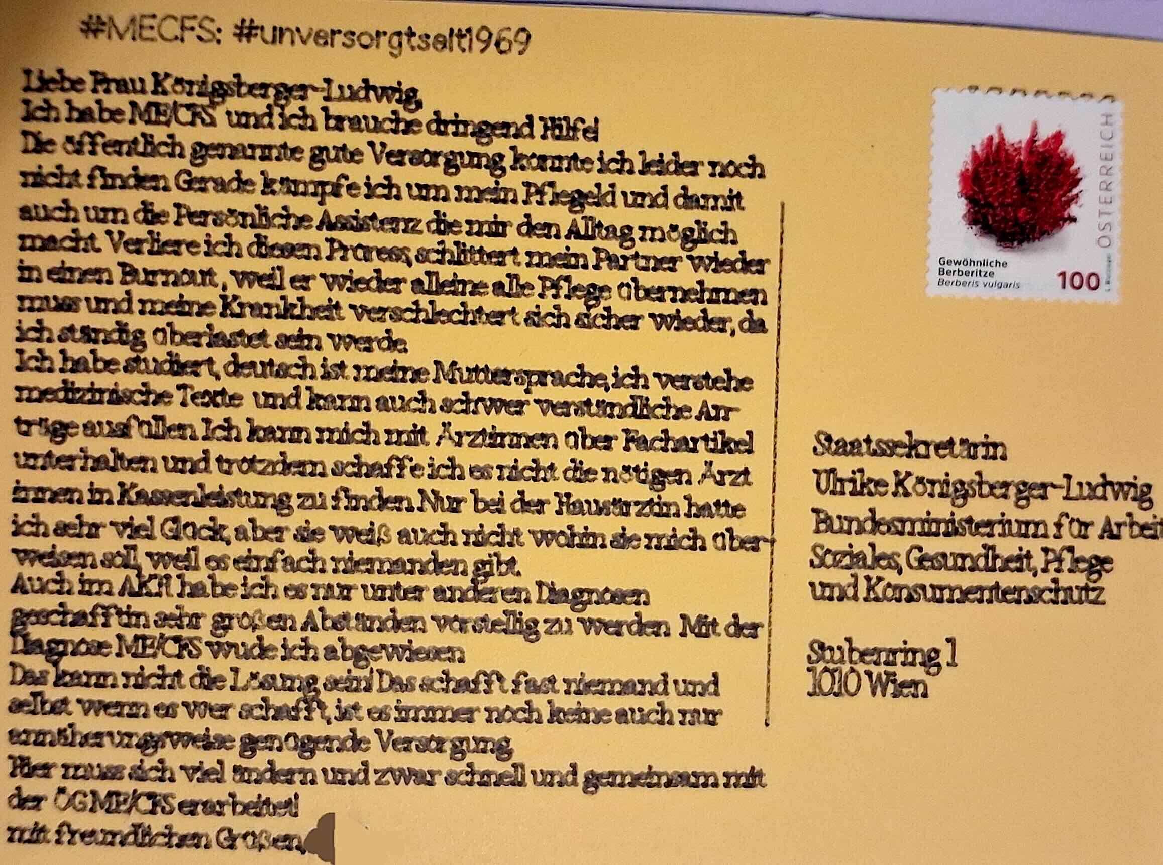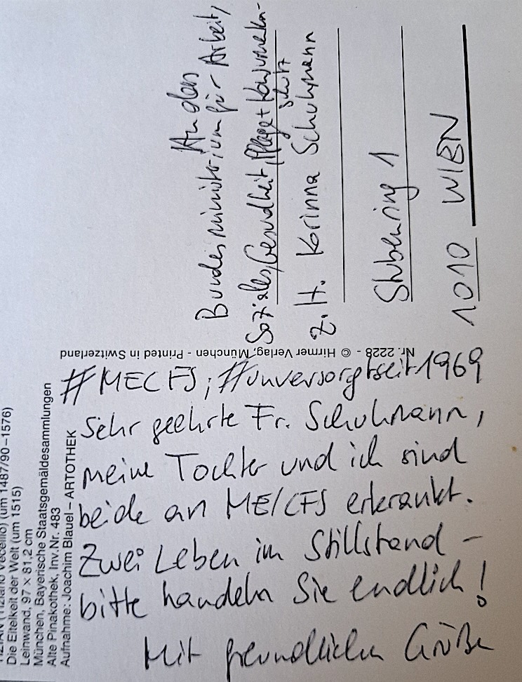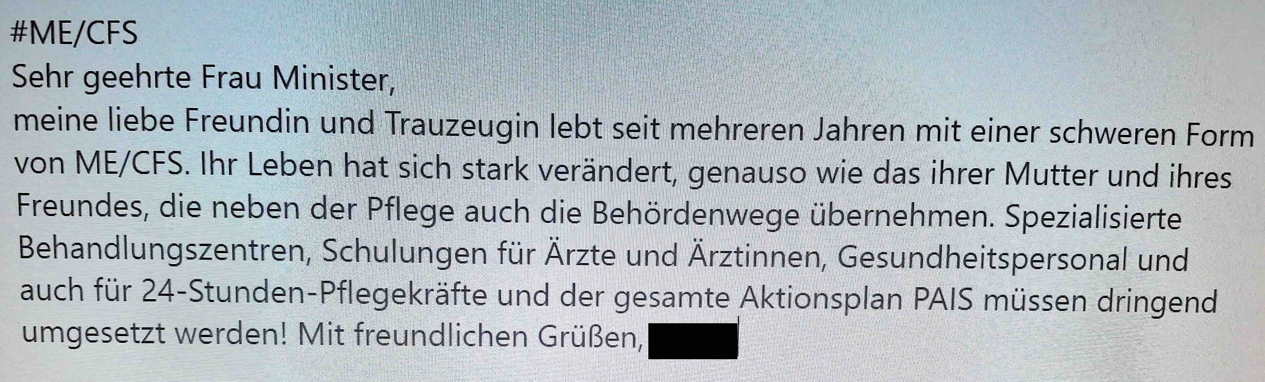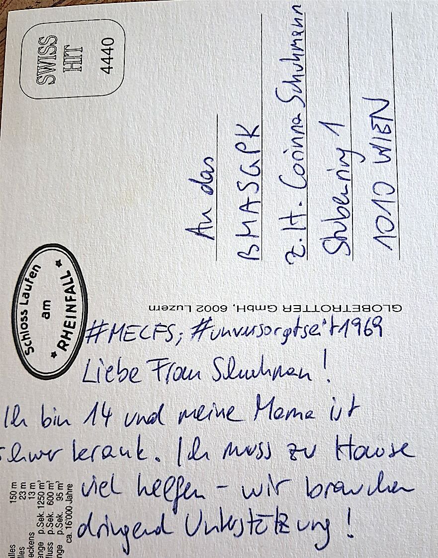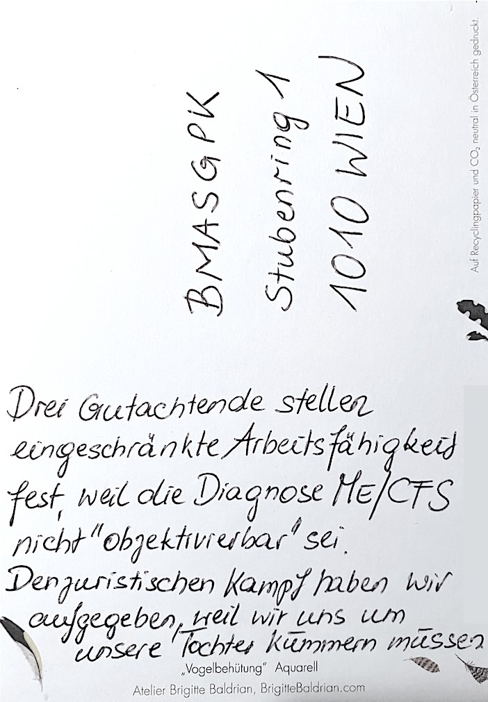 Wir bedanken uns bei allen die ihre Erfahrungsberichte an Politiker:innen sowie an uns geschickt haben um aufzuzeigen wie die Lage der ME/CFS-Betroffenen in Österreich wirklich ist: #unversorgtseit1969.