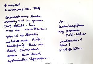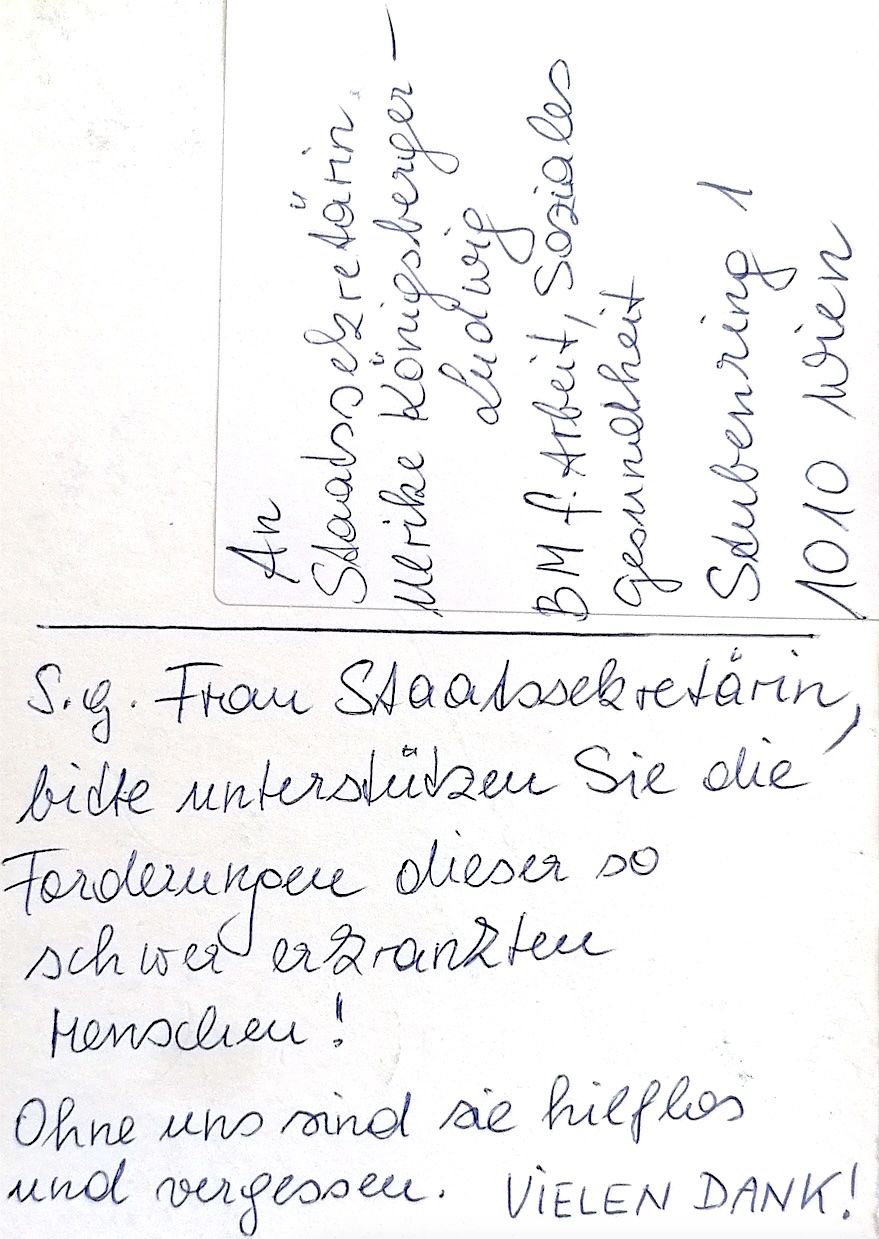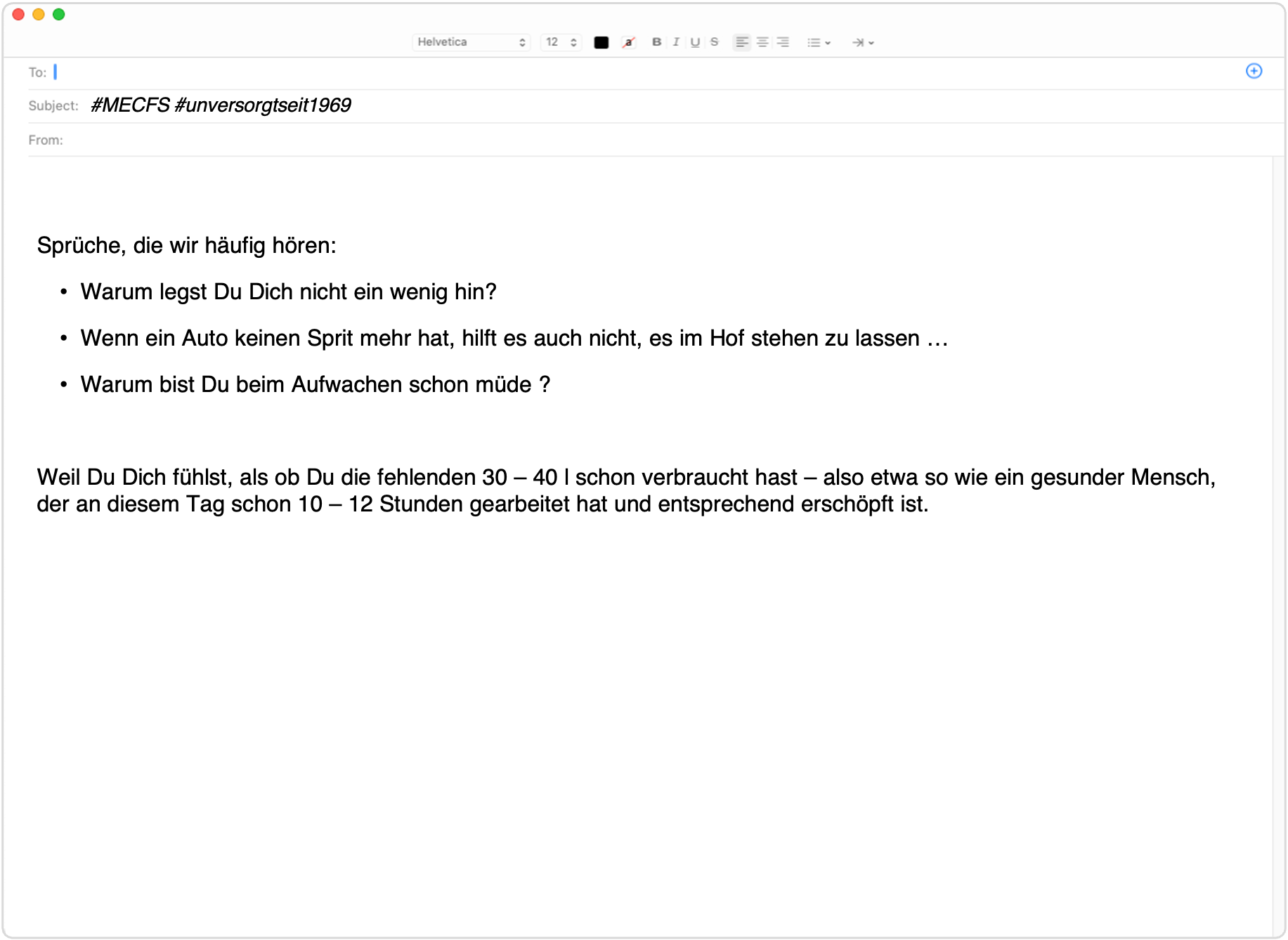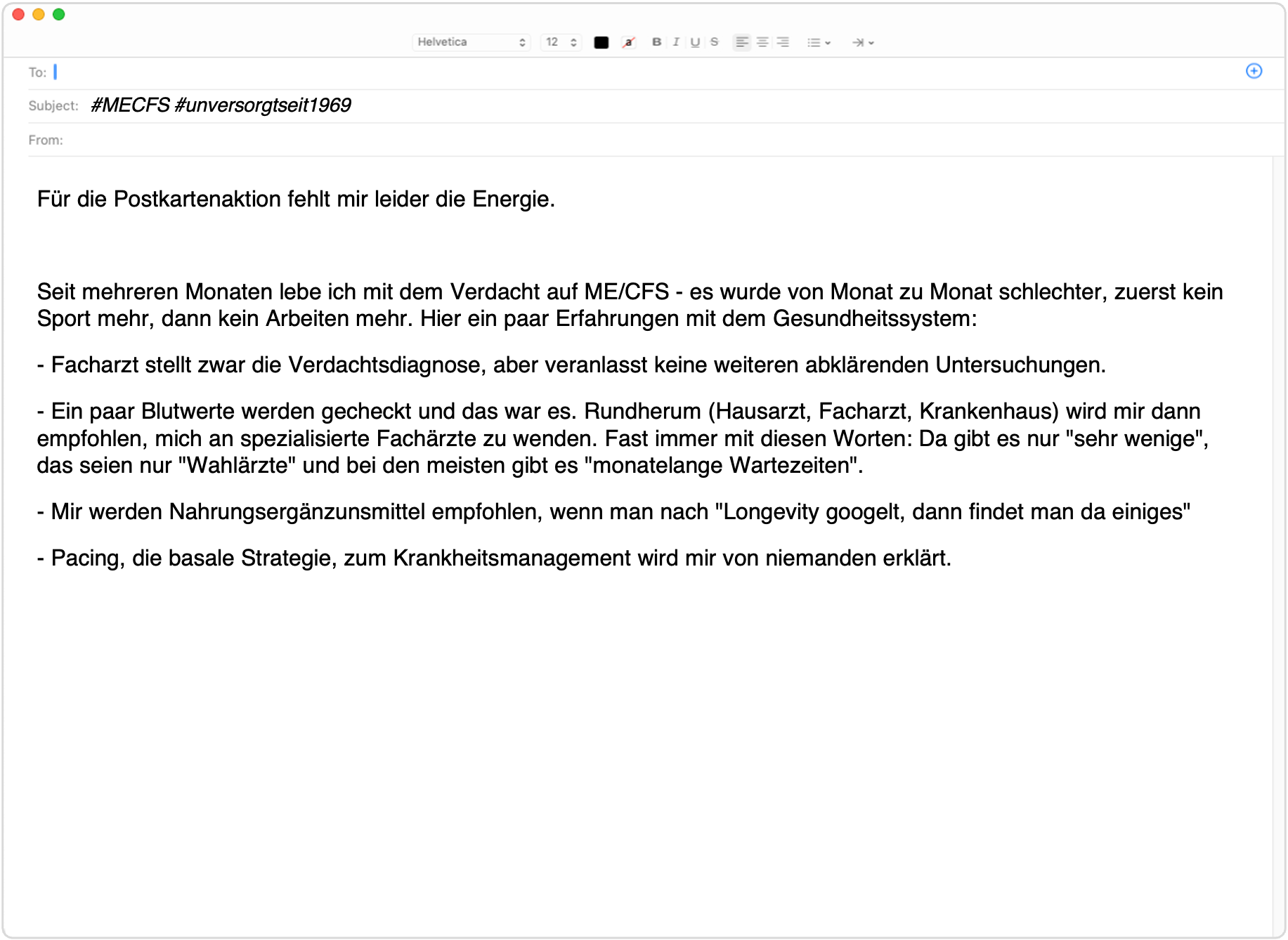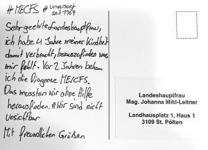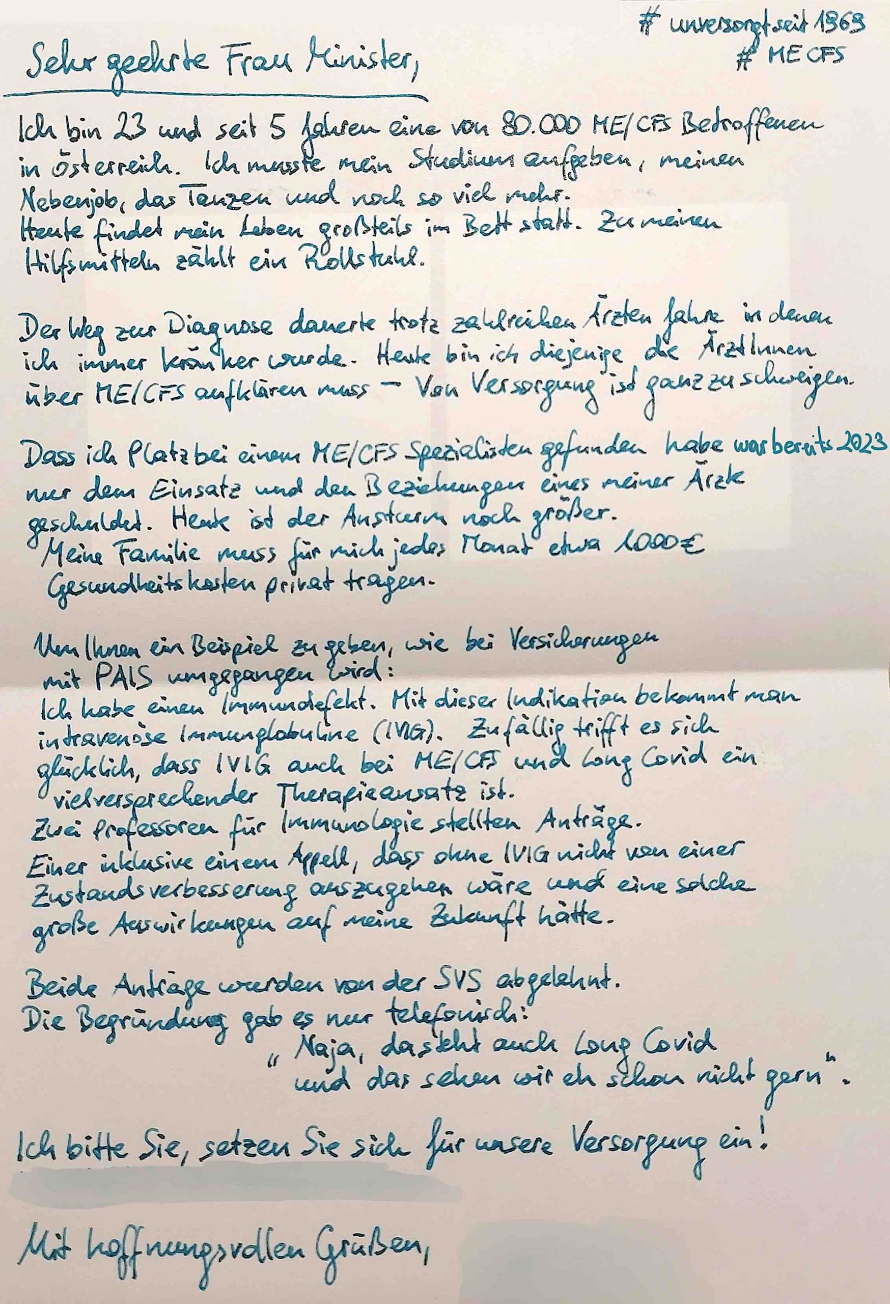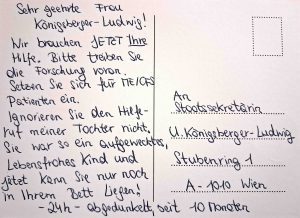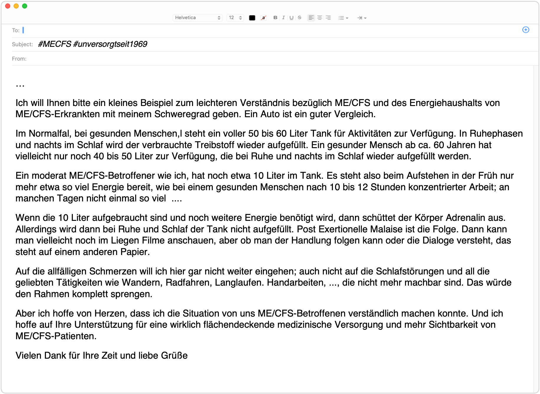 Wir bedanken uns bei allen die ihre Erfahrungsberichte an Politiker:innen sowie an uns geschickt haben um aufzuzeigen wie die Lage der ME/CFS-Betroffenen in Österreich wirklich ist: #unversorgtseit1969.