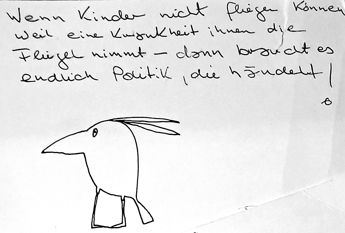 Betroffene und ihre Familien, die aufgrund ihrer schweren Erkrankung am 12. Mai nicht vor Ort sein konnten, wurden durch die Sammlung ihrer Schuhe und Botschaften an unserer Protestaktion beteiligt und ihre Schicksale so sichtbar gemacht.