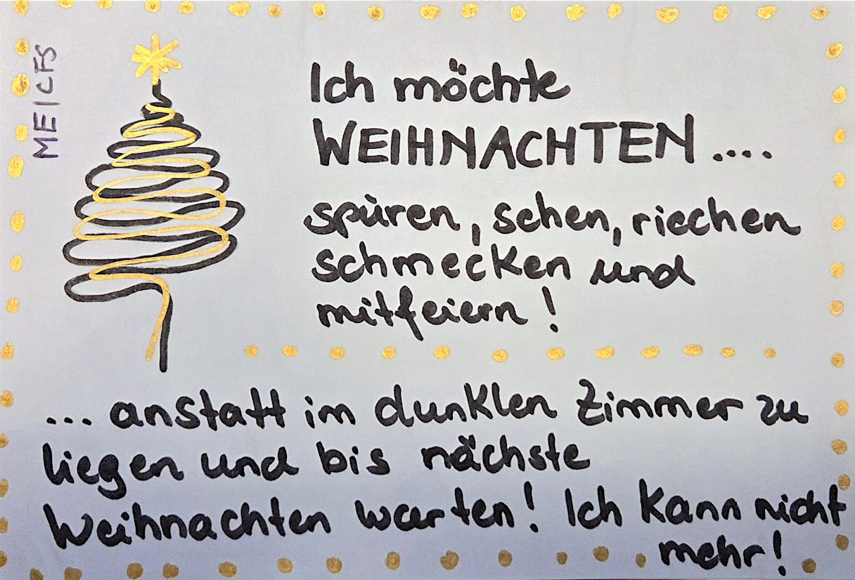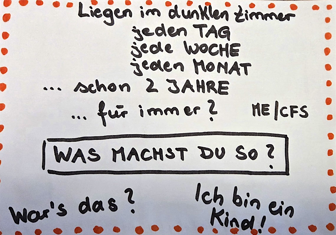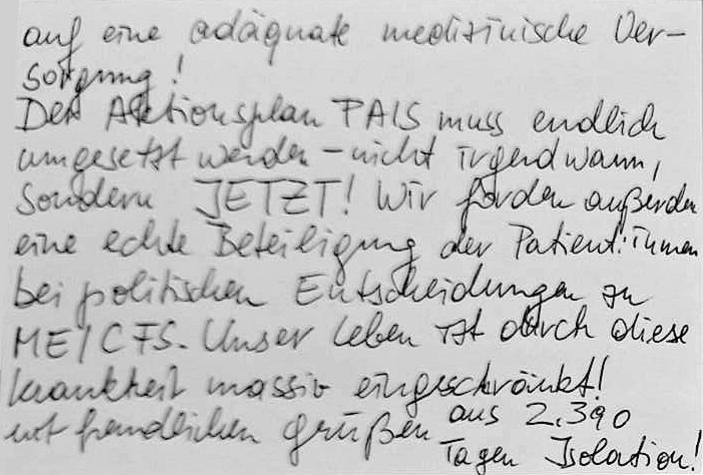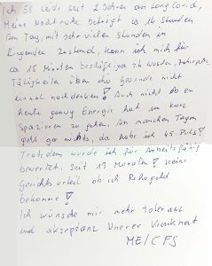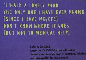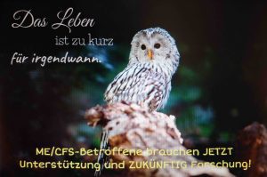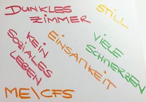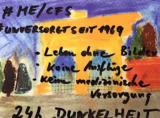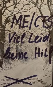 Und dabei wissen wir: Viele ME/CFS-Betroffene können auf Grund ihres Gesundheitszustands bei solchen Aktionen garnicht teilnehmen. Bei schwer Betroffenen können bereits einfache Aktivitäten wie Duschen, Zähneputzen oder aus dem Bett aufstehen, zu einer schweren Zustandsverschlechterung führen. Sehr schwer Betroffene sind vollständig ans Bett gebunden und die Reizempfindlichkeit bedeutet oft, dass sie isoliert in absoluter Stille und Dunkelheit leben müssen um eine Zustandsverschlechterung zu vermeiden.