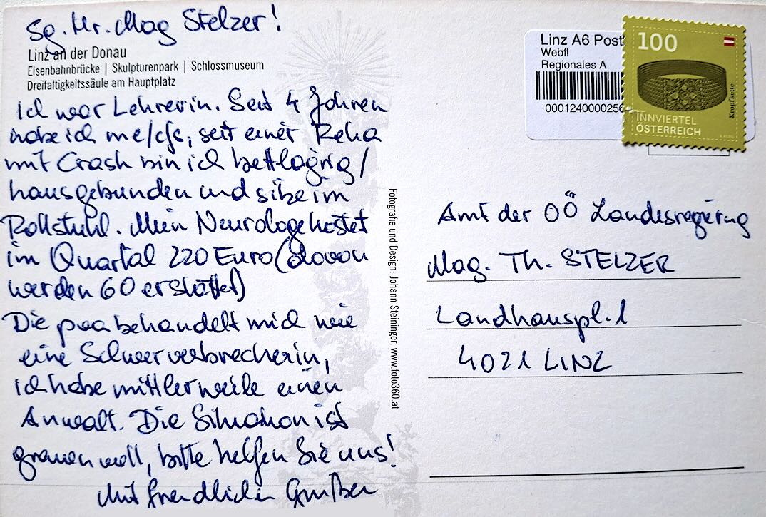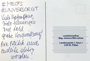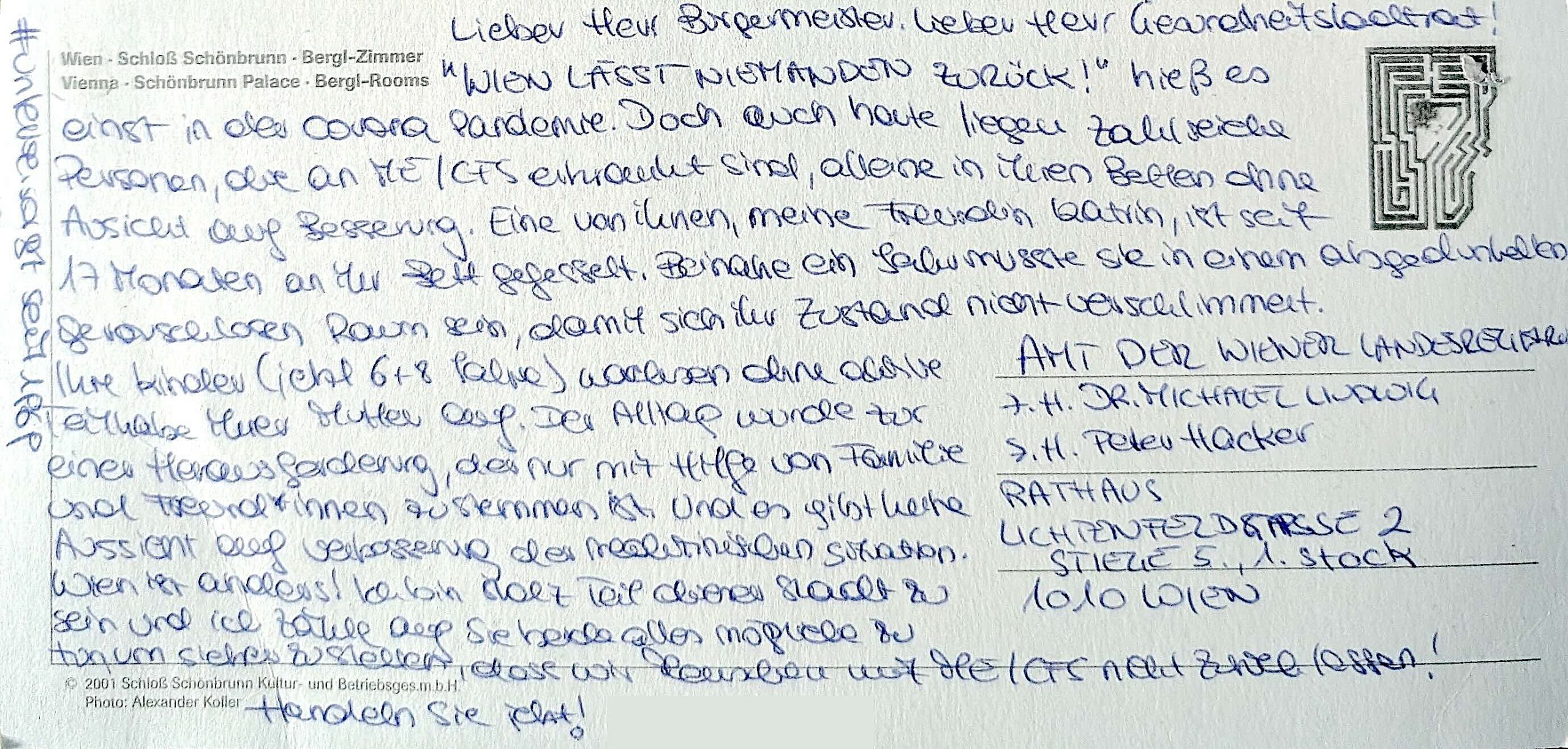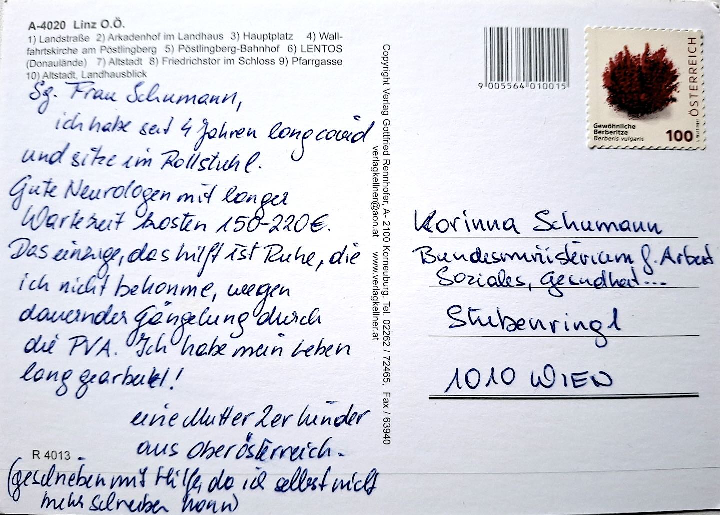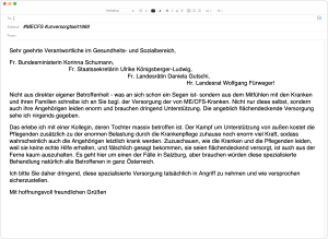 “Es gibt weder eine Anlaufstelle, noch annähernd eine Ambulanz, die bettlägerige Schwer- und Schwerstbetroffene versorgen kann. Im Gegenteil: ME/CFS-Betroffene werden in Ambulanzen sogar abgewiesen – für sie fühlt man sich nirgends zuständig”, fasst Astrid Hainzl in ihrer Rede zusammen.