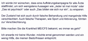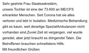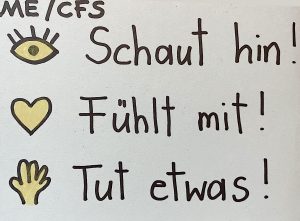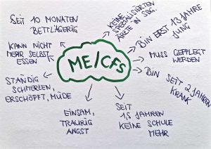 erklärt Sabine Hermisson, die die Aktion moderierte und selbst Mutter einer sehr schwer von ME/CFS betroffenen Tochter ist.