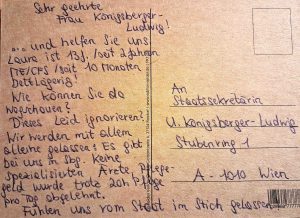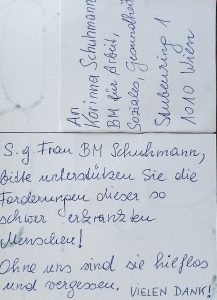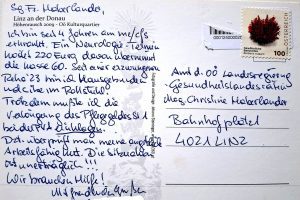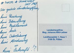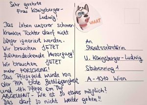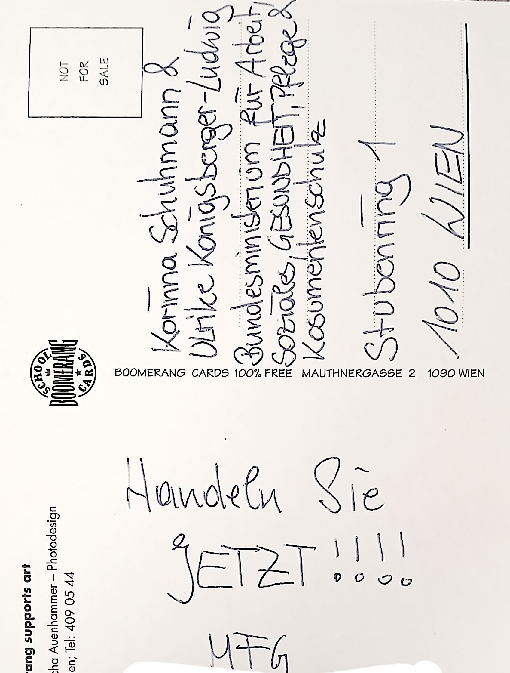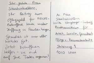 Bei der Protestaktion gab es ein Programm aus Redebeiträgen. Moderiert wurden diese von Sabine Herminsson, Wissenschaftlerin und Angehörige. Es sprachen unsere stv. Obfrau Astrid Hainzl, die Autorin und Filmemacherin Barbara Kaufmann, der bildende Künstler und Angehöriger Matthias Mollner und die Präsidentin der IG-Pflege Birgit Meinhard-Schiebel.