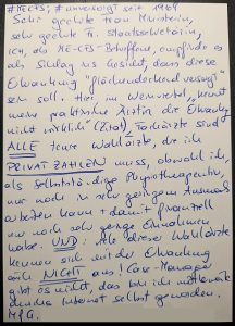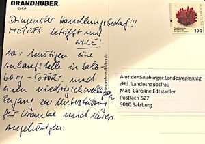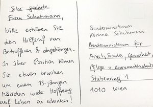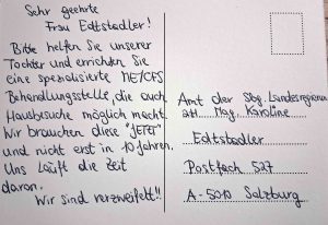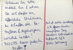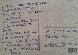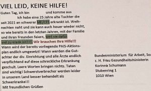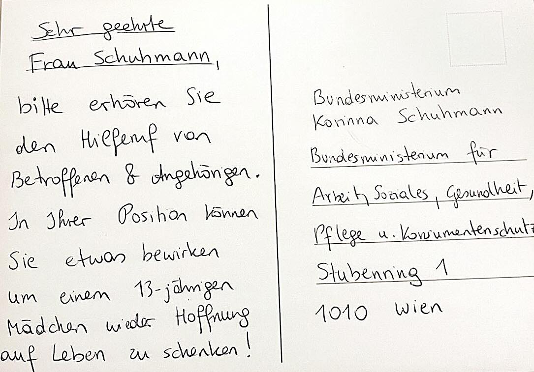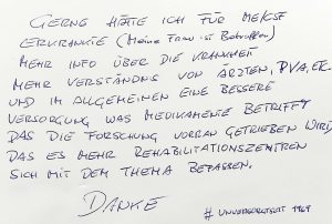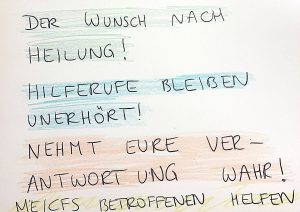 Auf unserer Protestwand wollen wir Erfahrungsberichte von Betroffenen und Angehörigen sichtbar machen. Die Protestwand soll zeigen, wie es den Menschen wirklich geht, die laut Ministerium “flächendeckend versorgt” sind und für die keine spezialisierten Behandlungsstellen geschaffen werden.