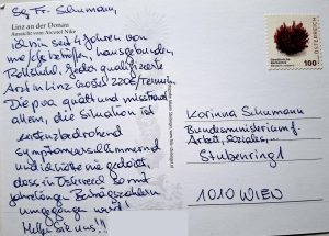 Ab 16 Uhr gab es ein Programm und Redebeiträge aus den Bereichen Aktivismus, Journalismus, Kunst und Kultur: Moderiert von Barabara Kaufmann, gab es Beiträge von unserer stv. Obfrau Astrid Hainzl, Eja Kapeller, Matthias Mollner und Heidrun Jannach.