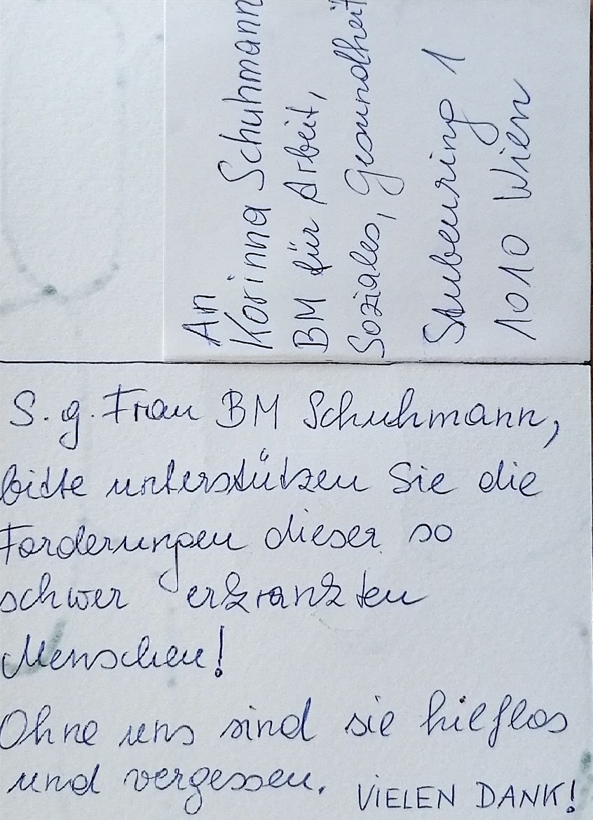 Ab 15 Uhr gab es ein Programm und Redebeiträge aus den Bereichen Aktivismus, Kunst und Kultur: Begrüßung durch die stv. Obfrau Astrid Hainzl und Beiträge von Barbara Kaufmann (Autorin, Filmemacherin), Matthias Mollner (bildender Künstler, Angehöriger), Birgit Meinhard-Schiebel (Präsidentin der IG-Pflege).