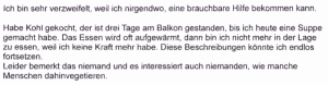 „Sie sind doch noch so jung,“ sagt [die Ärztin] zu mir. „Warum machen Sie nichts aus ihrem Leben?“